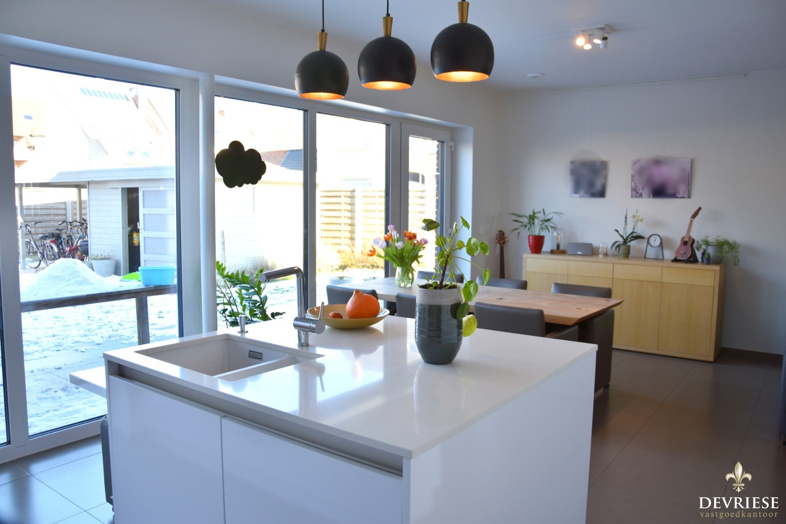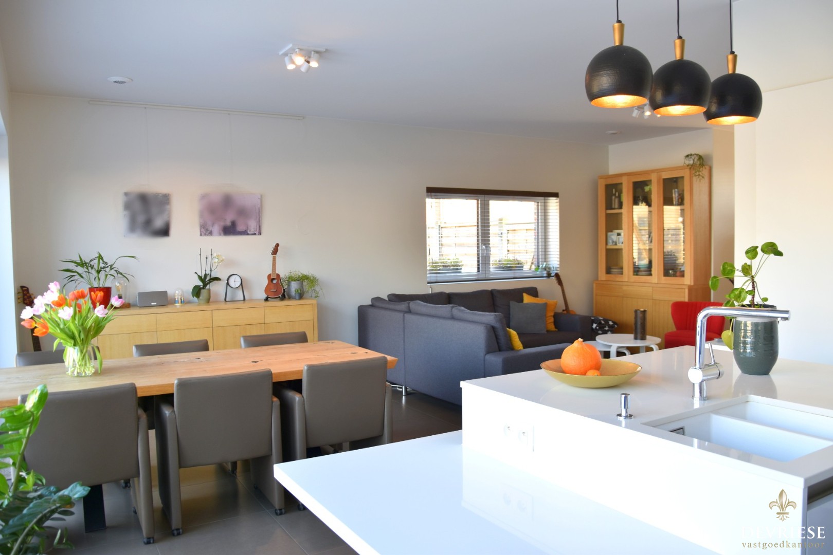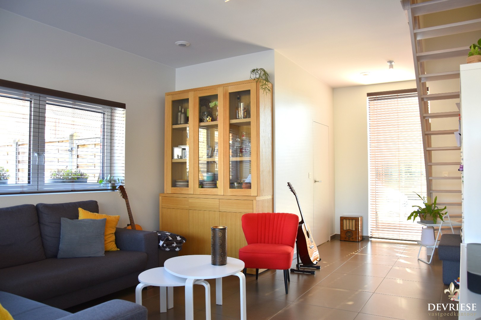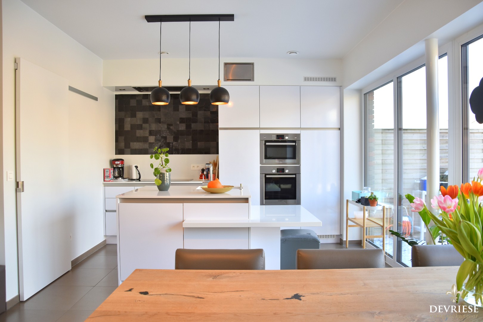 U komt binnen in de aparte inkomhal met gastentoilet. Daarnaast is er rechtstreekse toegang tot de gezellige leefruimte met open, moderne ingerichte keuken. Hier geniet je heel wat lichtinval door ... de grote raampartijen. Zo is er ook vol zicht op de tuin.