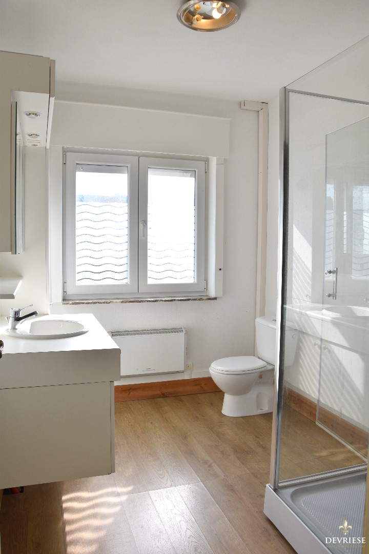 Op de eerste verdieping vinden we reeds 2 volwaardige slaapkamers. De badkamer is ingericht met een douchecel, lavabomeubel en een tweede toilet.