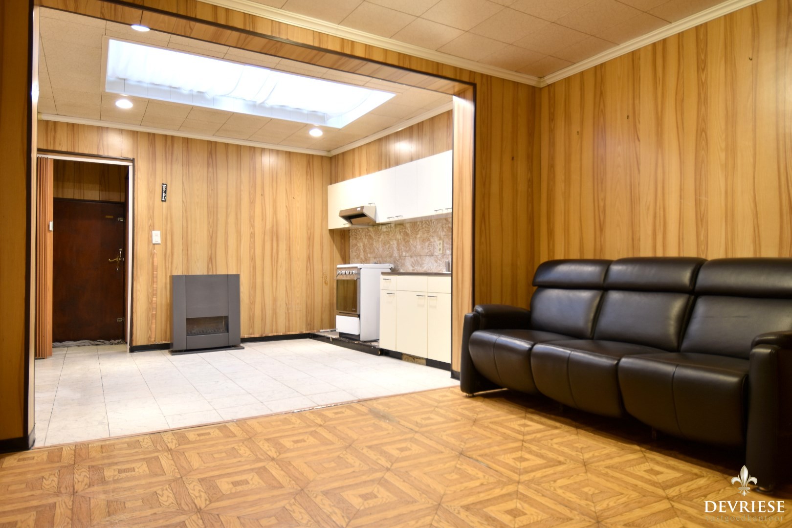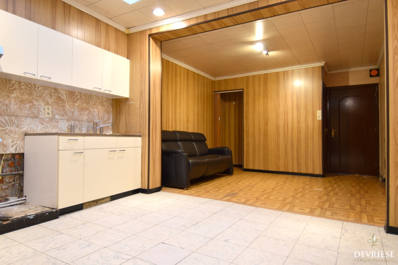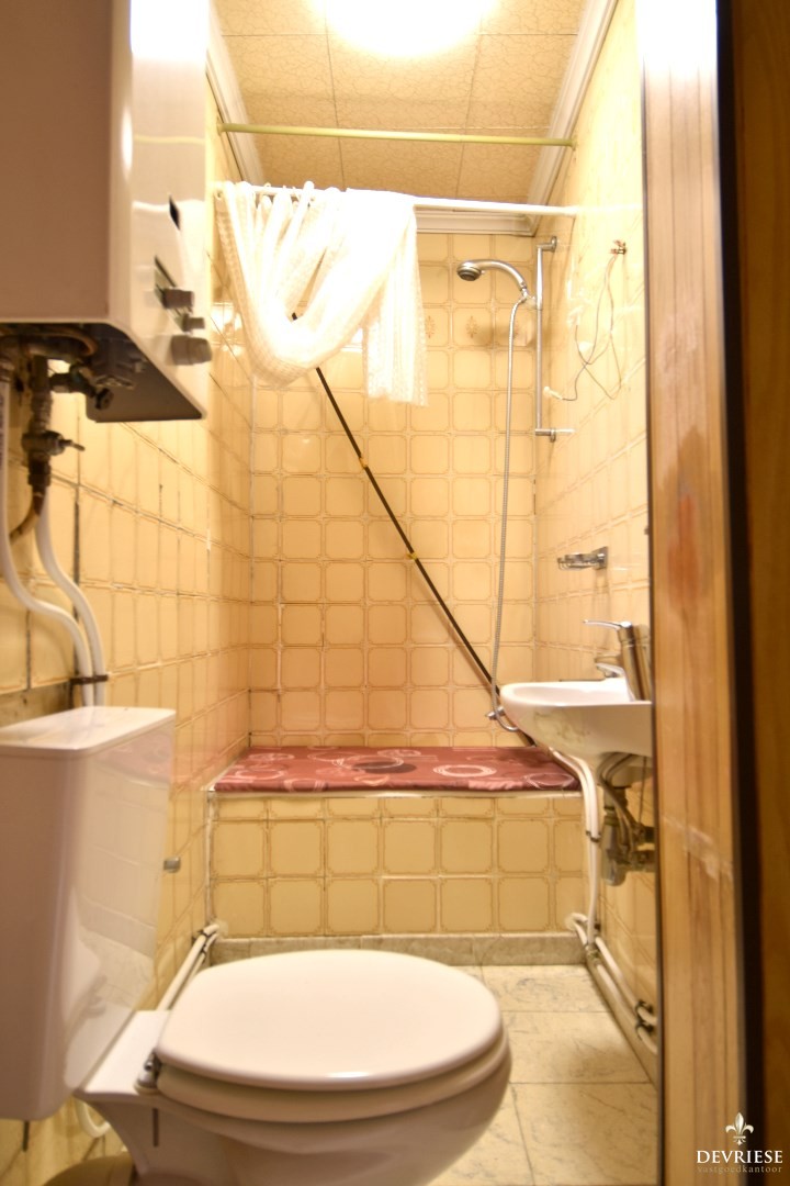 Vervolgens komt u in de leefruimte met een geïntegreerd keukengedeelte. Achteraan de woning bevindt zich de badkamer, uitgerust met een toilet en douche.