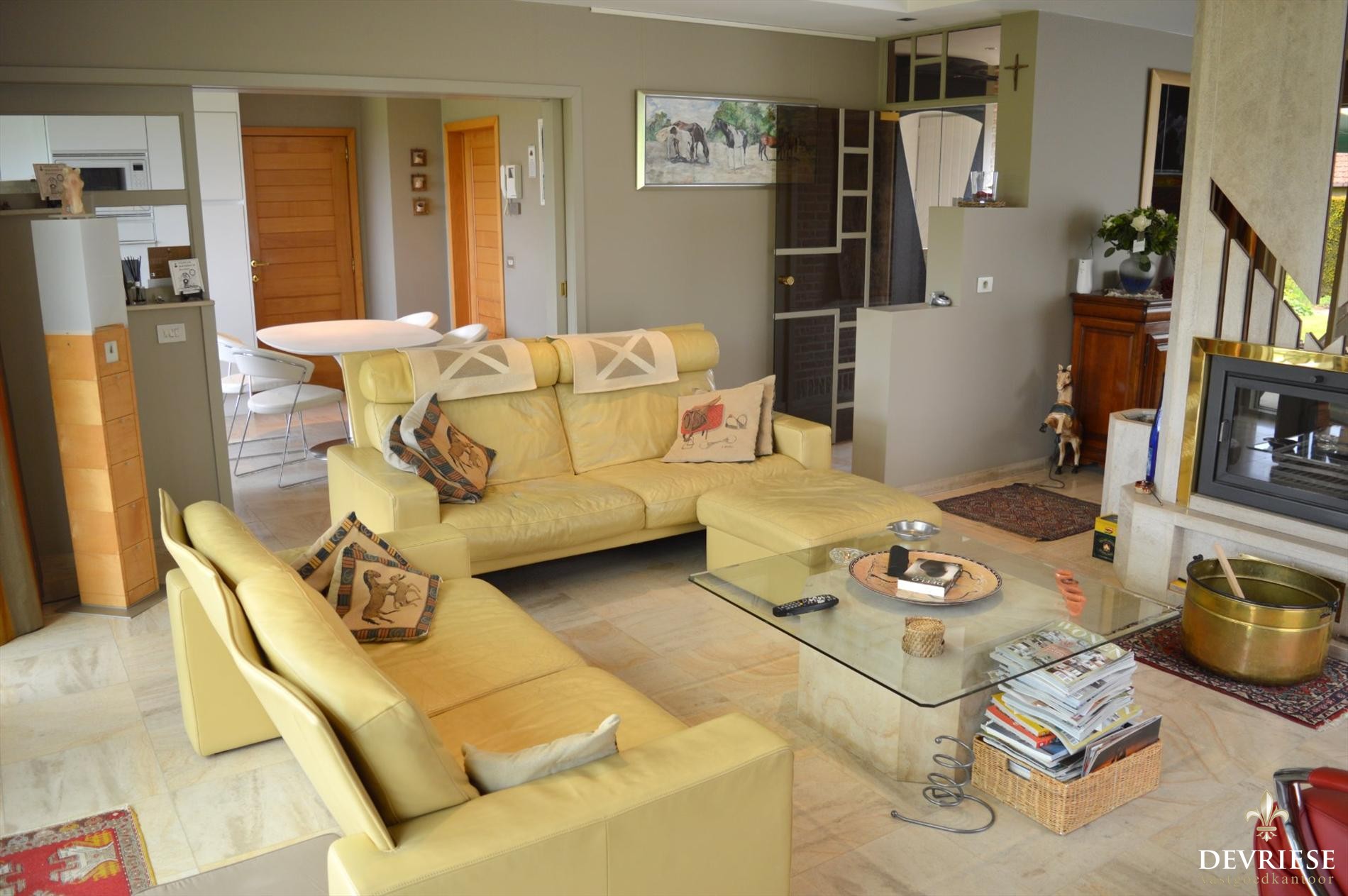 Een ruime leefruimte met zicht op de tuin en voorzien van een inbouwhaard die ook in de winter voor de nodige sfeer en gezelligheid zorgt. Aansluitend de kwalitatieve leefkeuken met heel wat lichtinval en de praktische berging voorzien van koelcel.