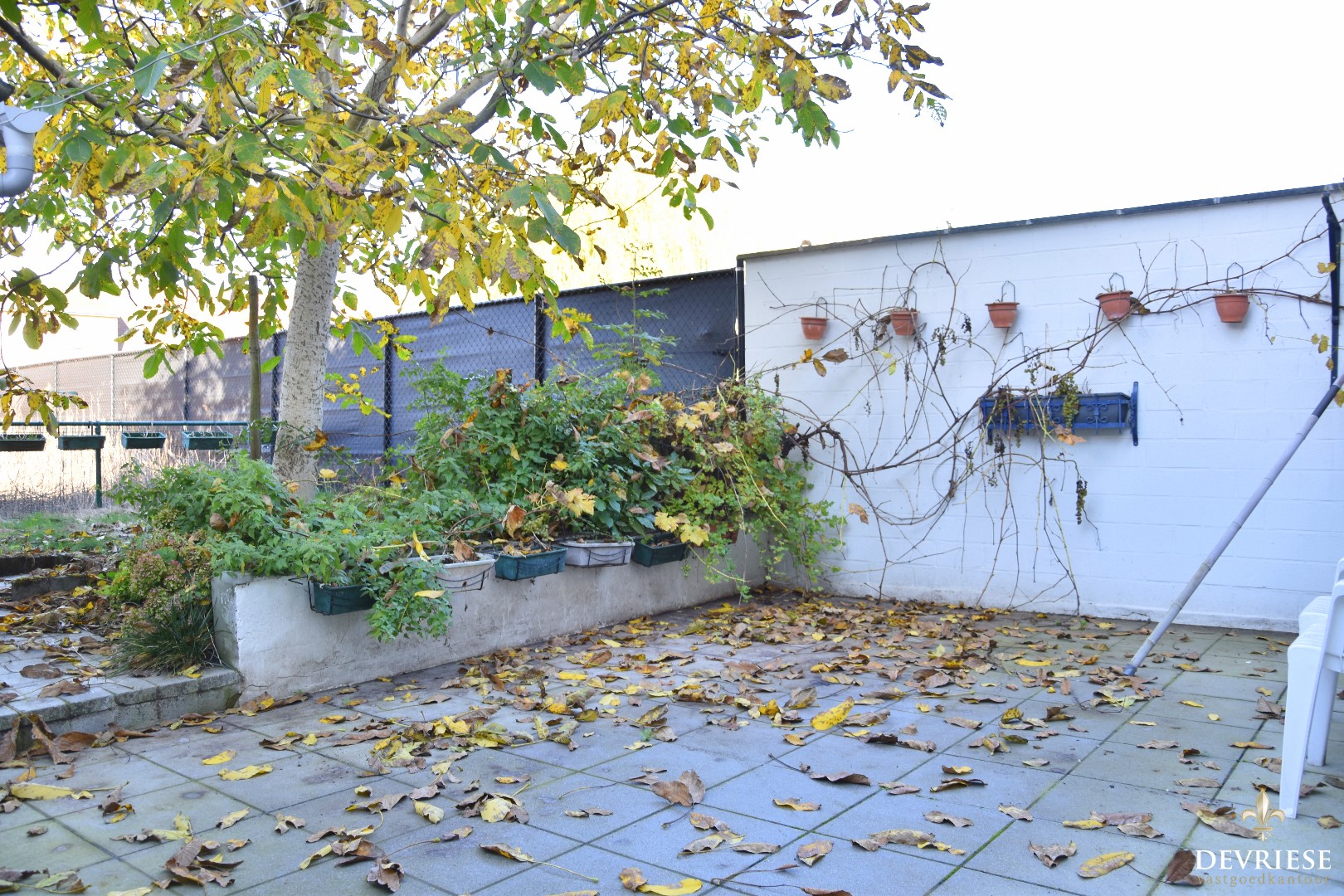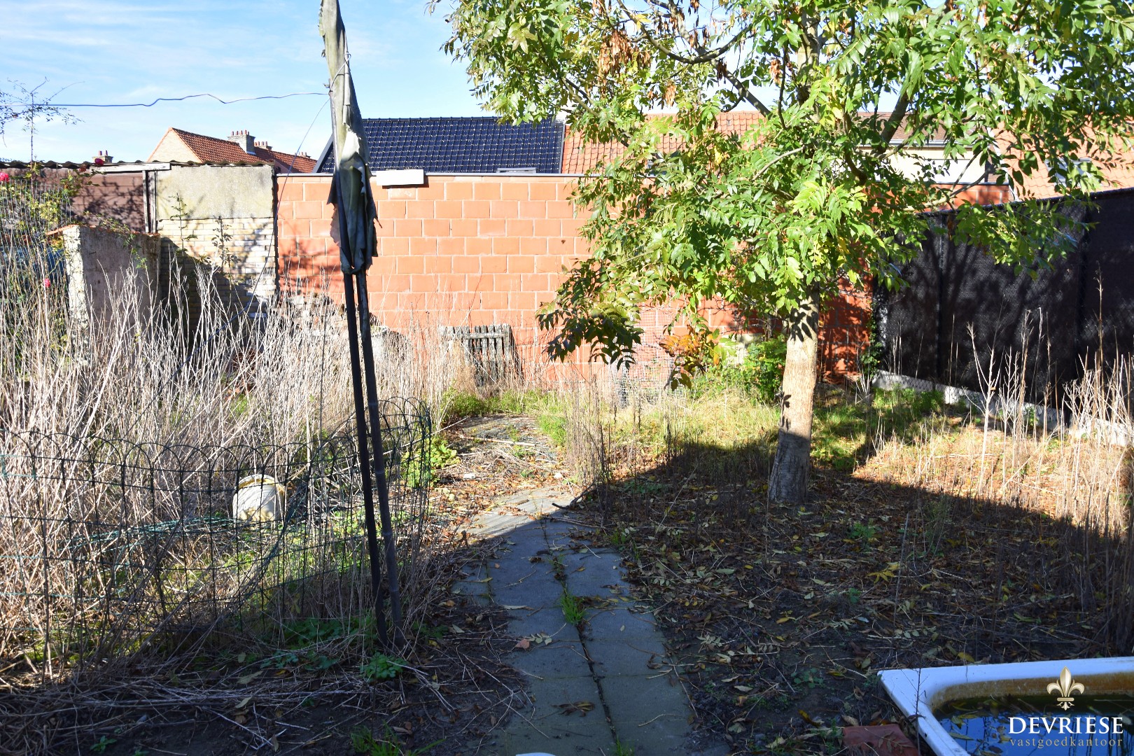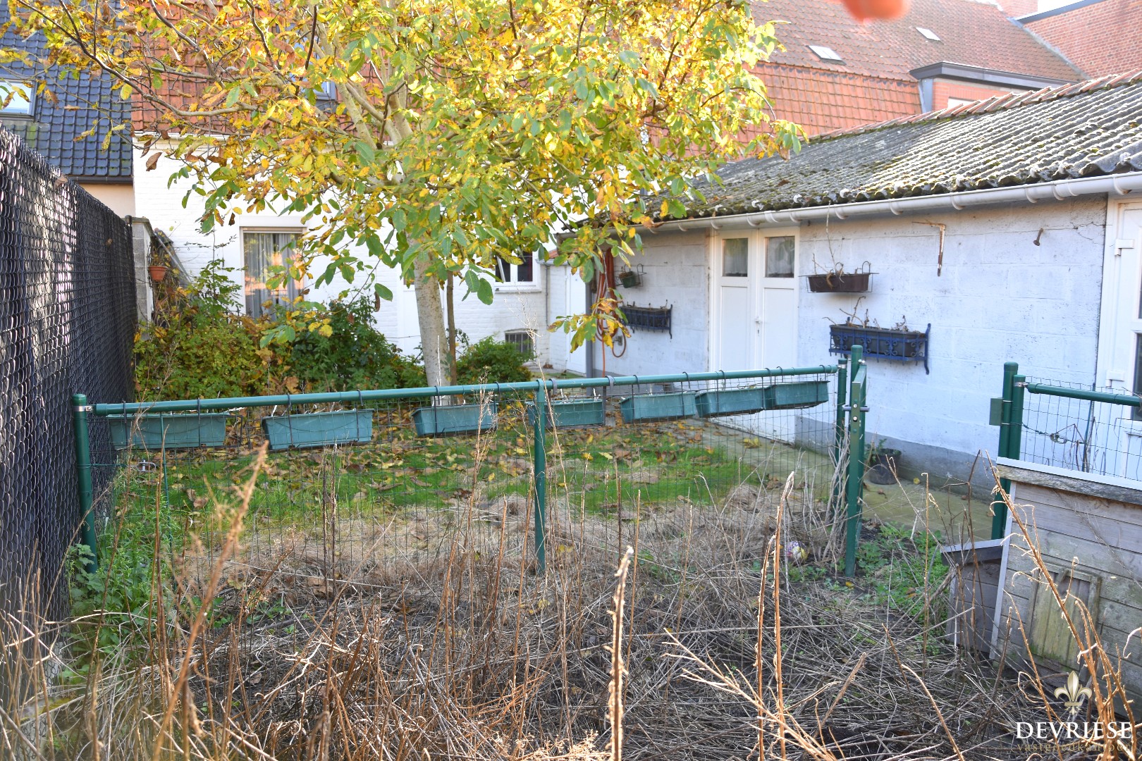 Vanuit de keuken is er toegang tot de ruime achtertuin, waar het gezellig vertoeven is.
