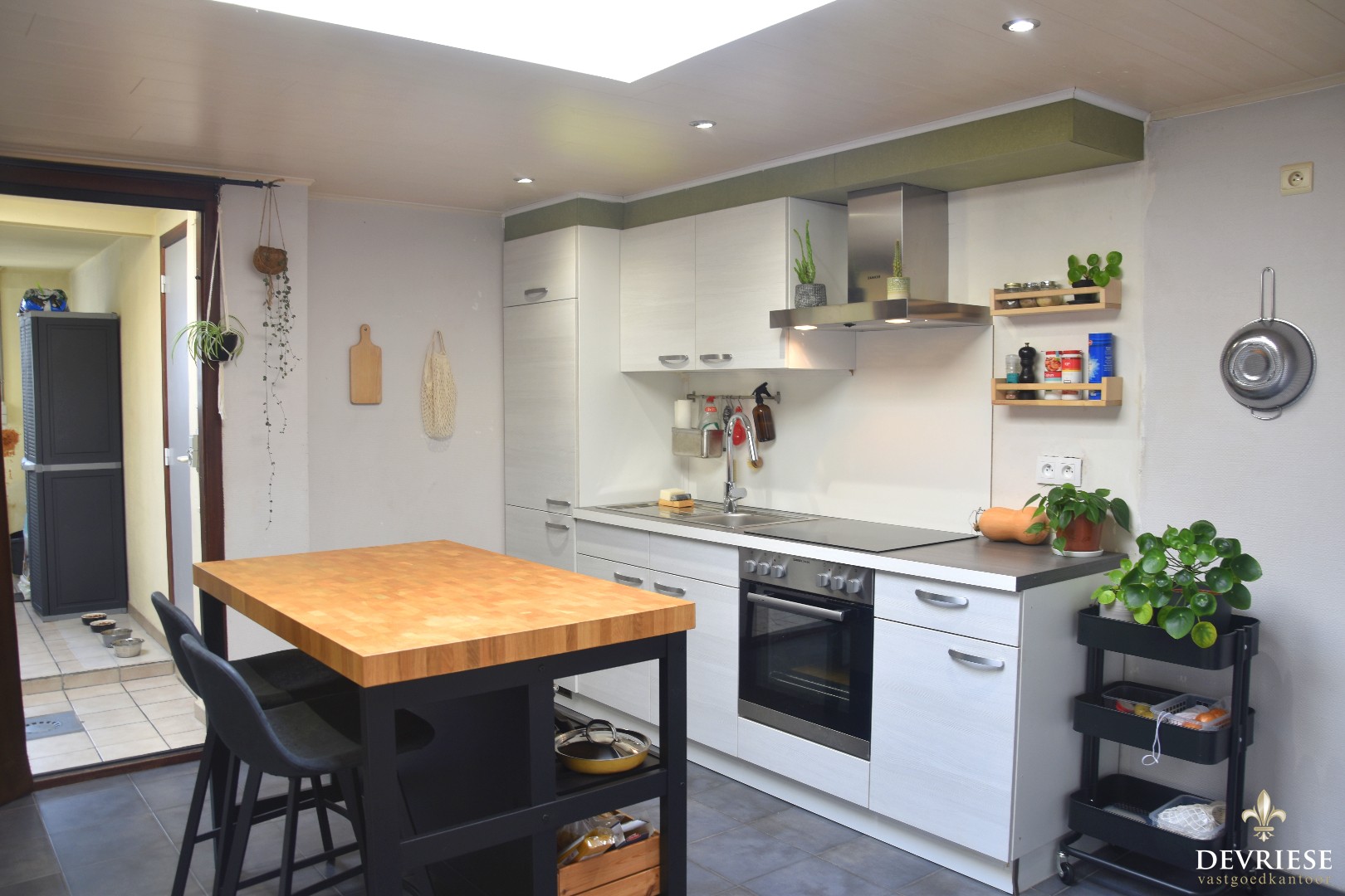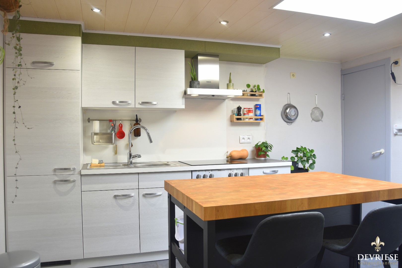 Uitnodigende inkomhal met toegang tot de super knusse leefruimte bestaande uit salon -en eetgedeelte. De open keuken is reeds volledig ingericht, met een keukeneiland dat voldoende werkruimte voorziet.