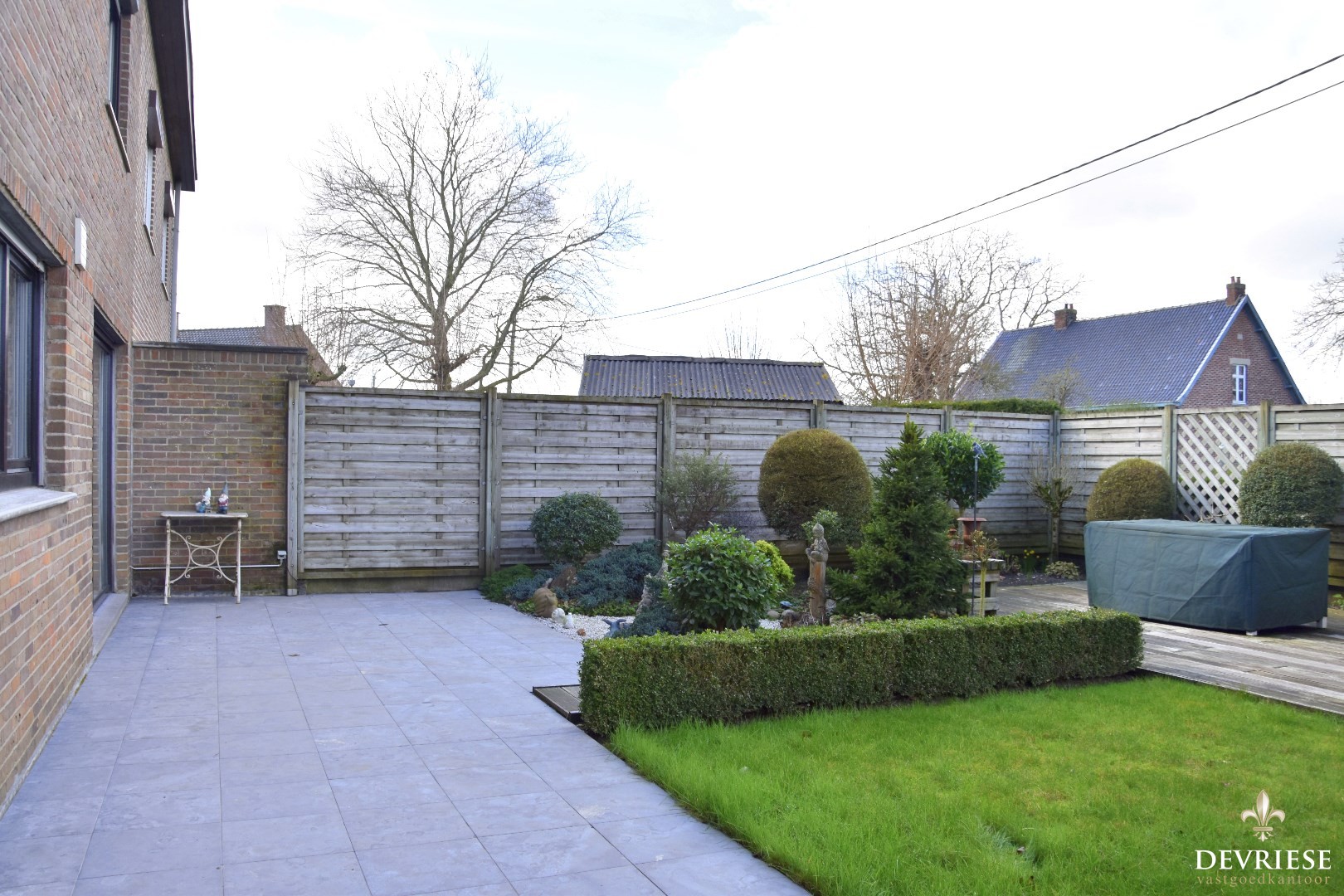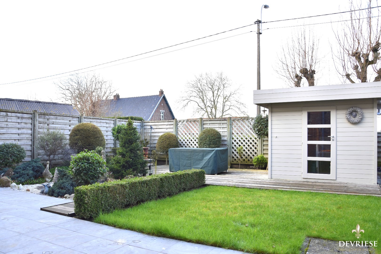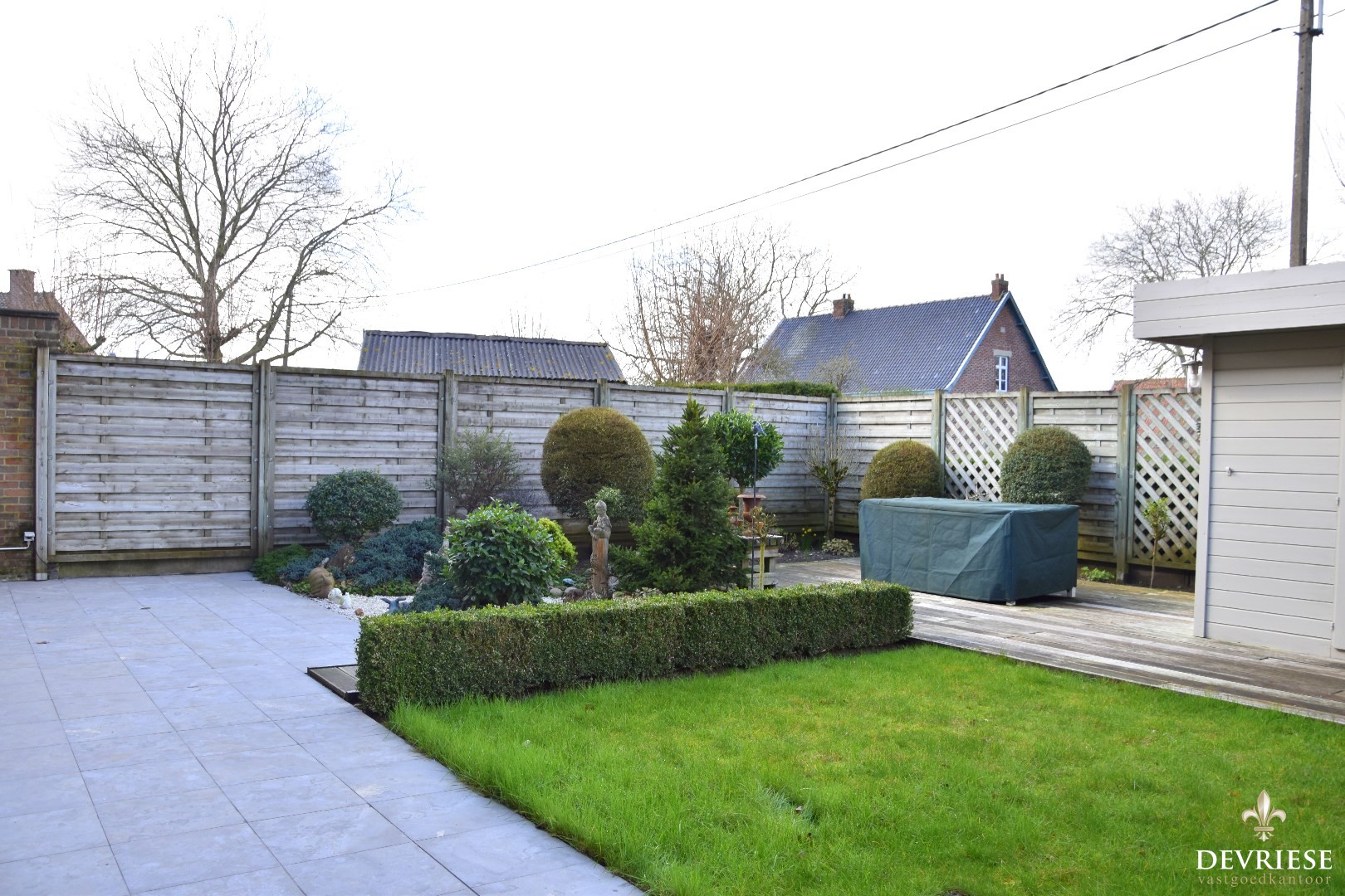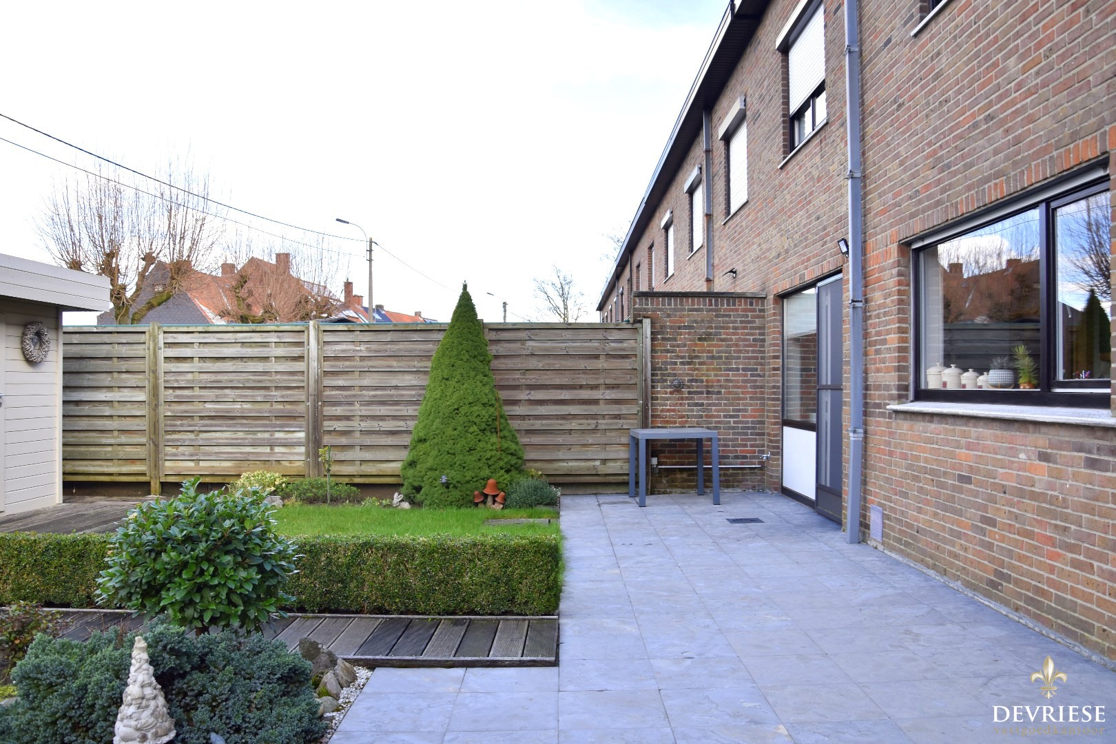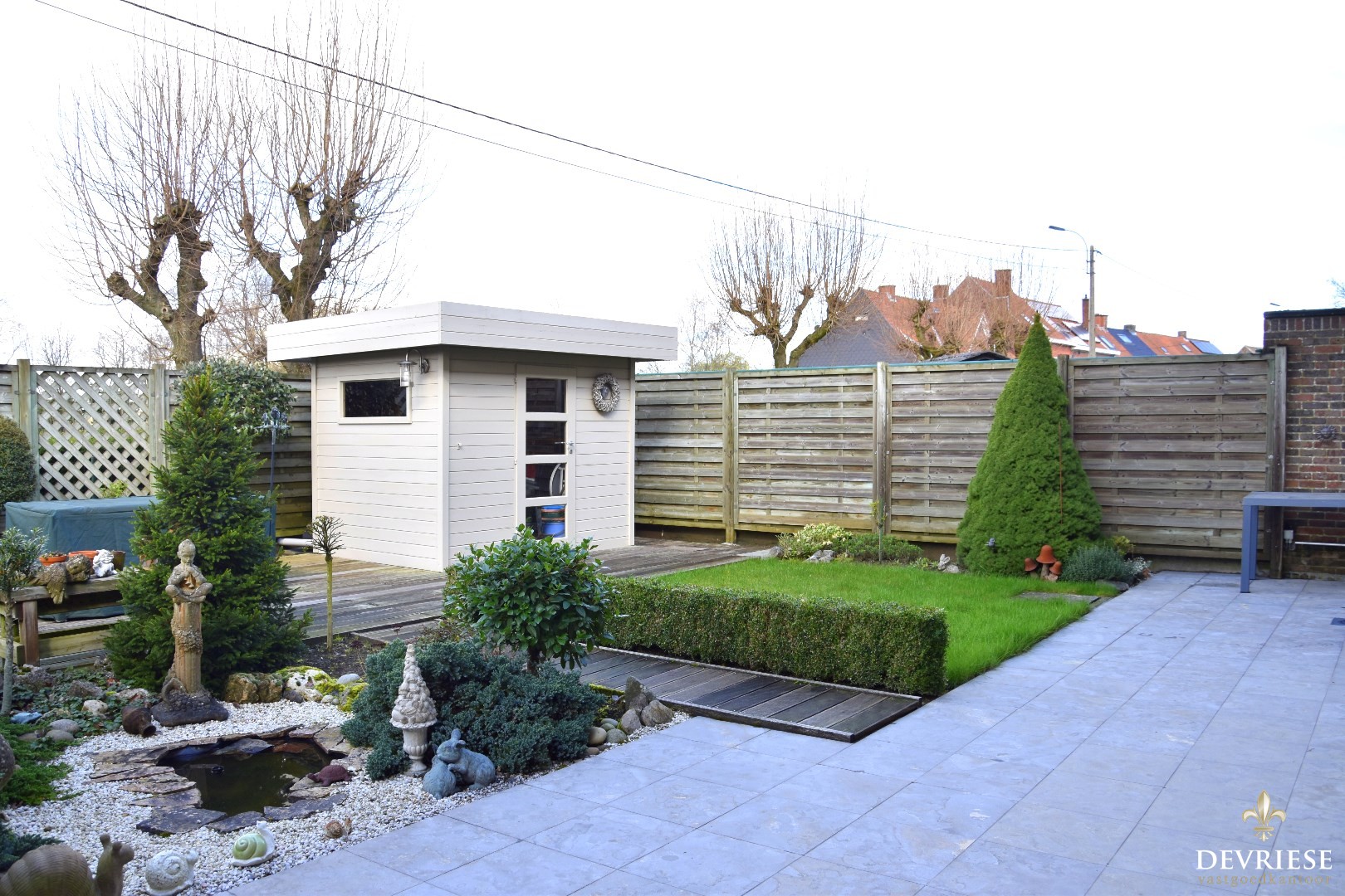 Onderhoudsvriendelijke tuin met berging en uitweg.