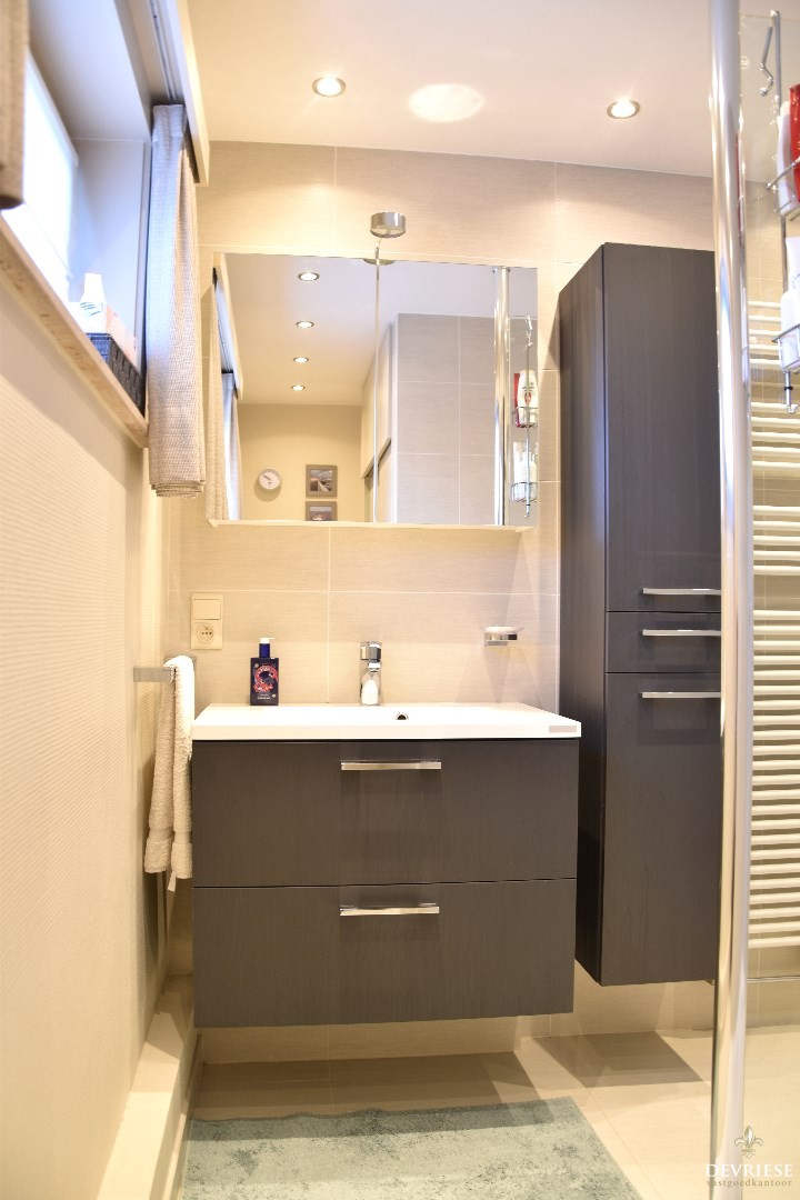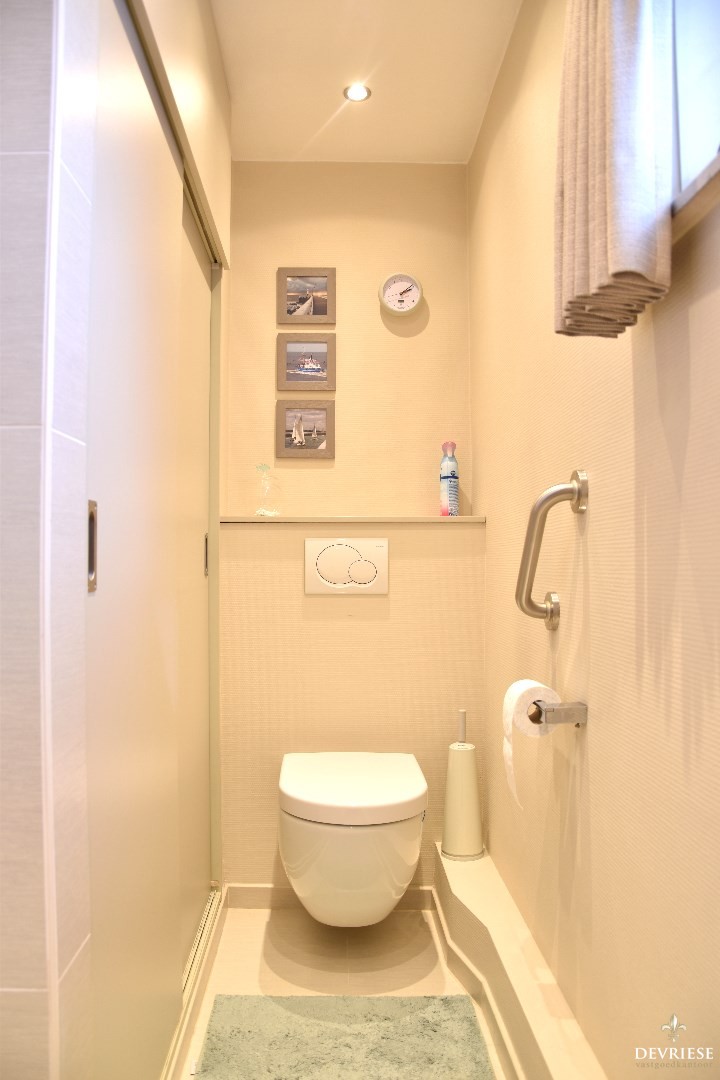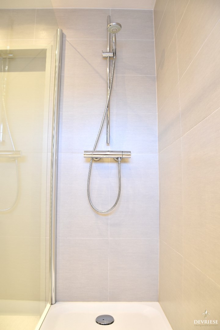 Recent vernieuwde badkamer uitgerust met een inloopdouche, lavabo en een tweede toilet.