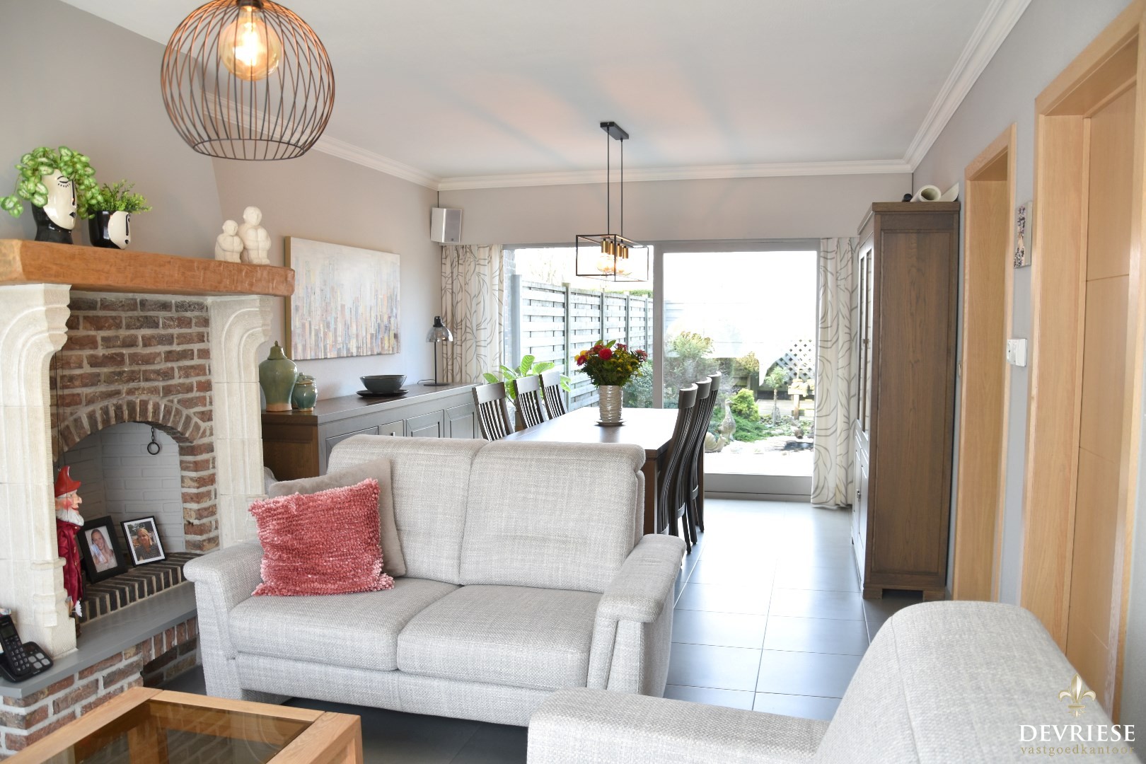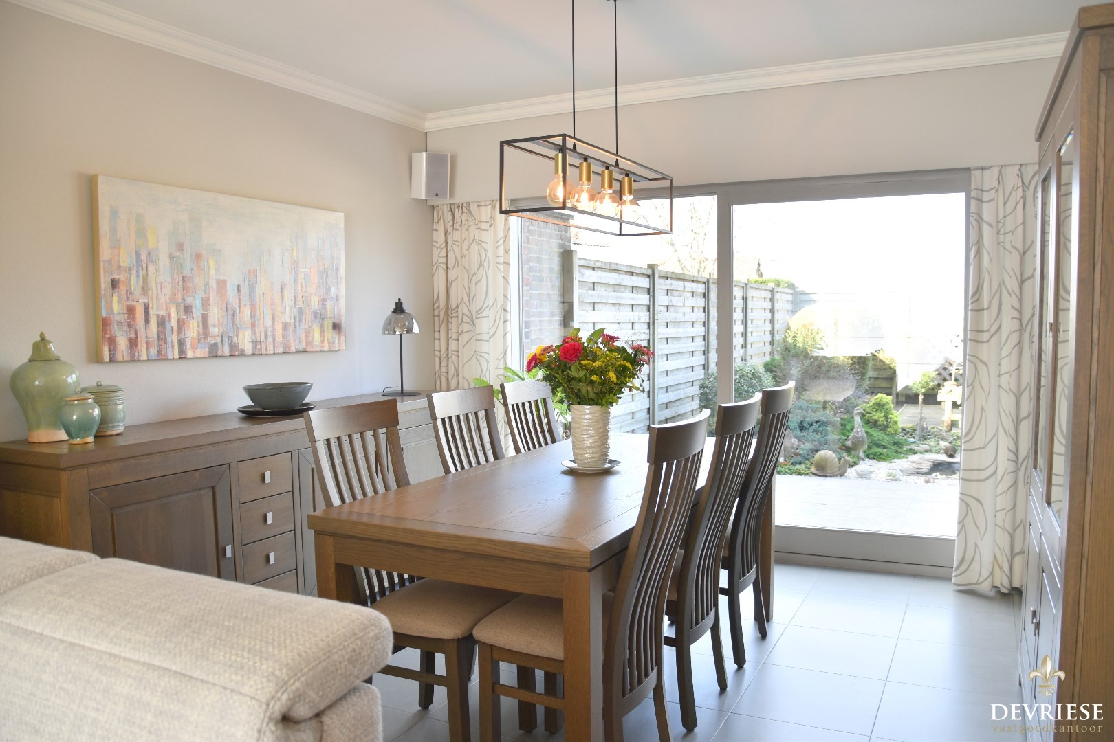Het leefgedeelte bestaat uit een eetplaats en ruime zithoek. Een aangenaam geheel met veel lichtinval en vol zicht op de tuin.