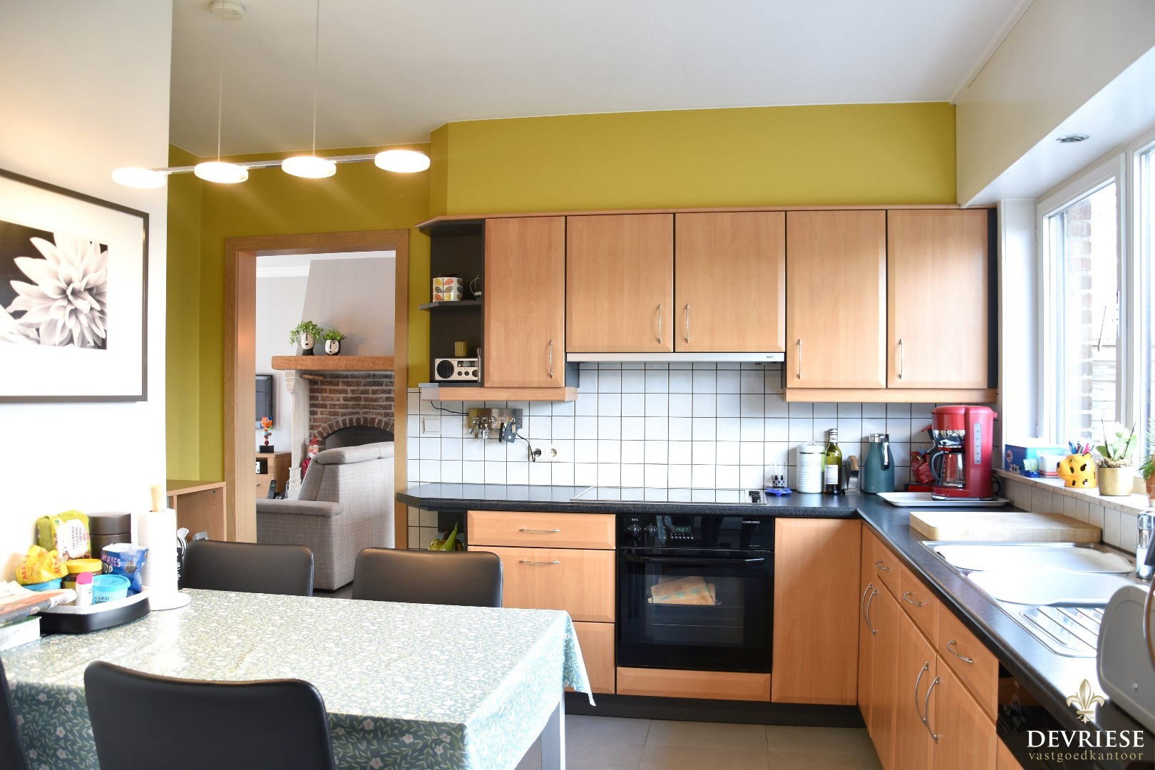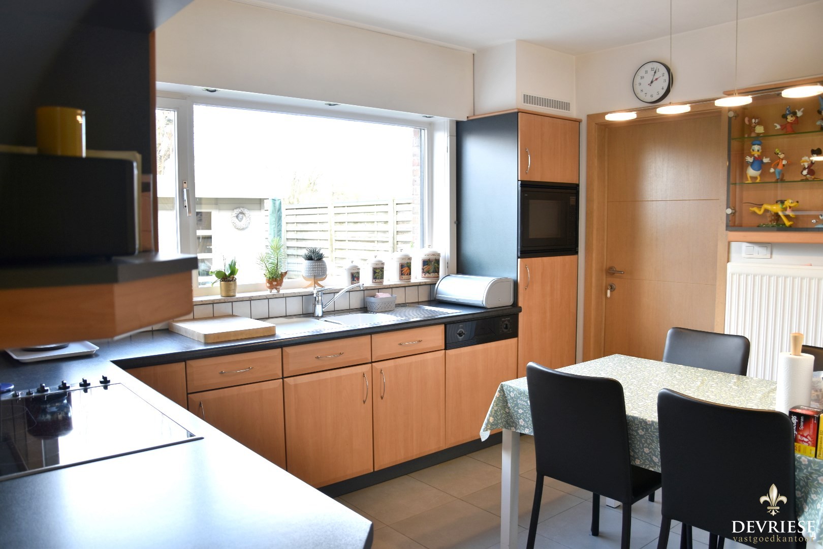 Aanpalend treffen we een geïnstalleerde keuken met ontbijthoek en extra opbergmogelijkheden.