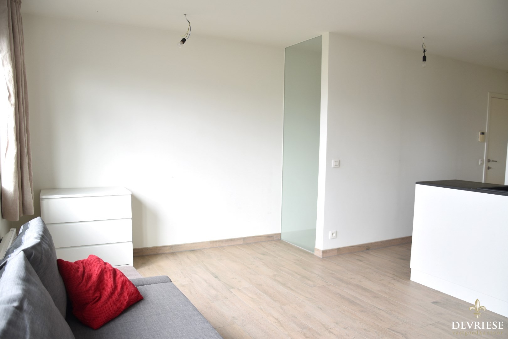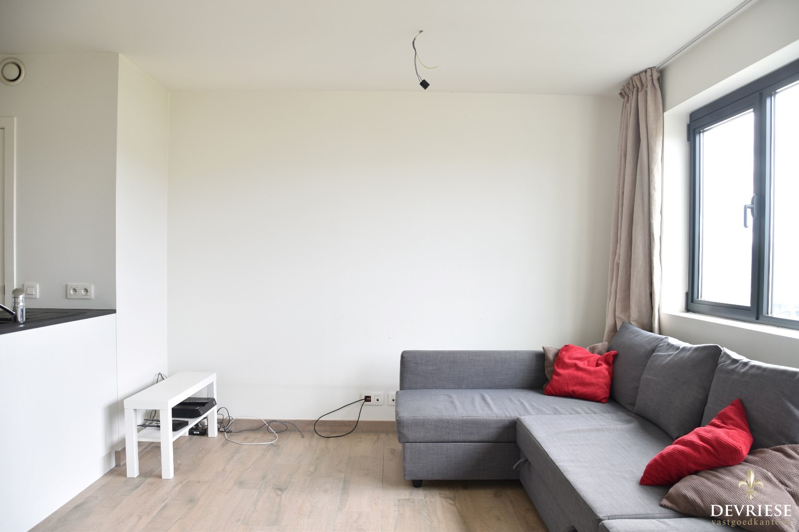 Lichtrijke leefruimte bestaande uit een gezellige zithoek, eetplaats en een volledig geïnstalleerde keuken.