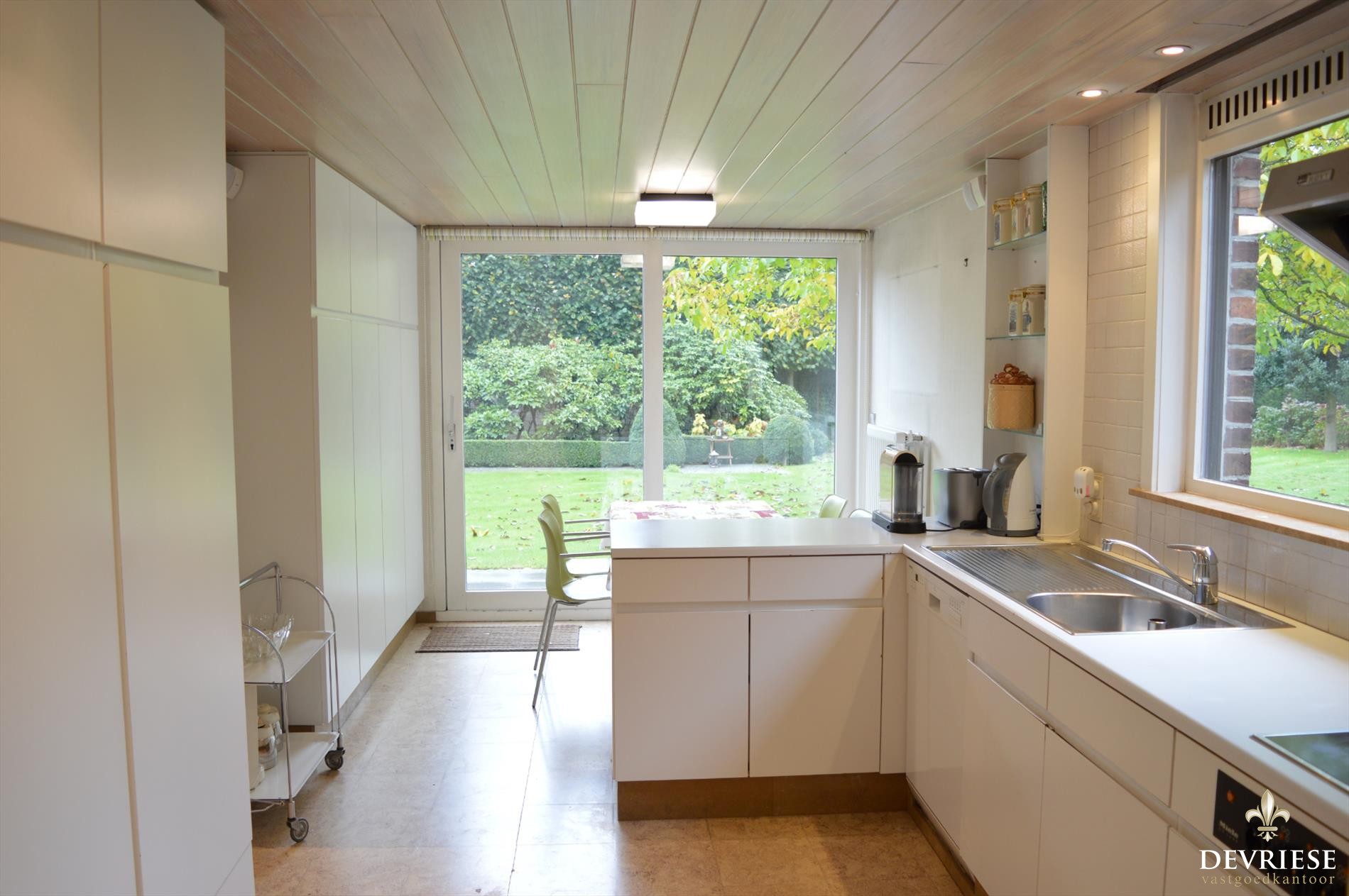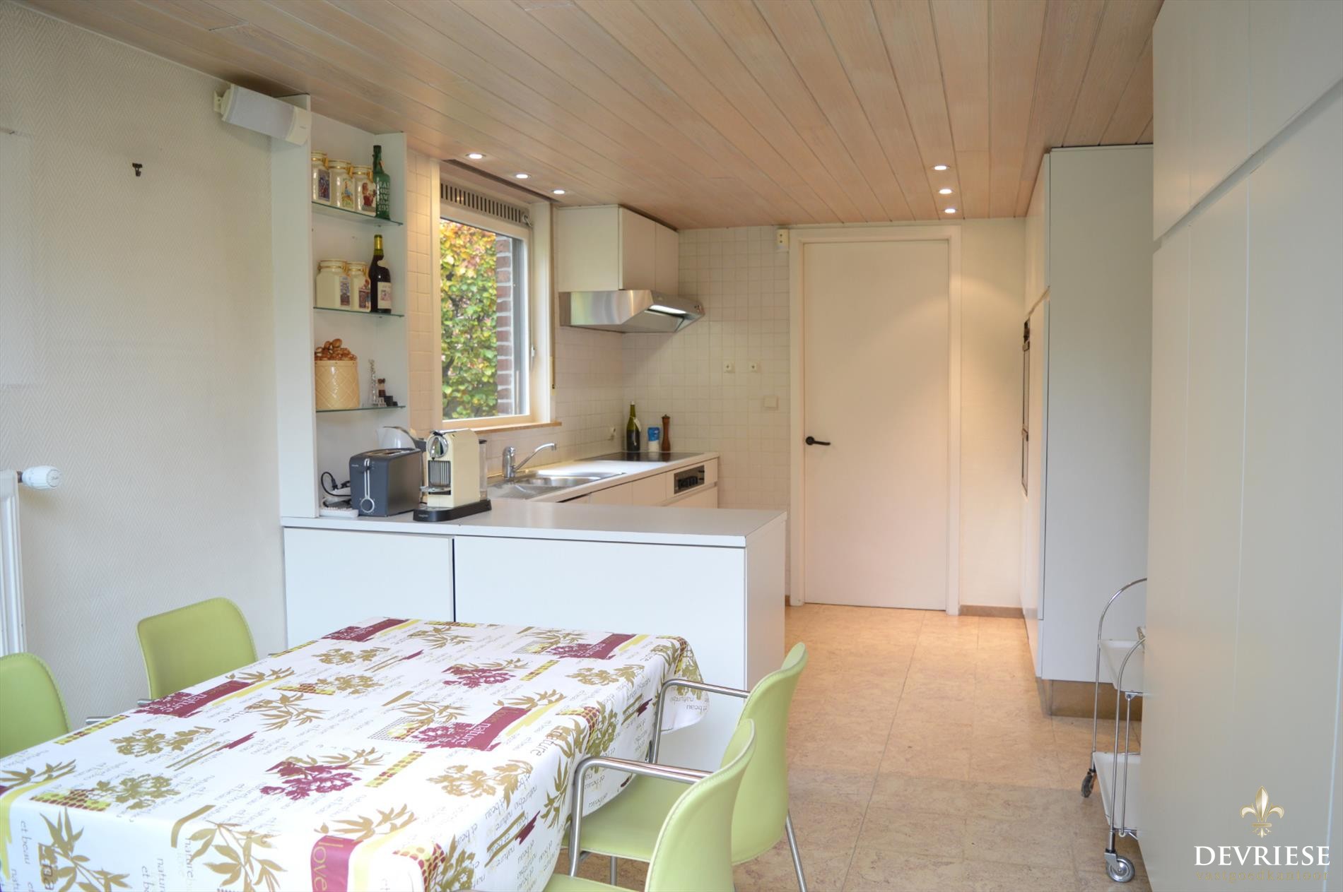 Binnen komen we in een stijlvol ingerichte inkomhal uitgevende naar een aparte bureau- en sanitaire ruimte met vestiaire (mogelijkheid vrij beroep), alsook rechtstreekse toegang tot de ruime woonkamer die uitkijkt op de fraai aangelegde tuin. Ook de keuken, gelegen net naast de woonkamer, geniet dit mooie zicht. Aanliggend een praktische bergruimte/wasplaats met vaste trap naar een extra leef-/hobbyruimte.