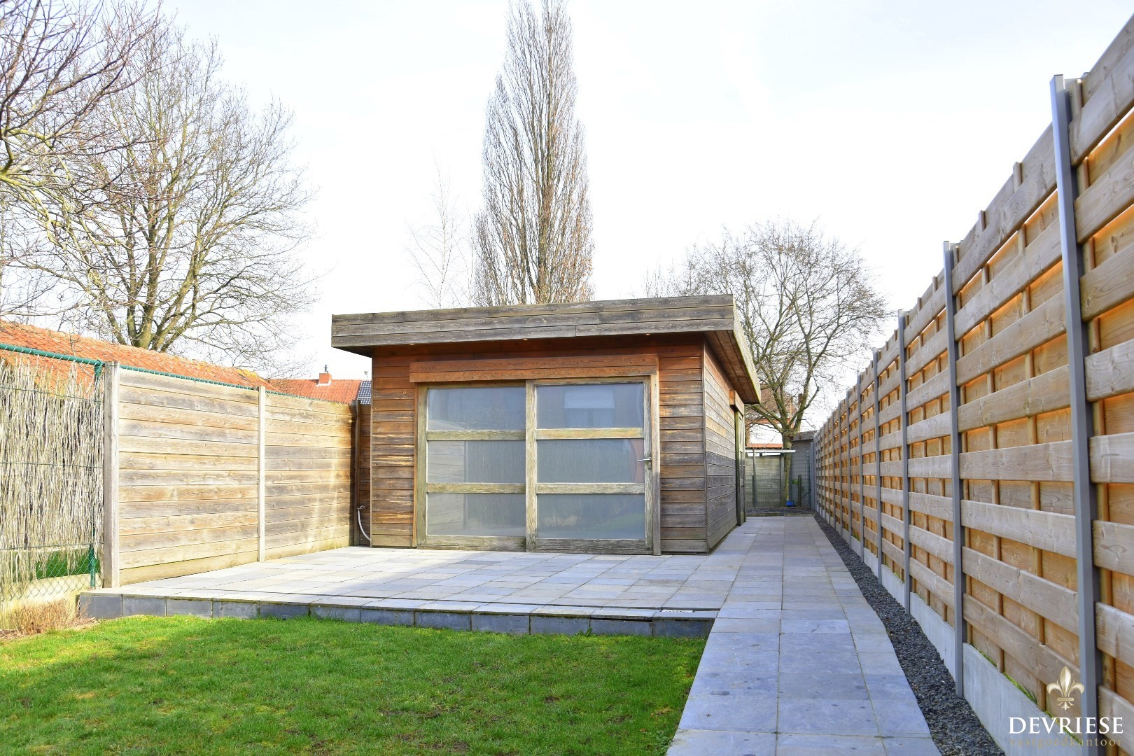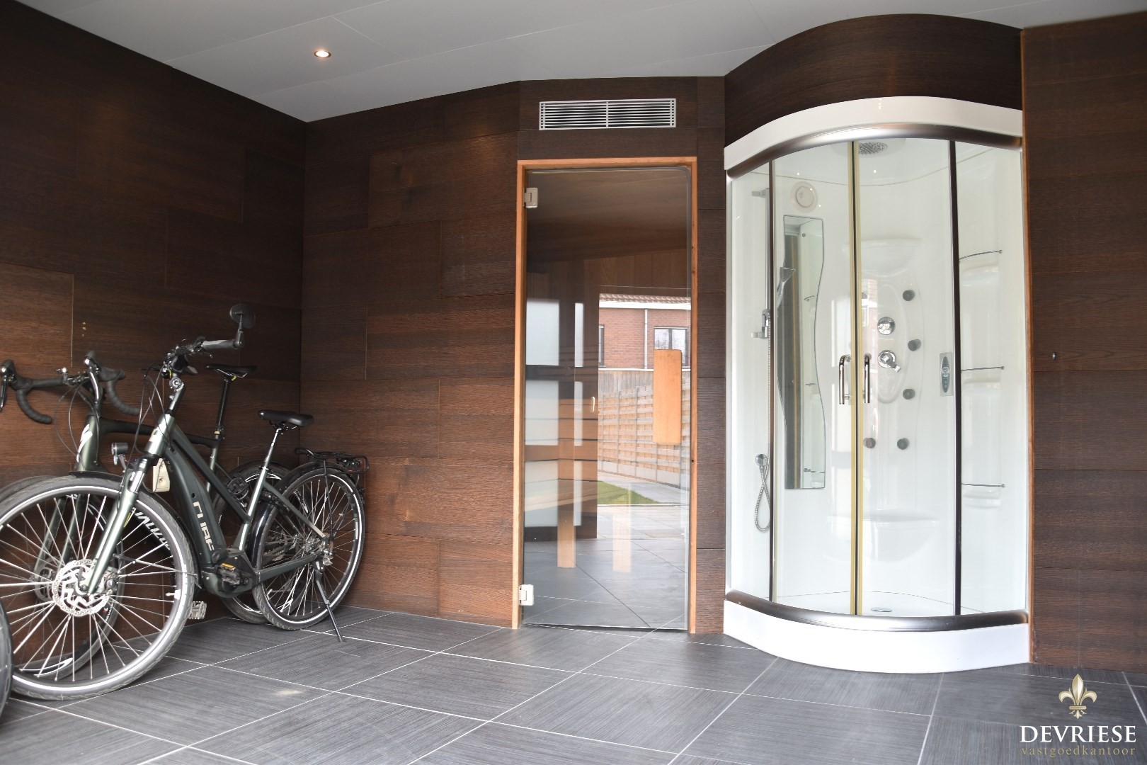 De tuinconstructie doet enerzijds dienst als wellness (sauna, massagedouche en relaxgedeelte - reeds TV-sluiting voorzien), anderzijds als praktische ... tuinberging voor tuinmateriaal, fietsen, etc.