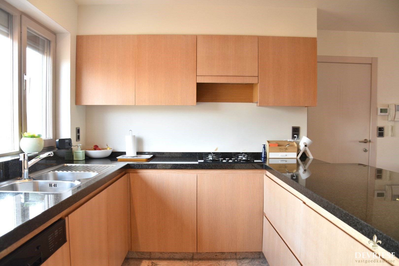 Op de eerste verdieping treden we de open leefruimte binnen. Een gezellige woonkamer met gashaard en een uitgeruste open keuken met eetplaats. Veel lichtinval dankzij de grote ramen. Van hieruit is er toegang tot het balkon, alsook tot de tuin. Apart toilet.