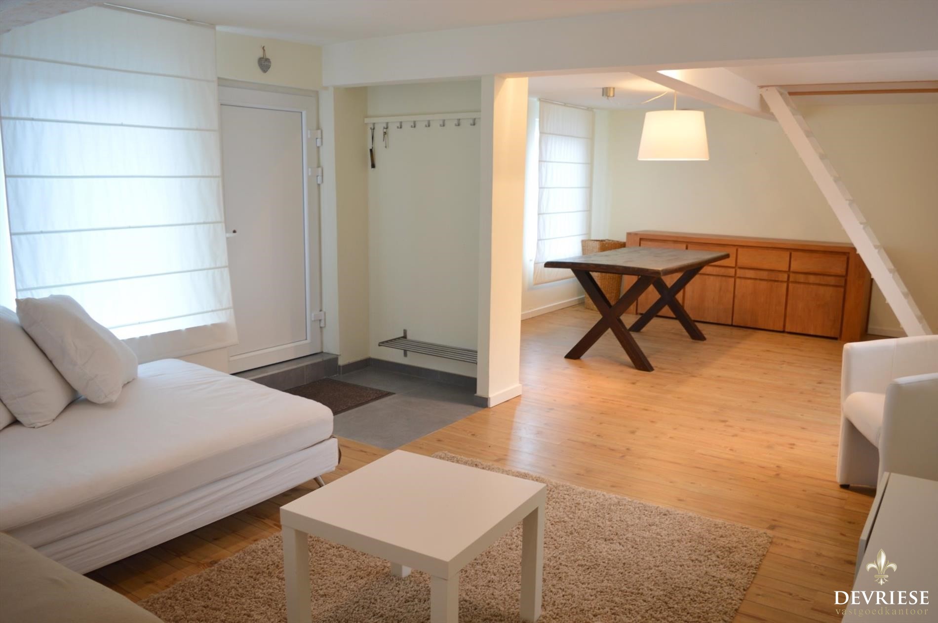 Ruime leefruimte met open ingerichte keuken. Aangenaam vertoeven dankzij heel wat natuurlijk lichtinval. Onderhoudsvriendelijke badkamer met douche, toilet en een geïntegreerde wasplaats.