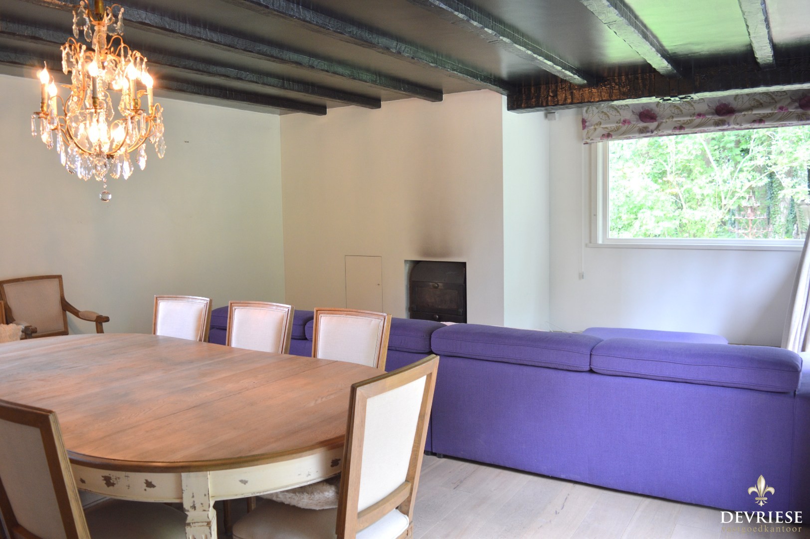 Via de inkomhal met apart gastentoilet kom je in de gezellige en leefruimte met open haard. Deze omvat een comfortabele zithoek en een eetplaats met zicht op het omliggende groen.