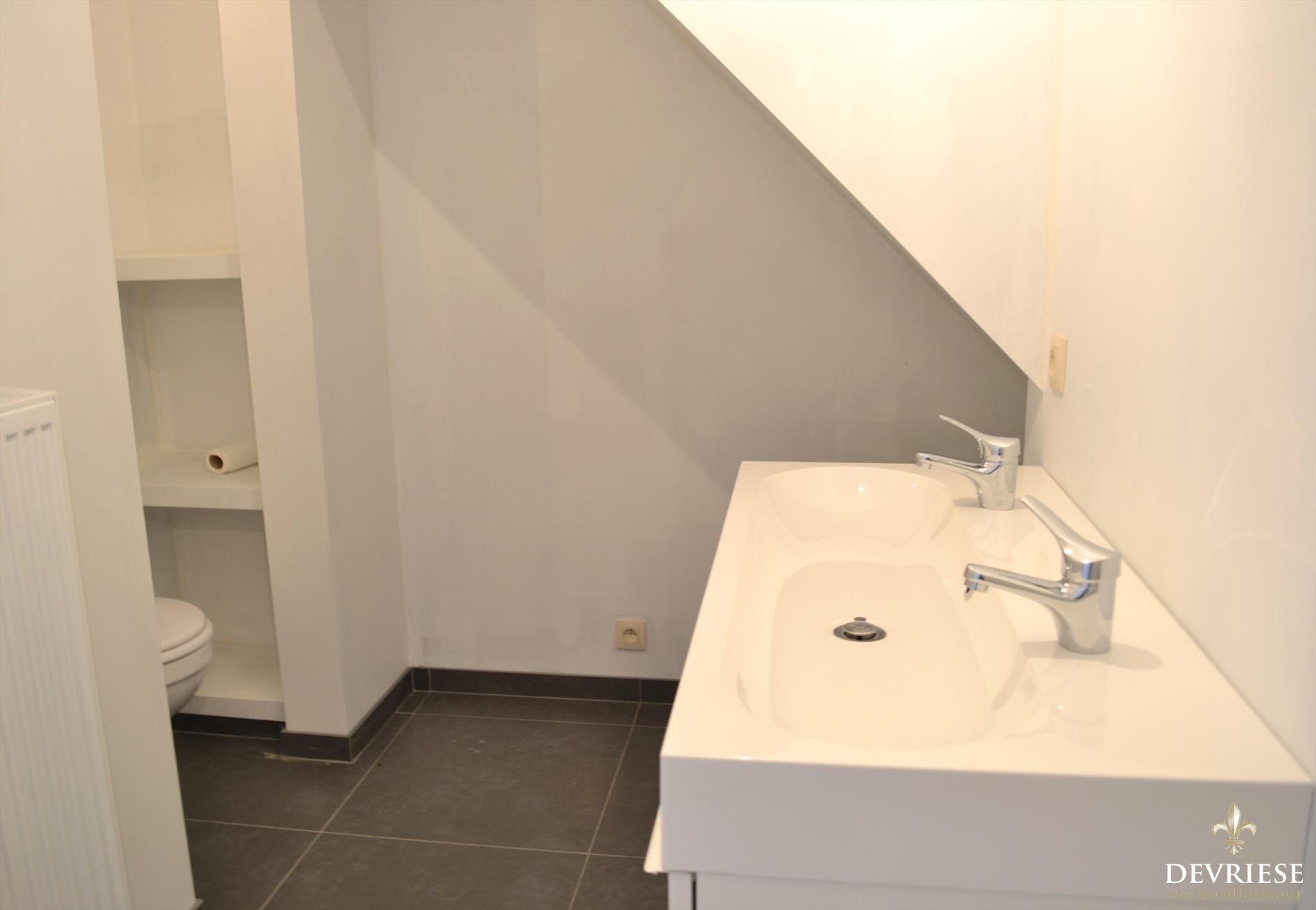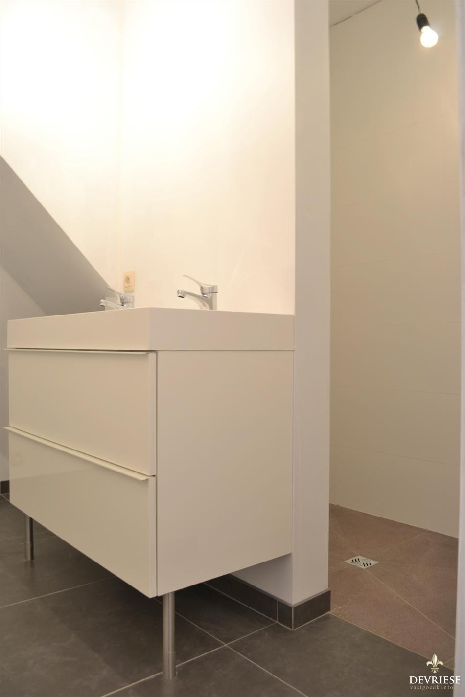 Bij het binnenkomen van de woning is er een grote bergruimte/wasplaats. Verderop de gang vinden we het gastentoilet en de smaakvol ingerichte badkamer met een tweede toilet. Achteraan de woning bevindt zich de open keuken die uitkijkt op de ruime living en tuin. Deze woonruimte baadt in het licht en geeft een heel ruimtelijk gevoel.