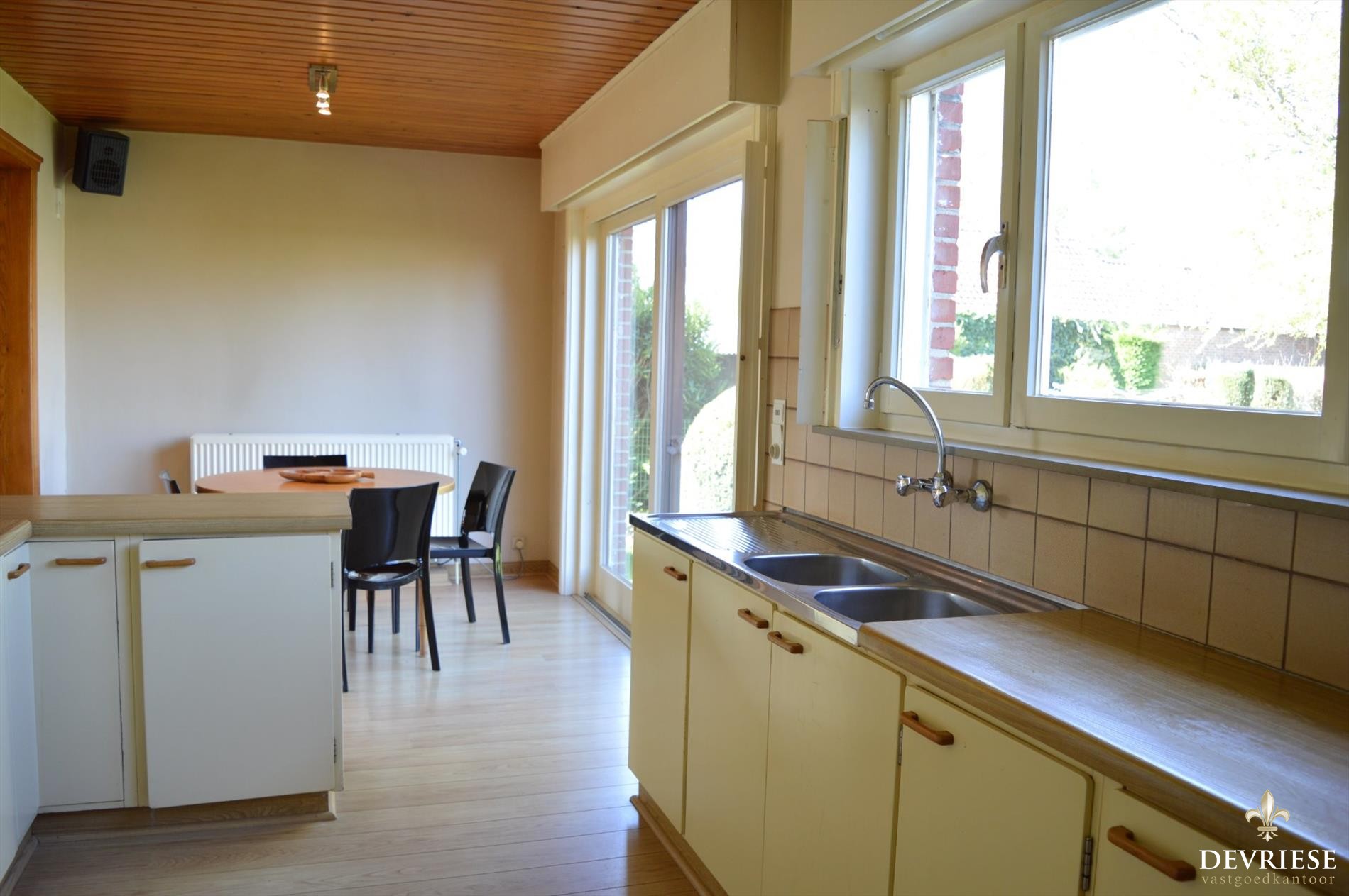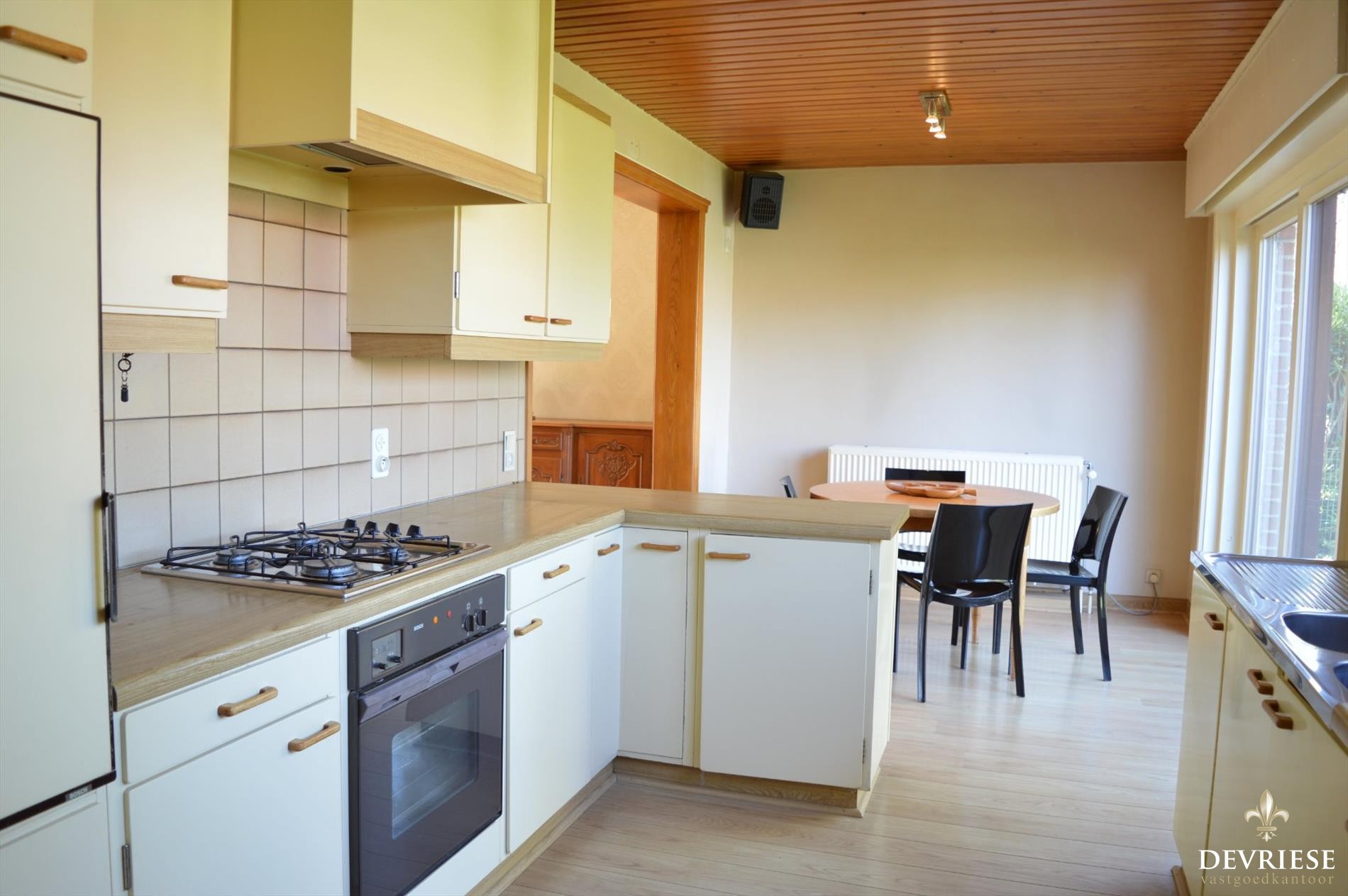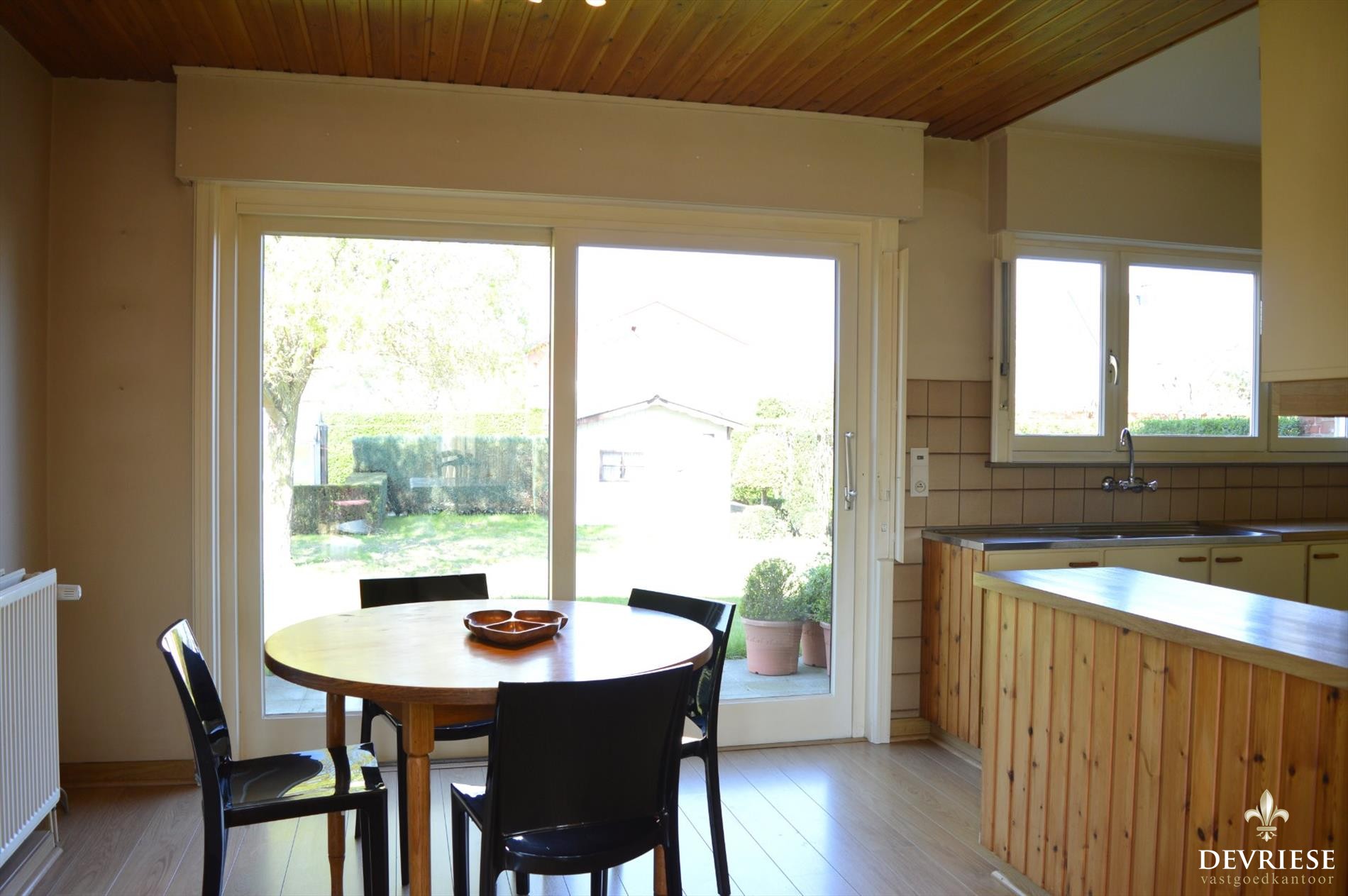 Aansluitend aan de woonkamer, de open keuken met eethoek, bijhorende praktische berging, en rechtstreekse toegang tot de garage. De keuken geeft via een groot schuifraam onmiddellijke toegang tot het terras en gezellige tuin, het ideale speelterrein voor de kids.