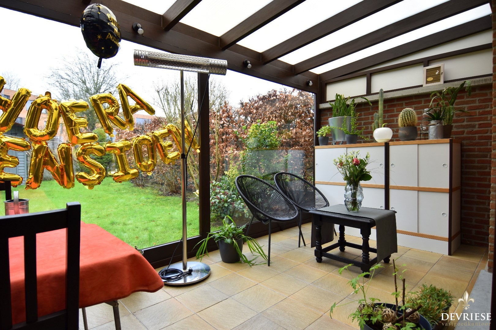 Veranda, waar je heerlijk kan genieten, zowel 's winters als zomers, mét vol uitzicht op de tuin.