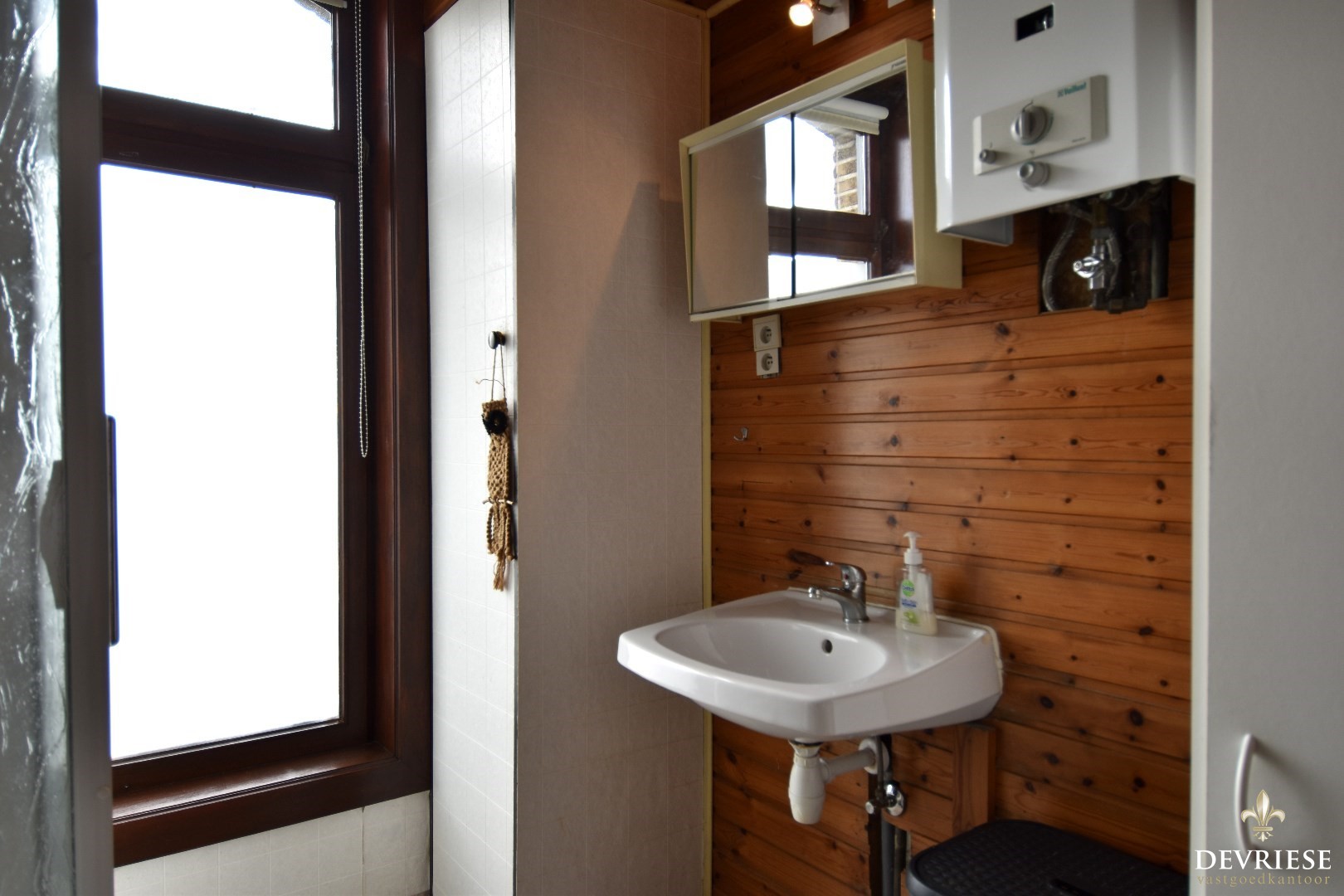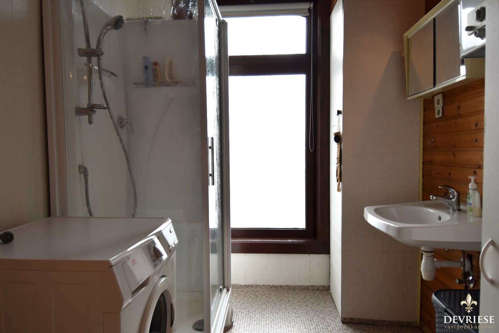 De badkamer is uitgerust met een douche en lavabo, en heeft een geïntegreerde wasplaats.