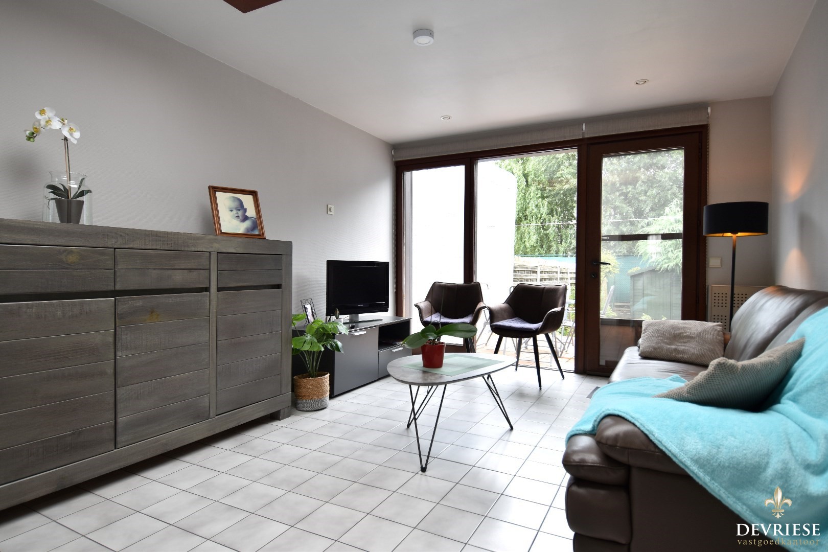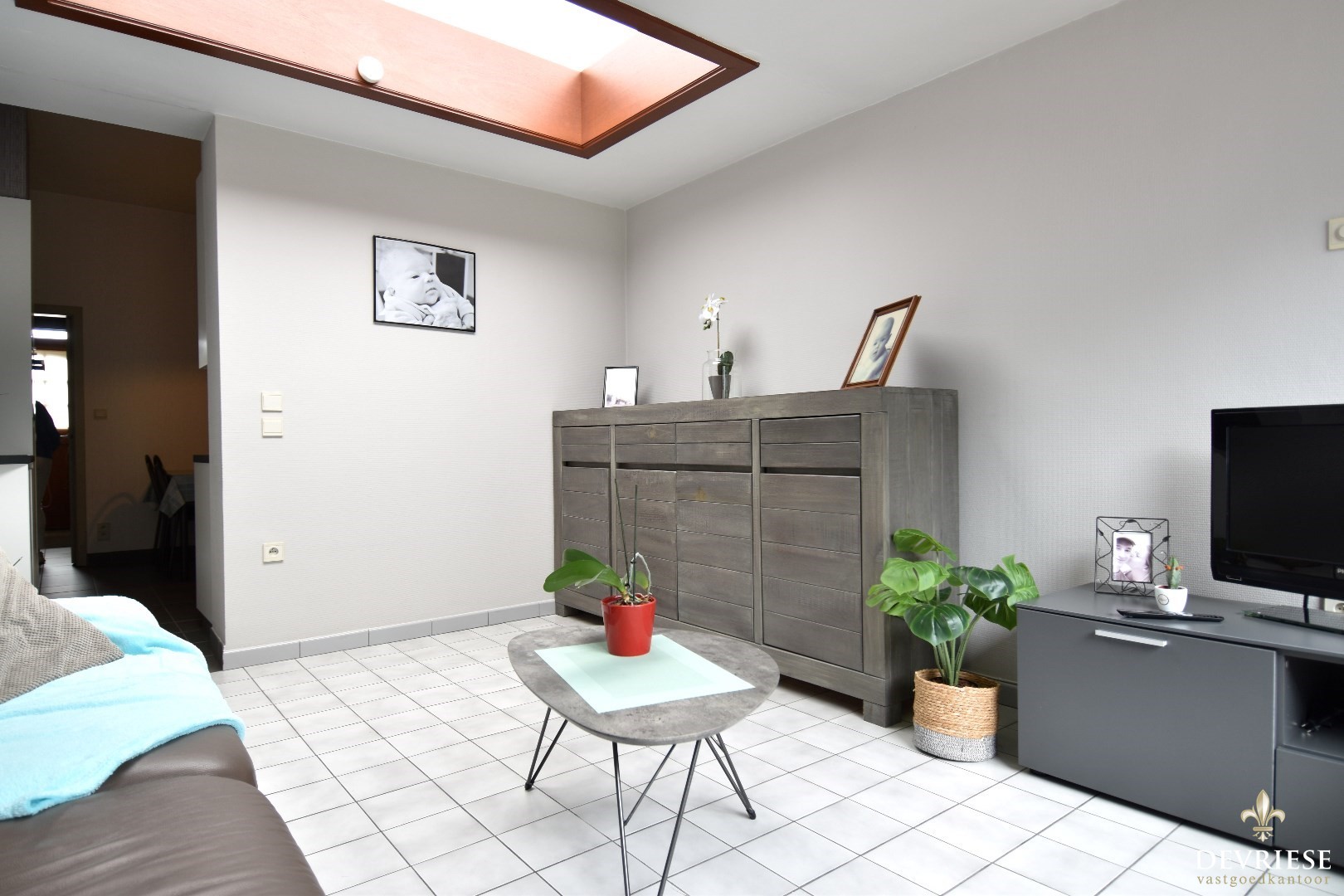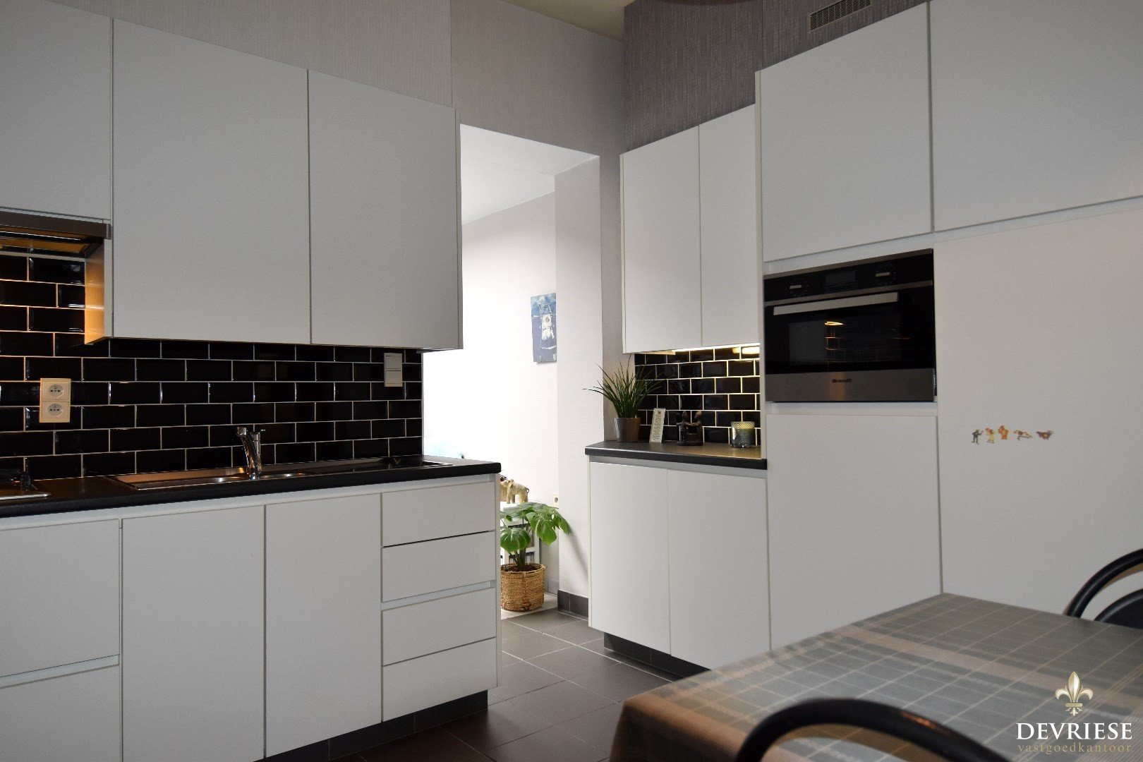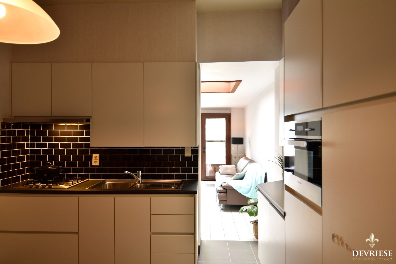 Een gezellige inkomhal die leidt naar de volledig uitgeruste keuken met een knusse ontbijthoek. De lichtrijke leefruimte geeft uit op een terras en een Oost-gerichte stadstuin, perfect om te genieten van het ochtendzonnetje.