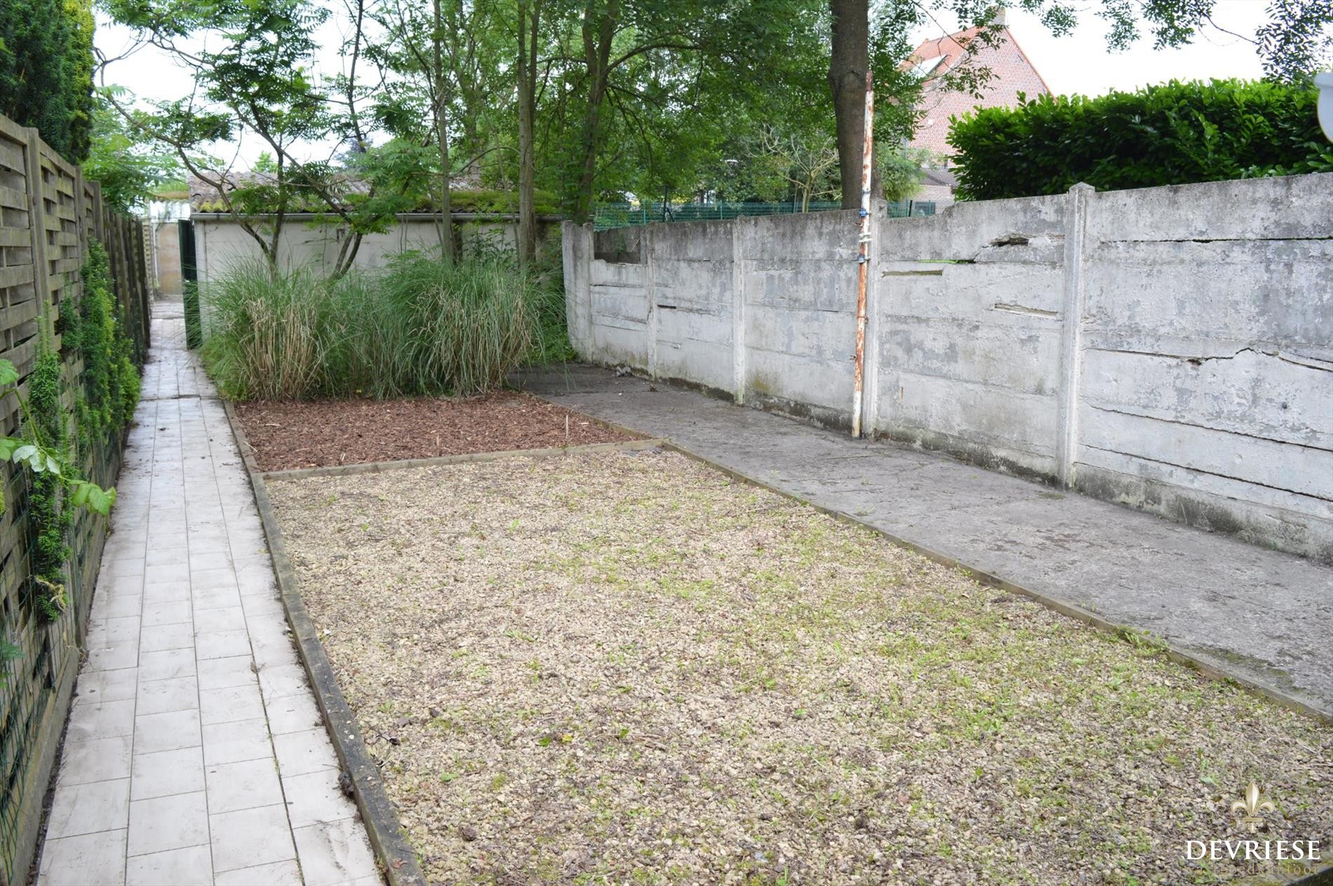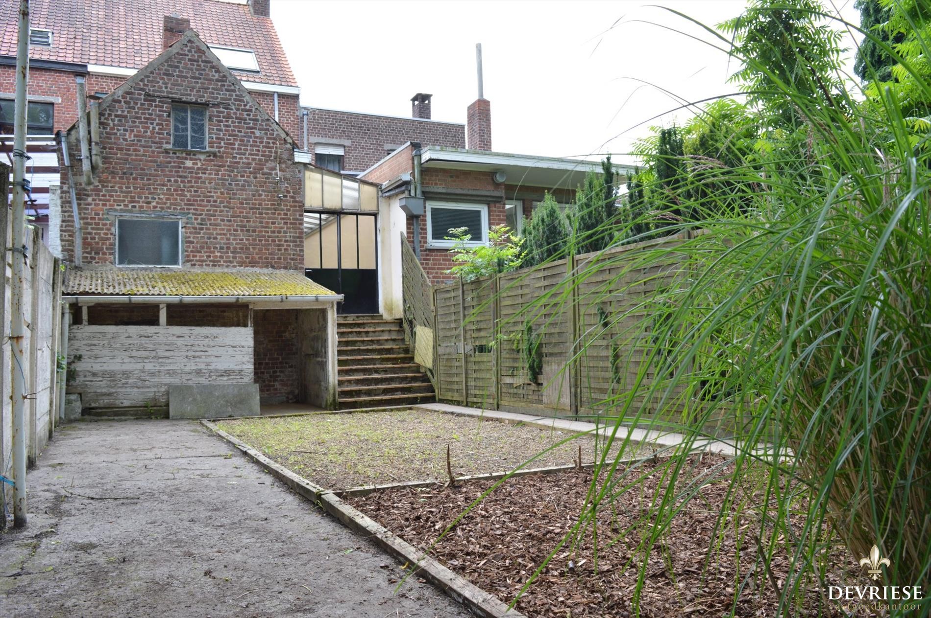 Als kers op de taart is er achteraan de woning het mooie stukje tuin dat nu voorziet in een aantal garages en een lange uitweg/oprit. Deze woning is ideaal als gezinswoonst voor wie wat ademruimte zoekt en bij de woning achteraan eventueel wat stapelruimte ... zoekt en/of parkeerruimte voor een aantal wagens.