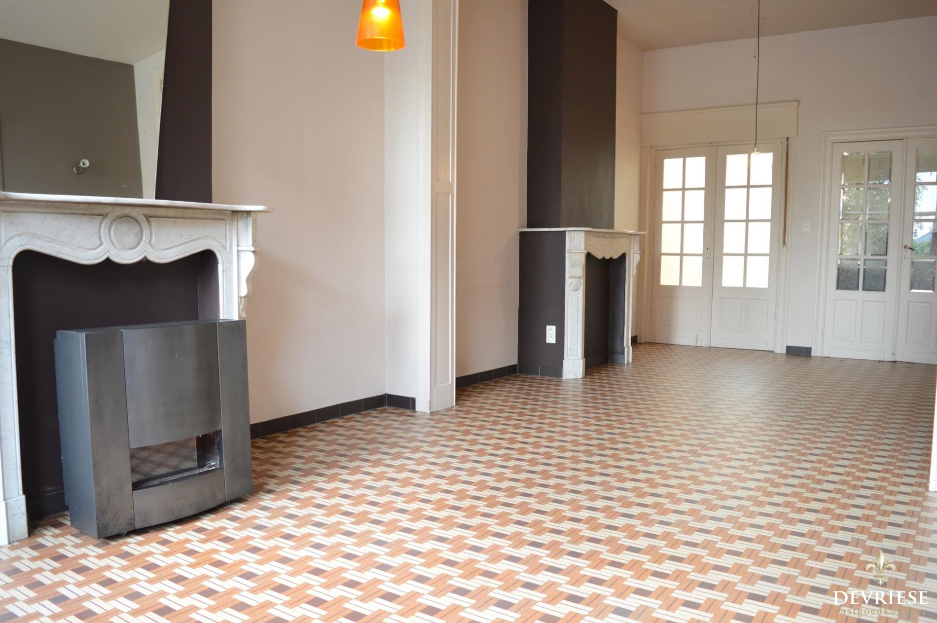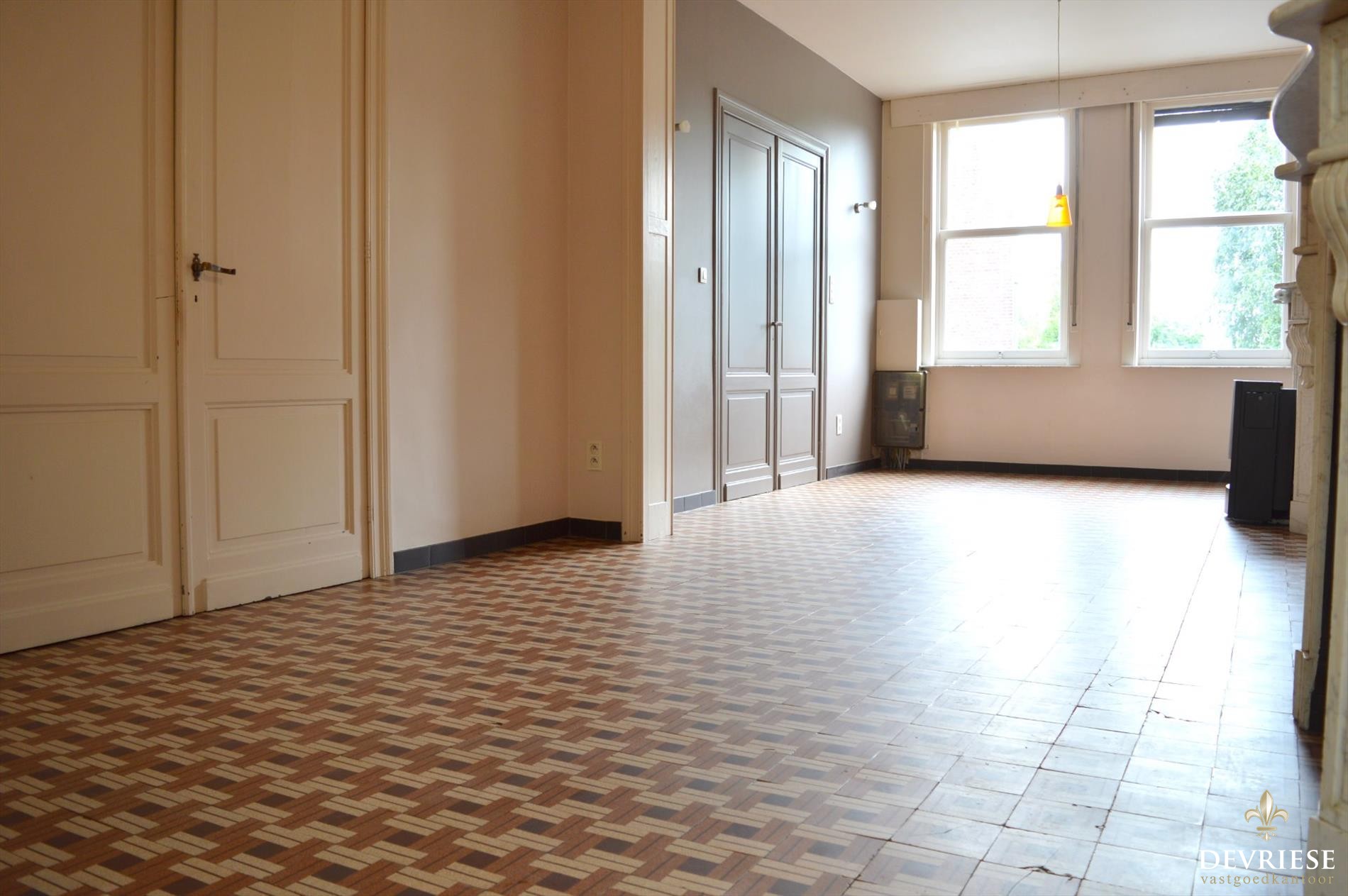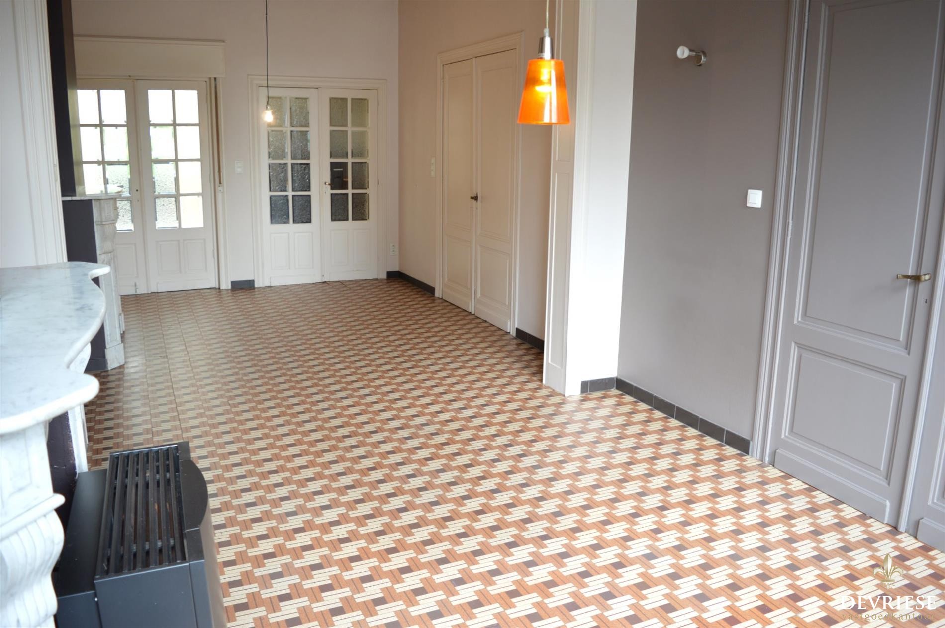 U komt binnen in de sfeervolle, ruime inkomhal die zowel toegang geeft naar de leefruimte met hoge plafonds, originele deuren en heel wat lichtinval, alsook naar de ruime keuken net achter de leefruimte. Via de keuken is er toegang tot een grote en praktische voorraadkelder.