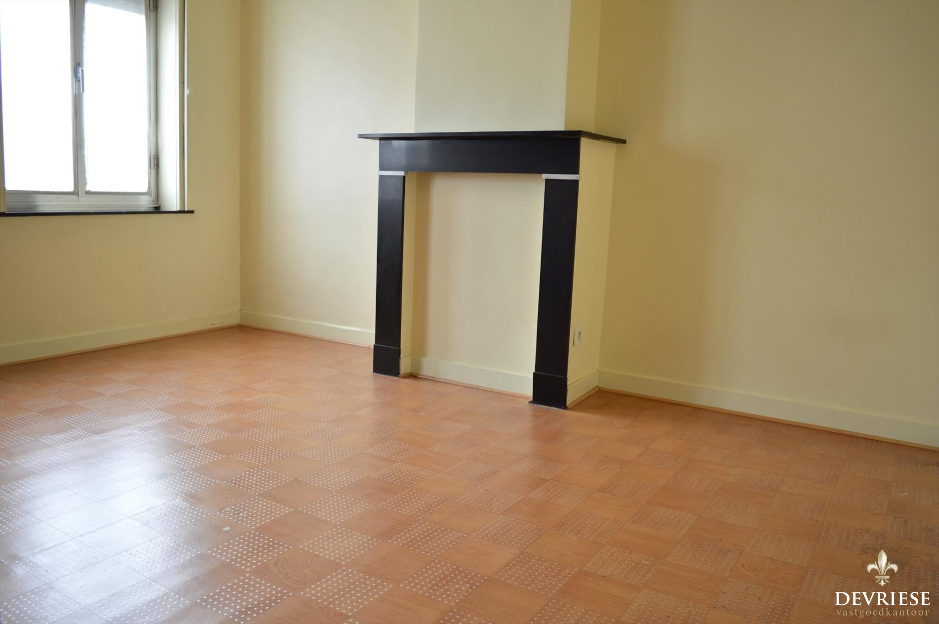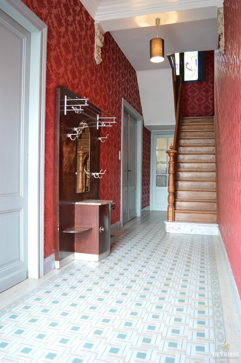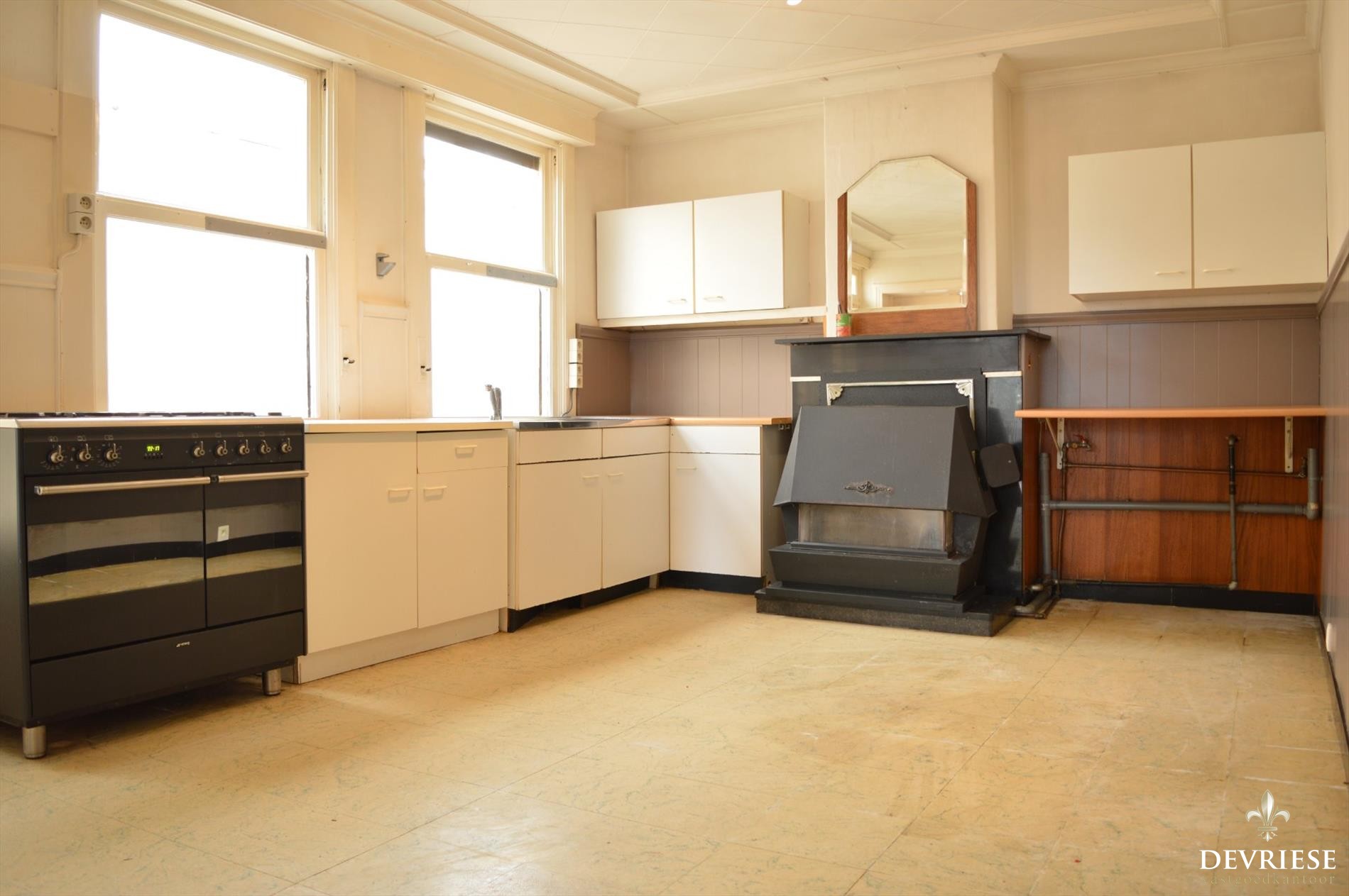 U komt binnen in de sfeervolle, ruime inkomhal die zowel toegang geeft naar de leefruimte met hoge plafonds, originele deuren en heel wat lichtinval, alsook naar de ruime keuken net achter de leefruimte. Via de keuken is er toegang tot een grote en praktische voorraadkelder.
