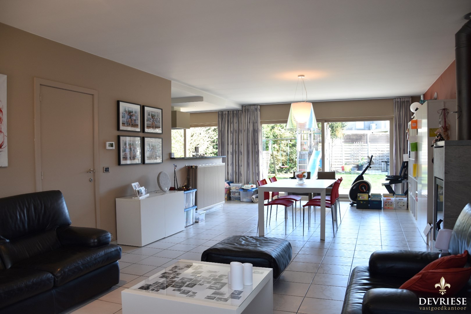 Het ruimtelijk gevoel trekt zich door naar de leefruimte. Salon -en eetplaats met de gezellige warmte van een kachel. En ook niet te vergeten, open zicht op de tuin.