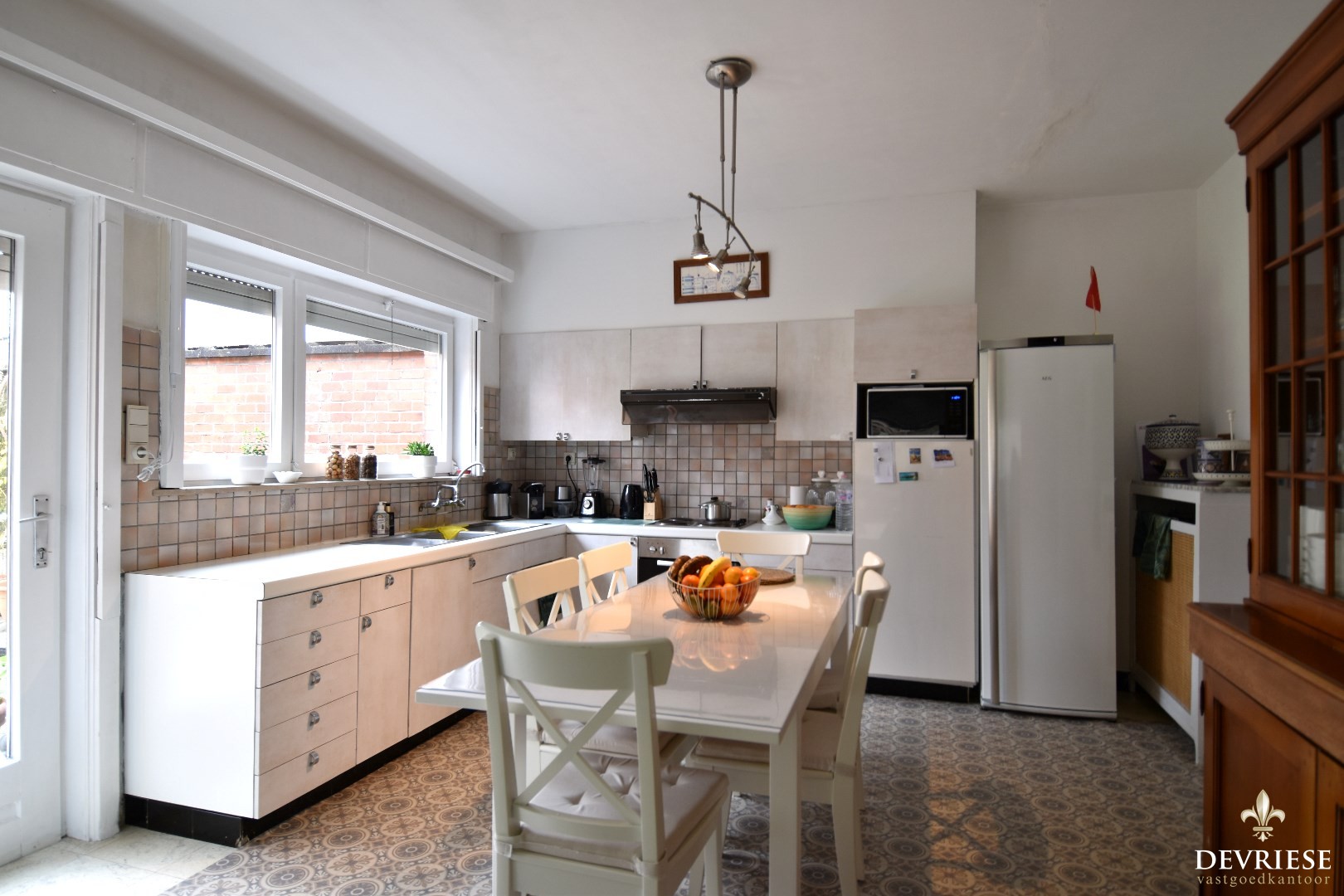De aangrenzende open geïnstalleerde keuken is voorzien van een praktische ontbijthoek, ideaal voor het gezellig samenzijn.