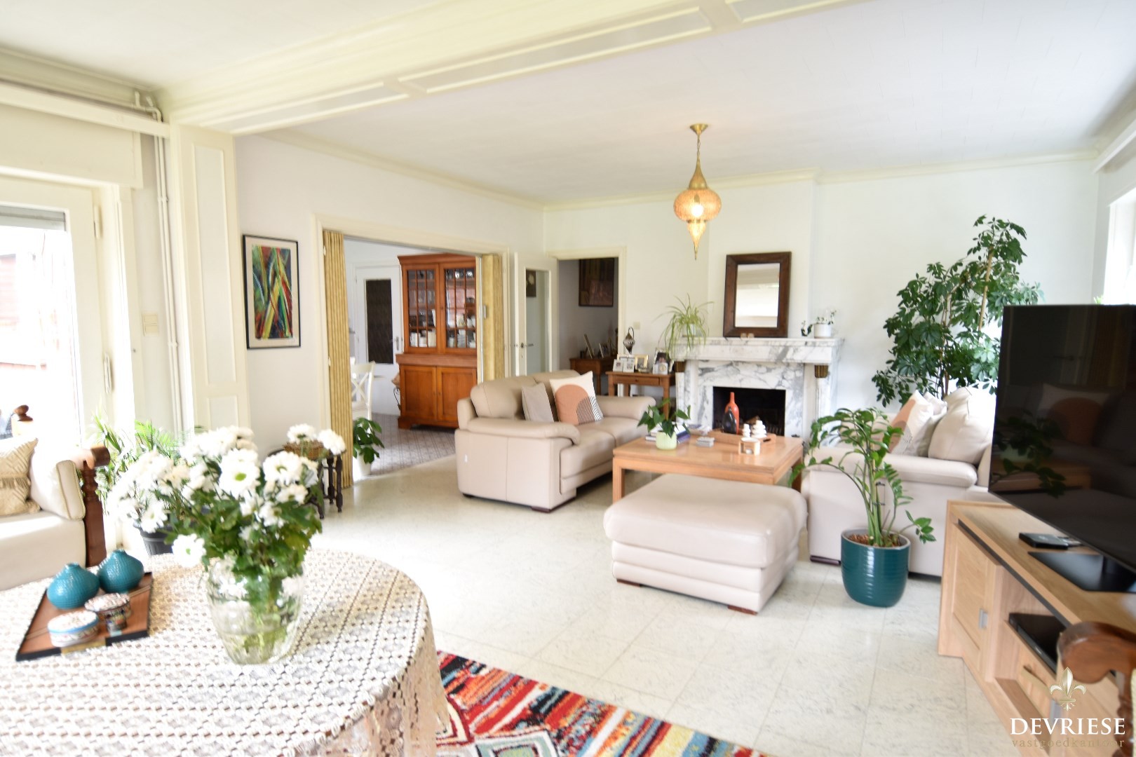 De inkomhal verwelkomt je met een apart gastentoilet. Van hieruit kom je in de ruime, open leefruimte die bestaat uit een gezellige zithoek en een eetplaats met een prachtig zicht op de tuin. Grote raampartijen zorgen voor veel natuurlijk licht.