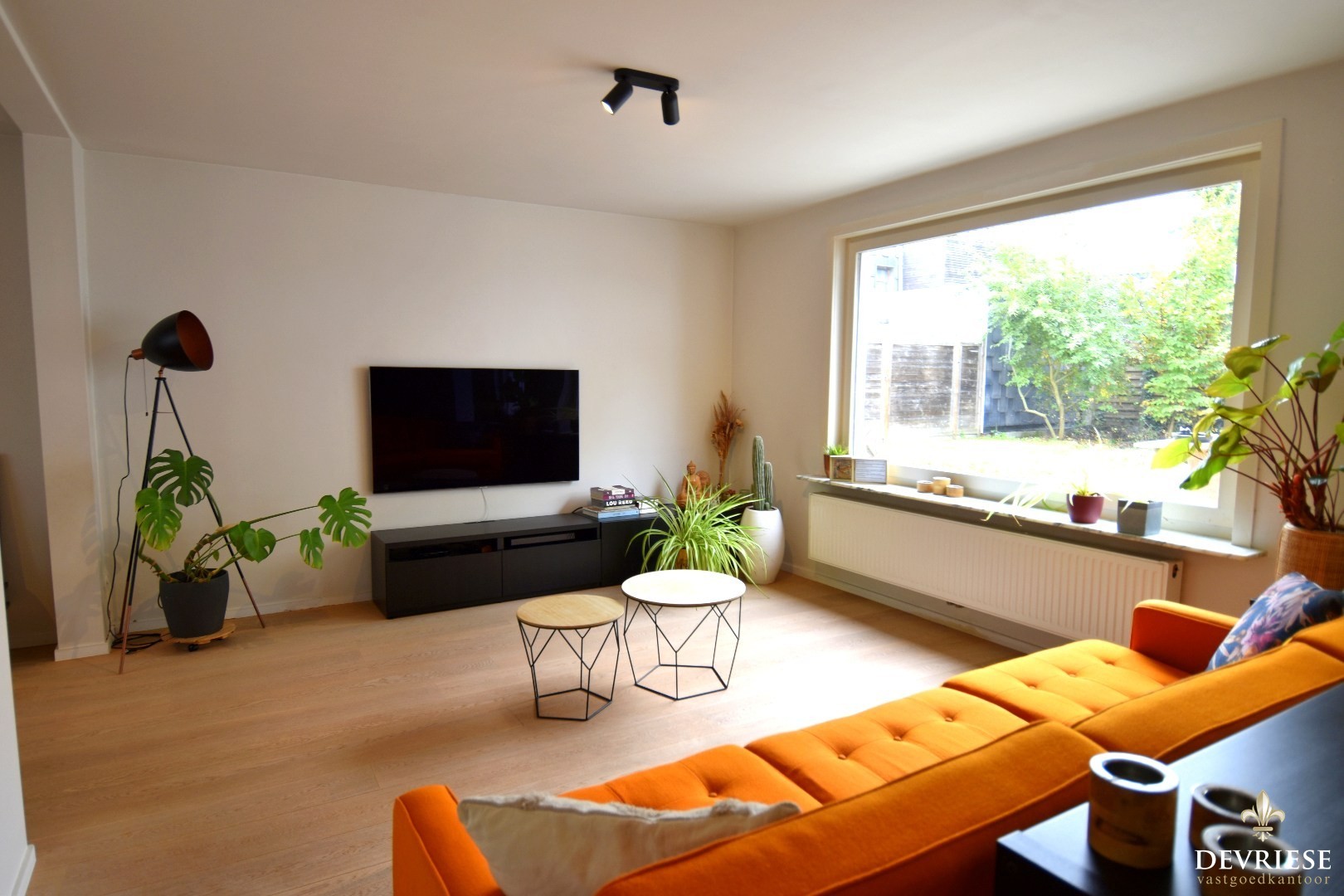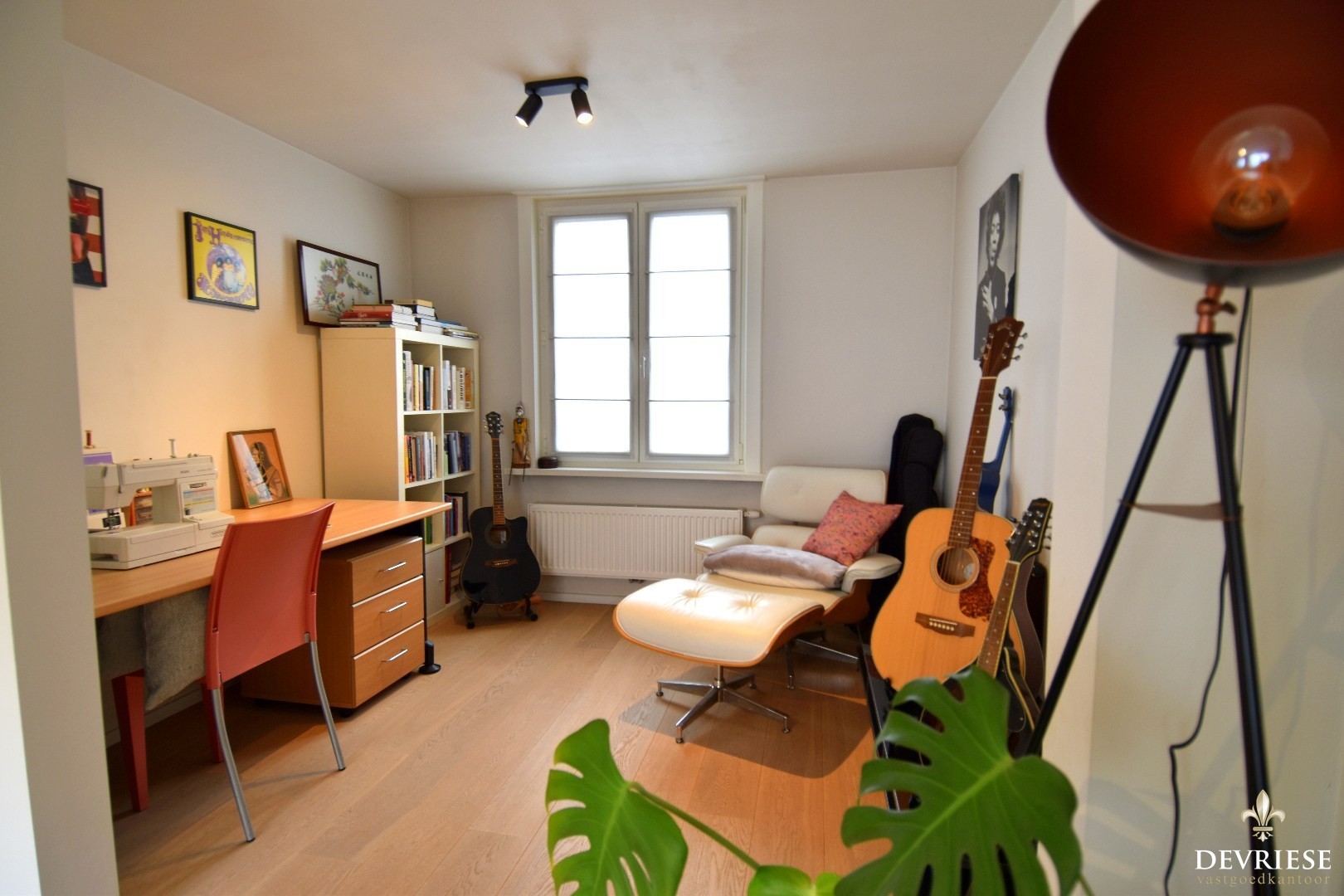 Binnenkomen doe je in een gezellige inkomhal, waar meteen ook een aparte bureauruimte (of eerste slaapkamer) aanwezig is. Verder vinden we op het gelijkvloers een lichtrijk leefgedeelte van 40 m², bestaande uit een eetplaats en zithoek die uitkijken op de tuin.