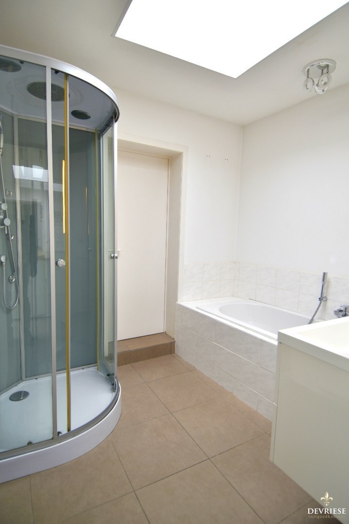 Achterliggend treffen we de badkamer. Deze werd uitgerust met een douchecel, enkele lavabo en ligbad. Apart toilet en een praktische berging met geïntegreerde wasplaats.