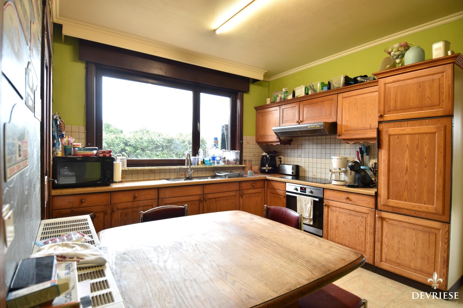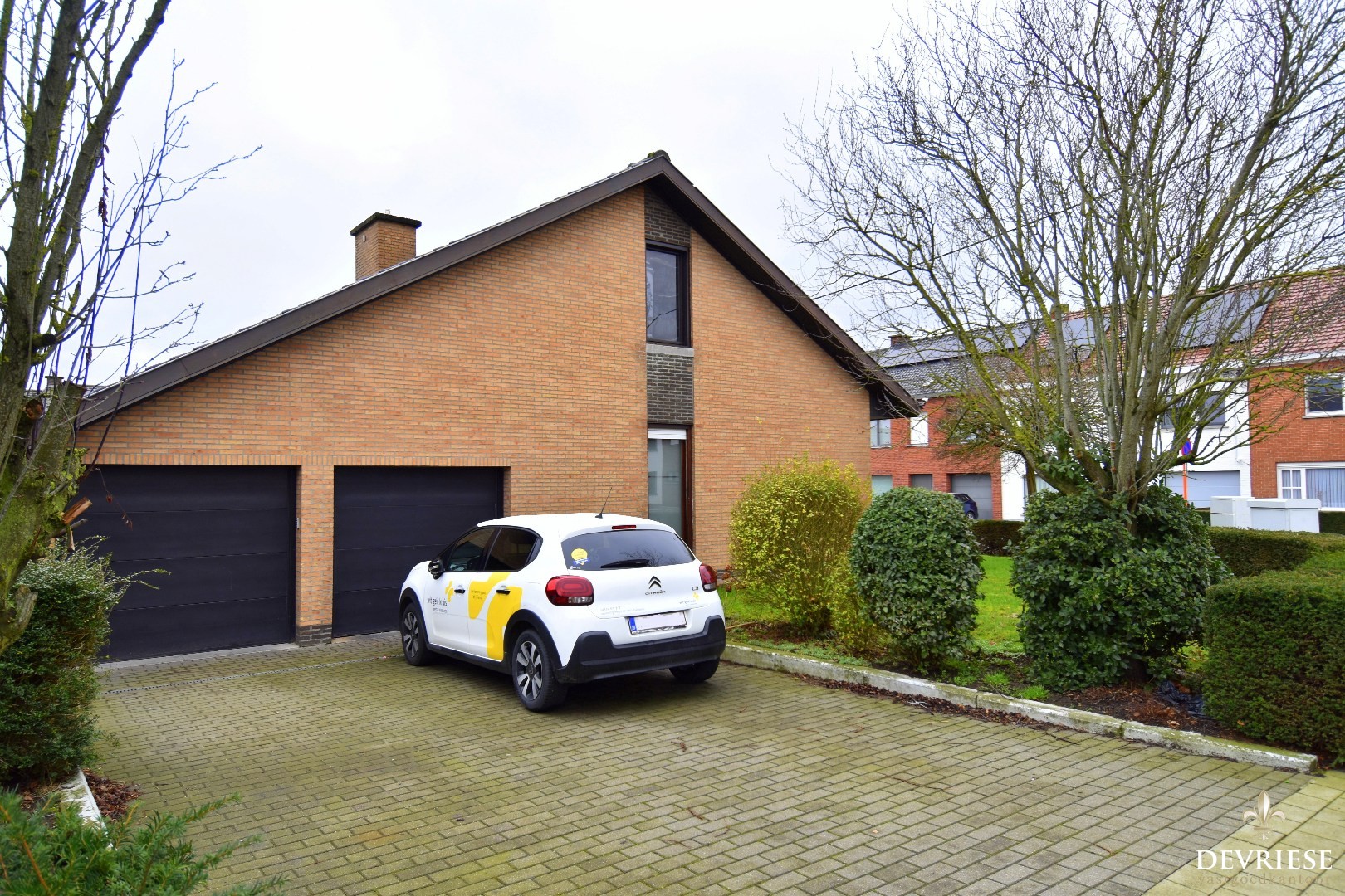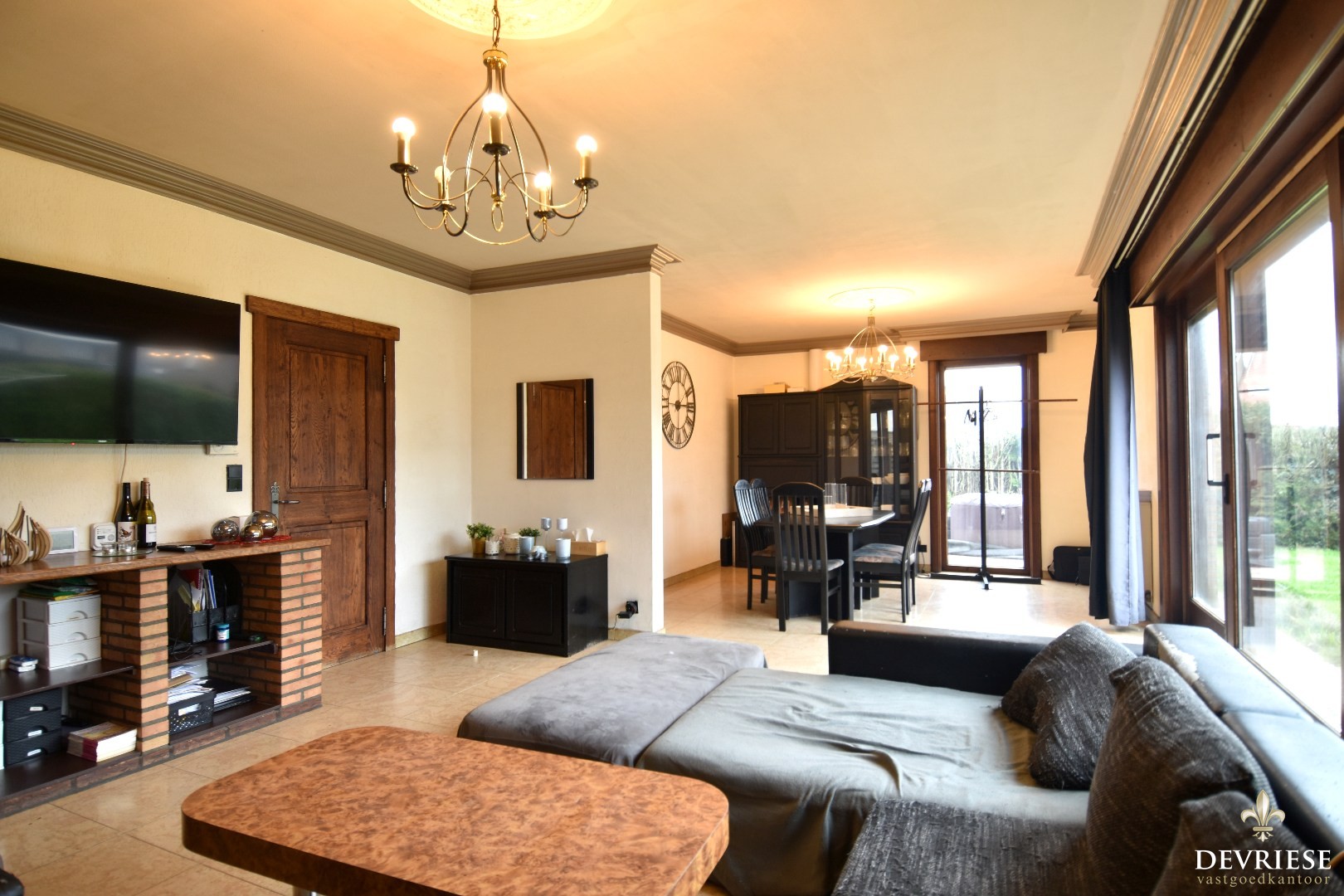 De woning verwelkomt u via een ruime inkomhal die toegang biedt tot de lichtrijke leefruimte, bestaande uit een gezellige zitruimte en eetplaats met houthaard en aangenaam zicht op de tuin. Aansluitend bevindt zich de volledig geïnstalleerde keuken met ontbijthoek. Verder zijn er een praktische wasplaats en een dubbele garage.