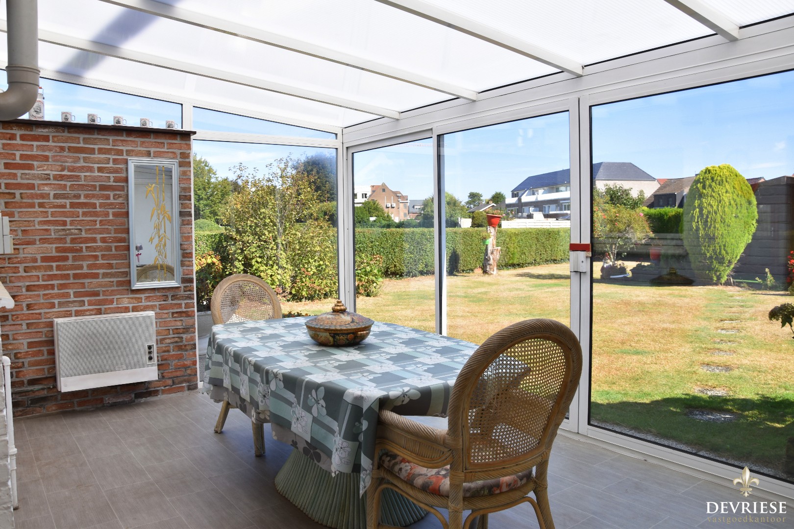 Inkomhal, leefruimte (salon & eetruimte) met aanpalende veranda (alu met dubbele belazing), keuken met eetplaatsvoorziening, inpandige garage/wasplaats en een toilet.