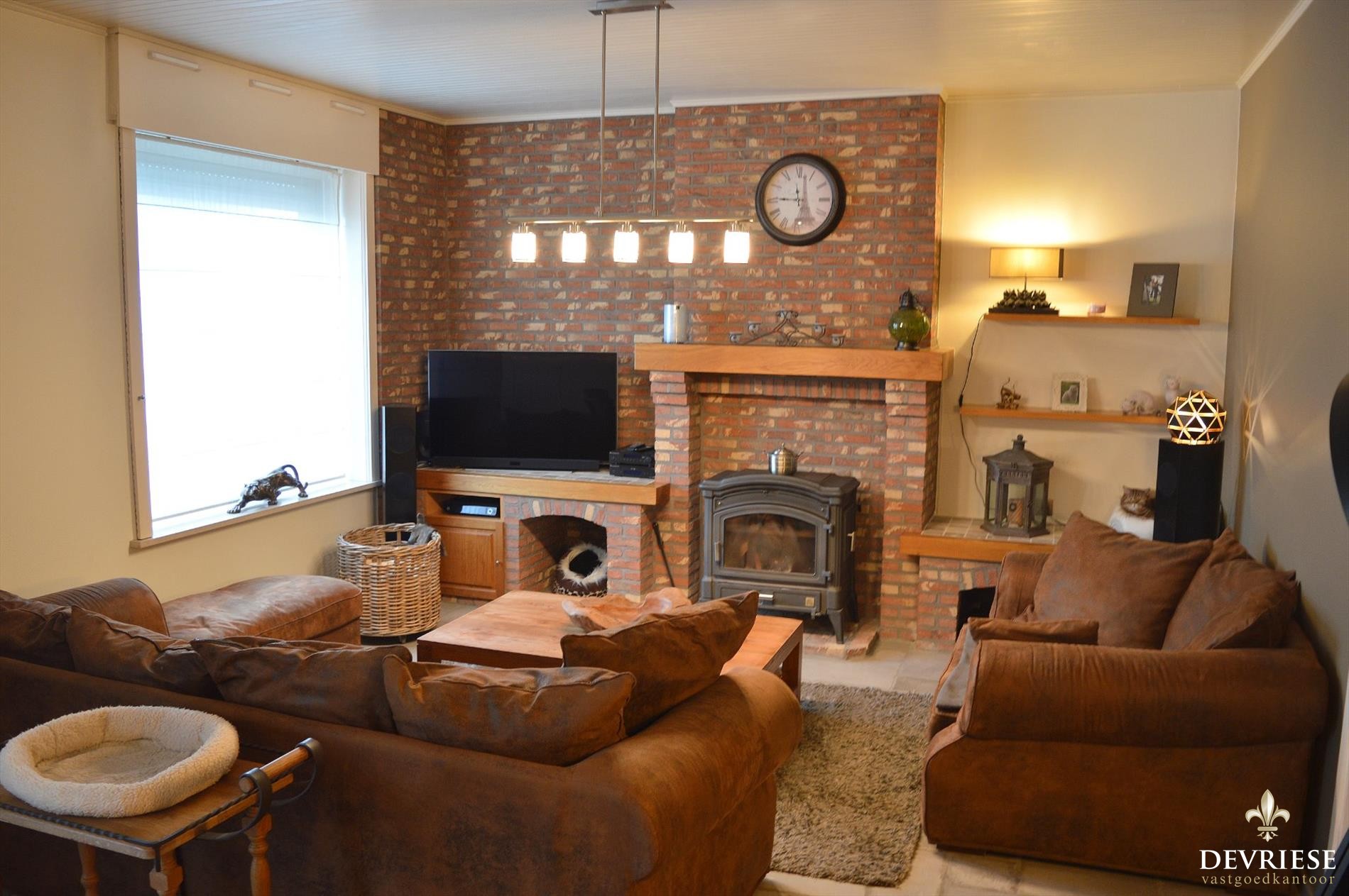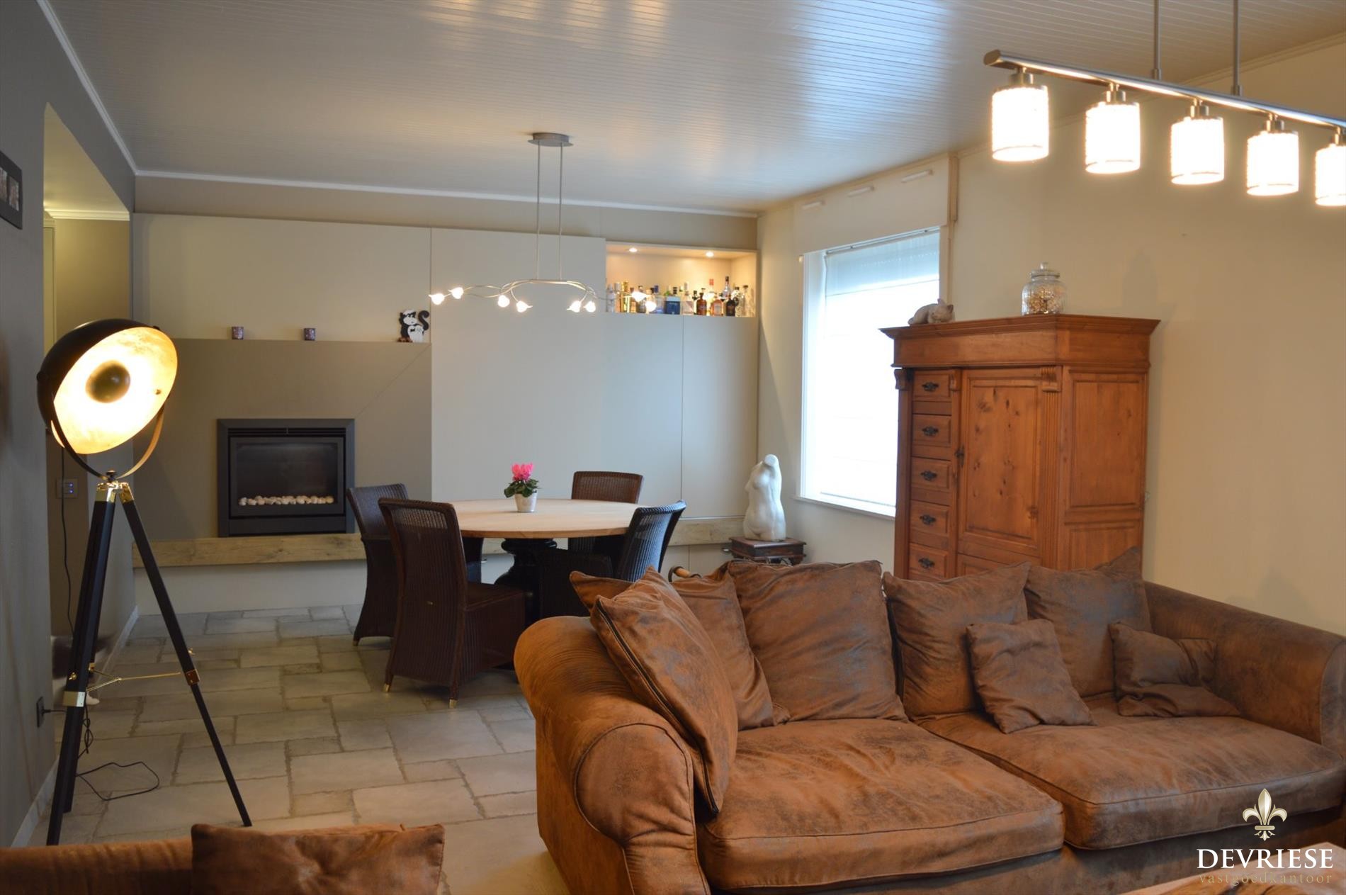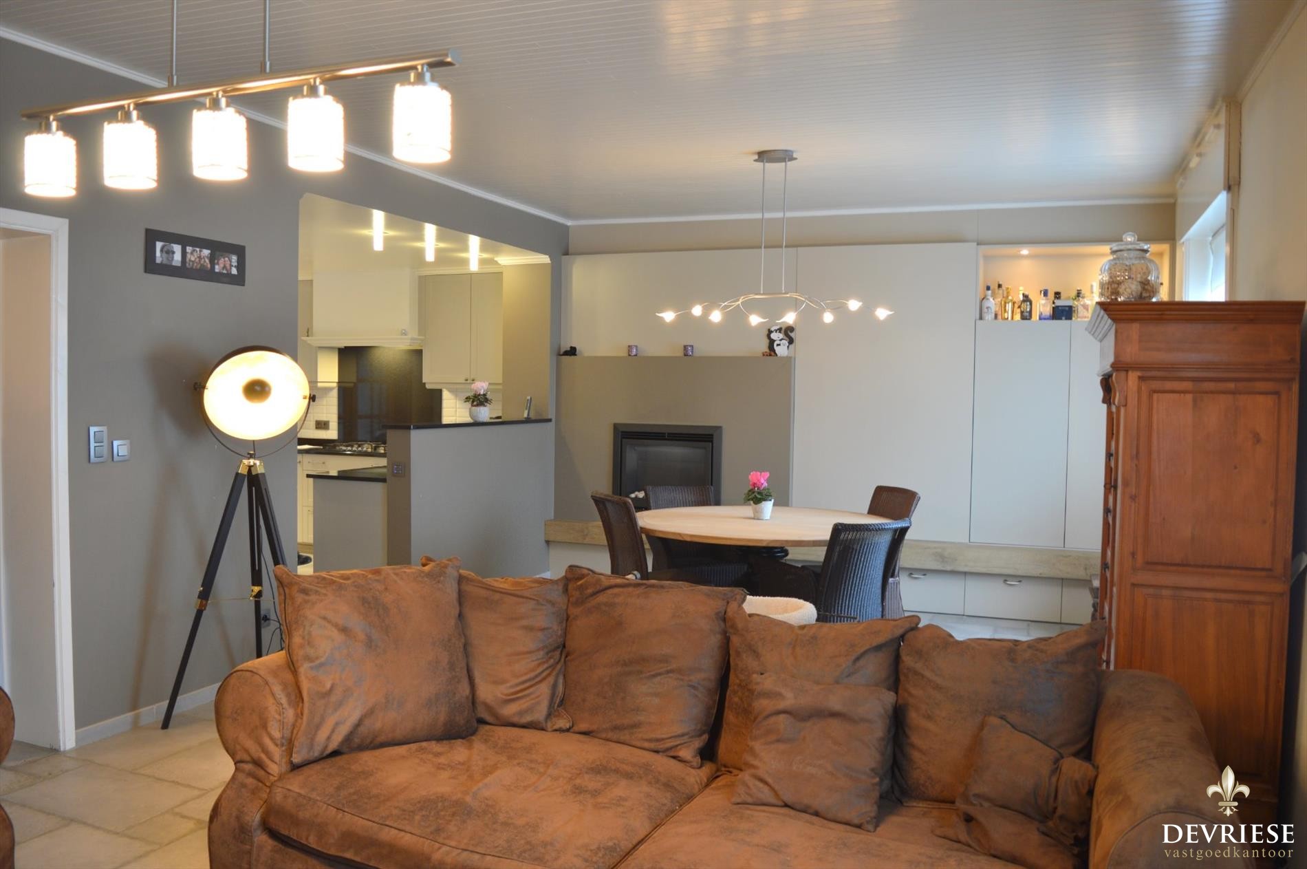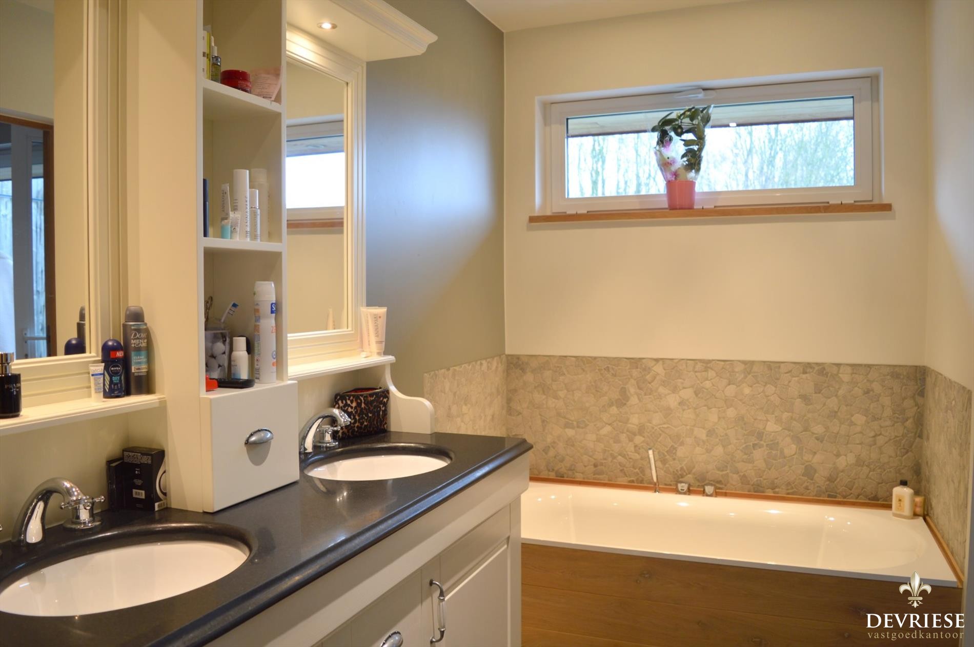 U komt binnen in de apart inkomhal met gastentoilet. Van hieruit is er toegang tot de gezellig ingerichte leefruimte met houtkachel en gaskachel. Daarnaast is er de open keuken die recent vernieuwd werd met een bijhorende bergruimte. Vanuit de keuken komt u in de veranda waar u vol zicht heeft op de tuin. Ook op het gelijkvloers is er de volledig vernieuwde badkamer, voorzien van inloopdouche, dubbele lavabo, een tweede toilet en een ligbad.