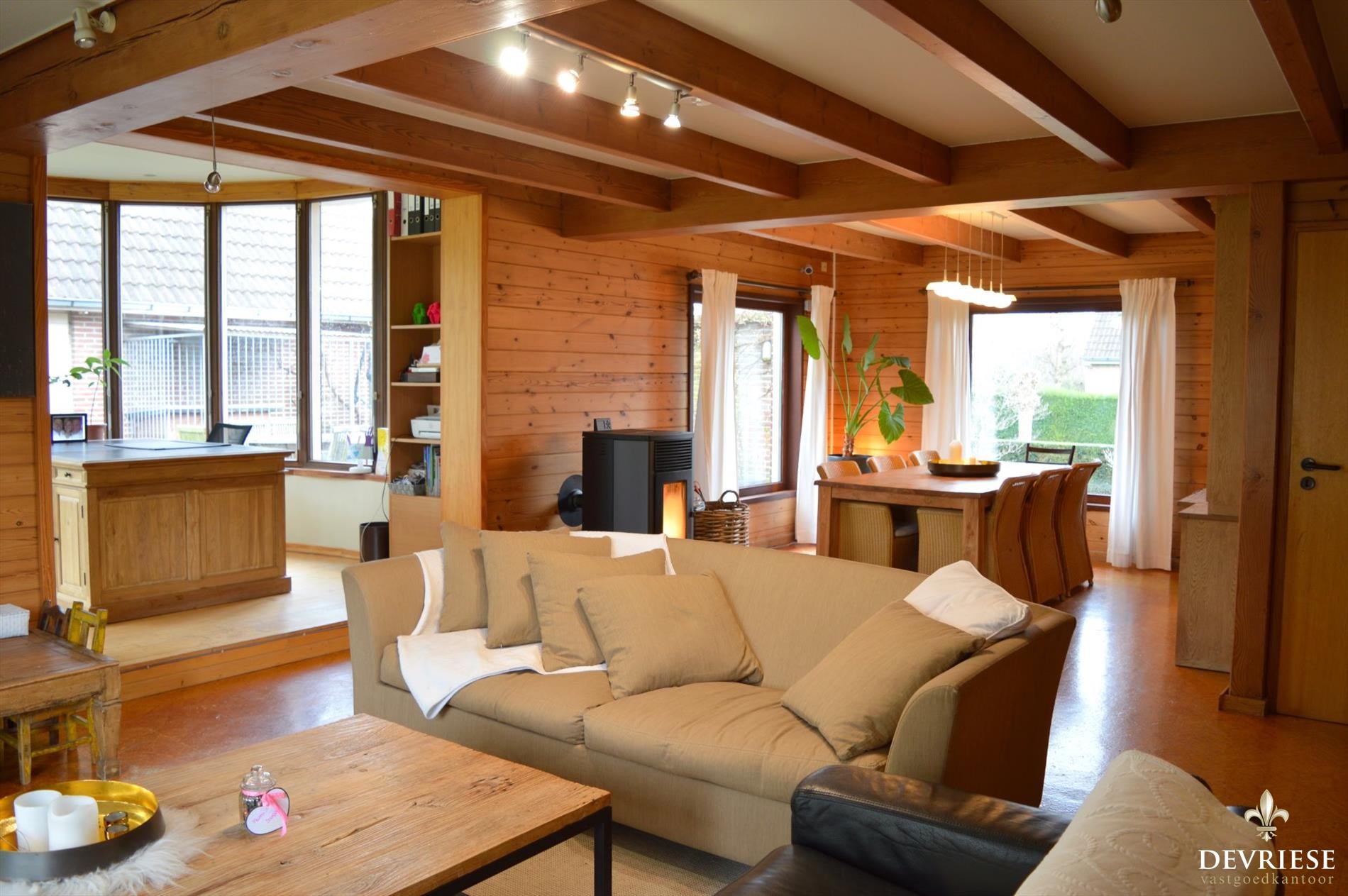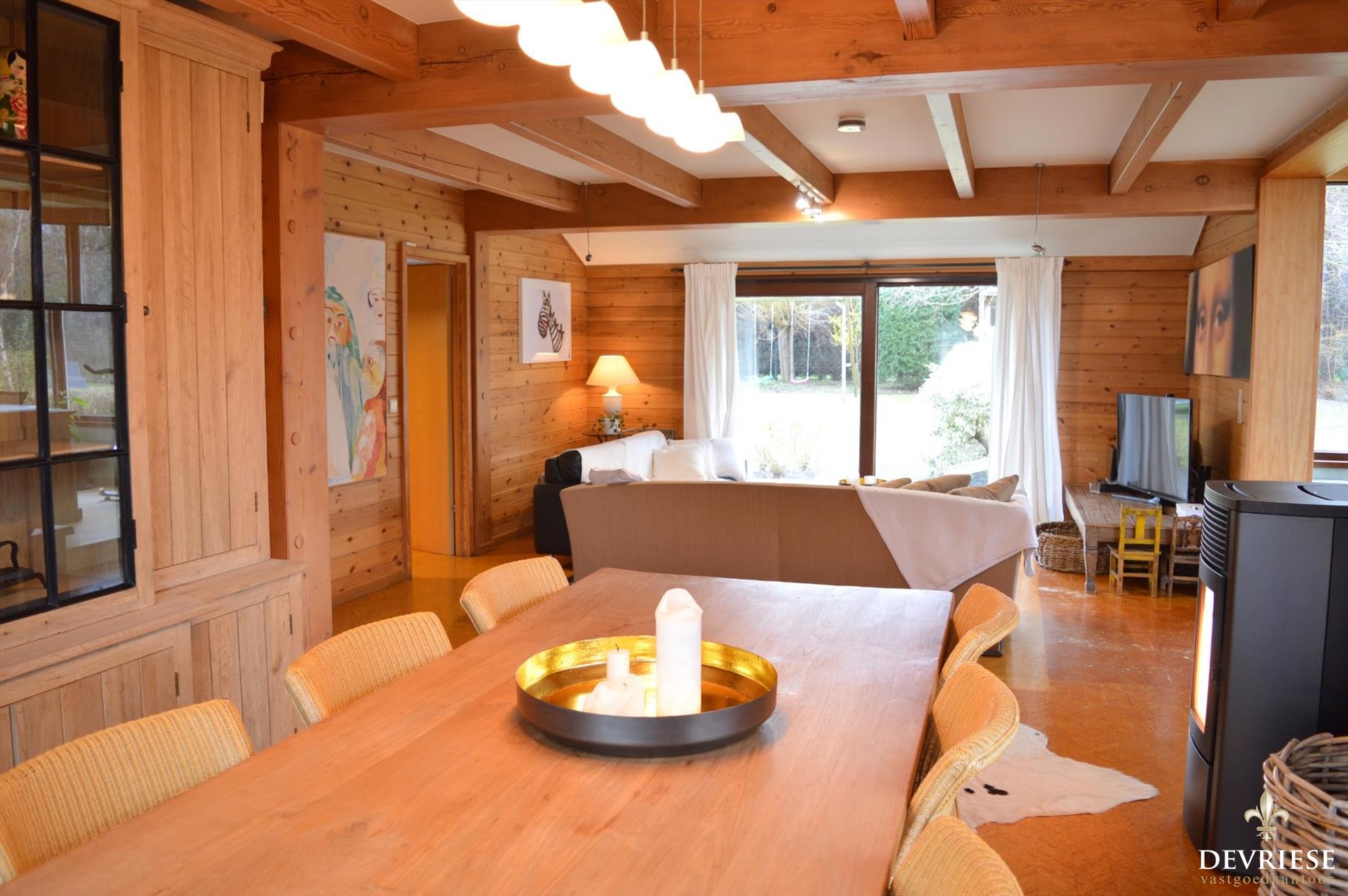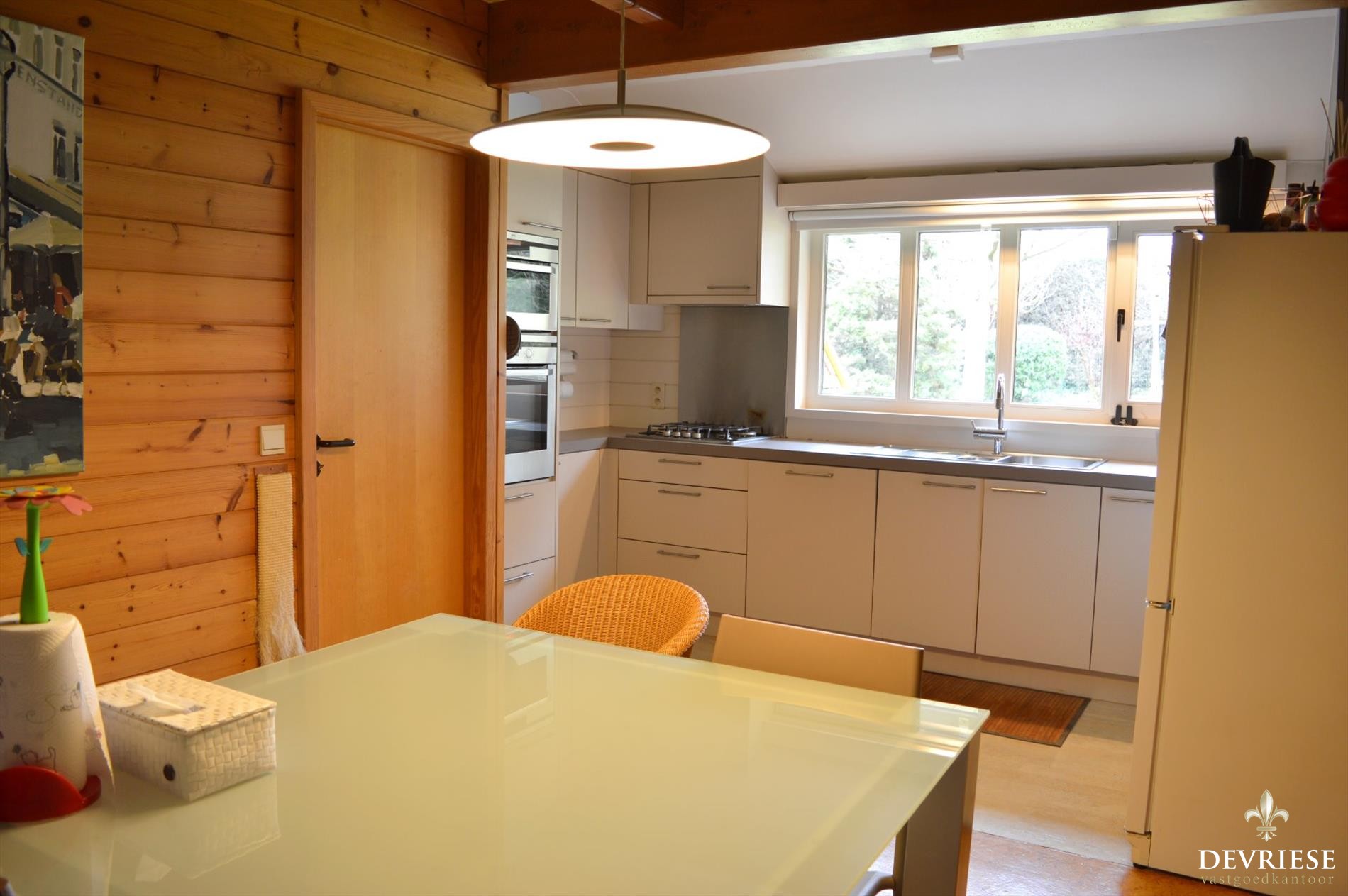 Vanuit de Inkomhal met apart gastentoilet komt u in de ruime leefruimte met mooi zicht op de tuin en het groen rondom en bovenal een schitterende lichtinval doorheen de dag. Aansluitend bij de leefruimte is er de aantrekkelijke uitbouw die voorziet in extra ruimte, ideaal als open bureau of speelruimte voor de kinderen. De aanwezigheid van de pelletkachel geeft gezelligheid en aangename warmte. De moderne ingerichte keuken werd recent vernieuwd en heeft vol zicht op de tuin, met aansluitend een handige berging.