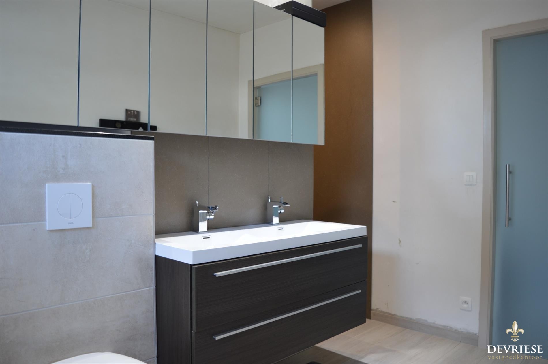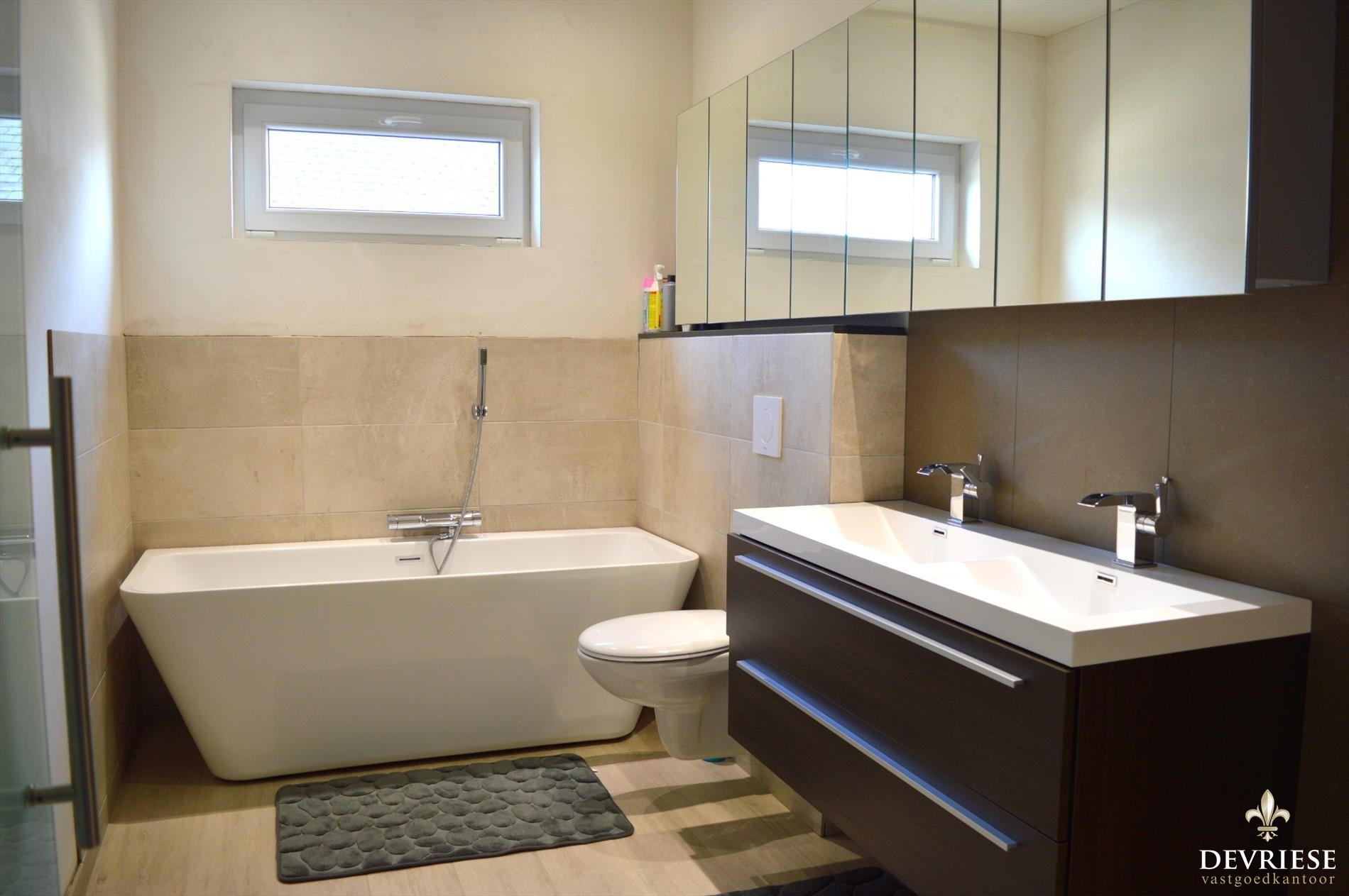 Ook nieuwe badkamer spreekt tot de verbeelding met zeer fijne materialen en voorzien van inloopdouche, bad en dubbel lavabo meubel.