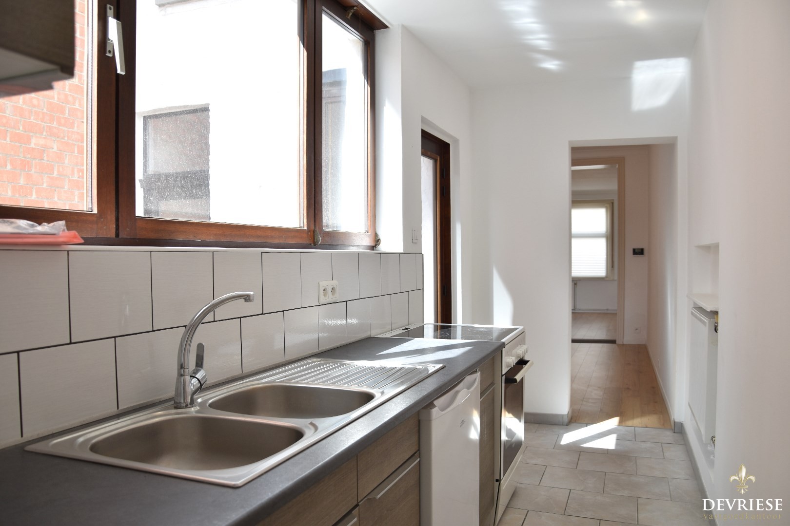 Inkomhal, tweedelige leefruimte en een knap uitgeruste keuken.