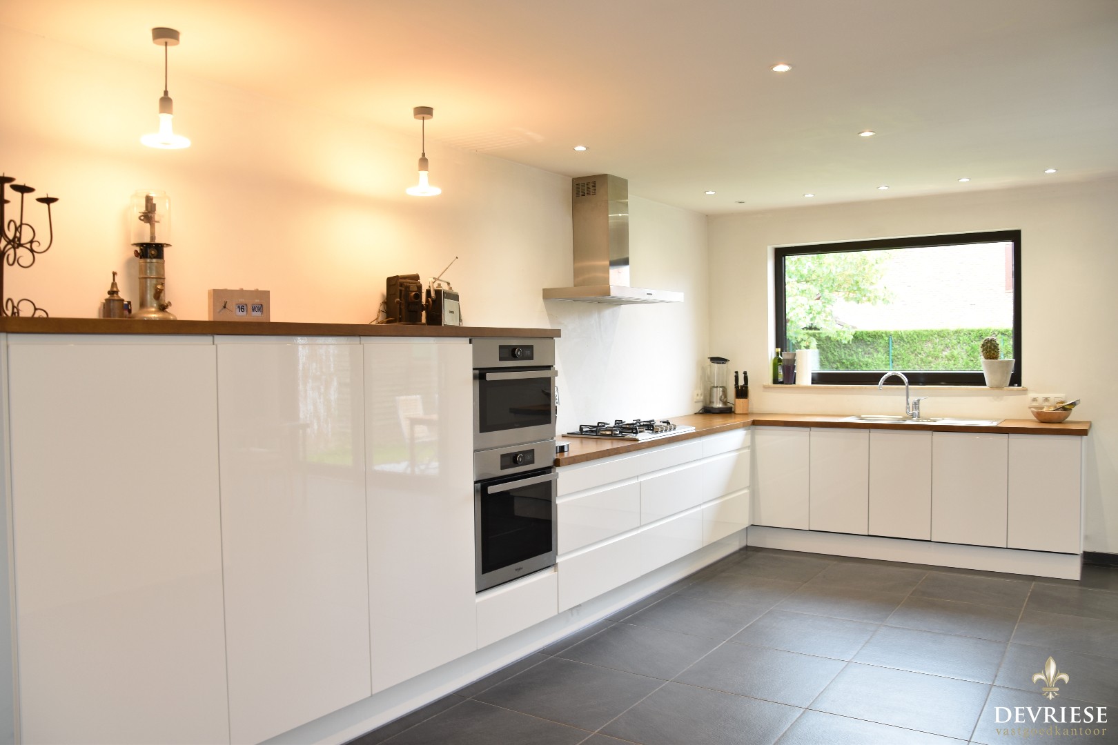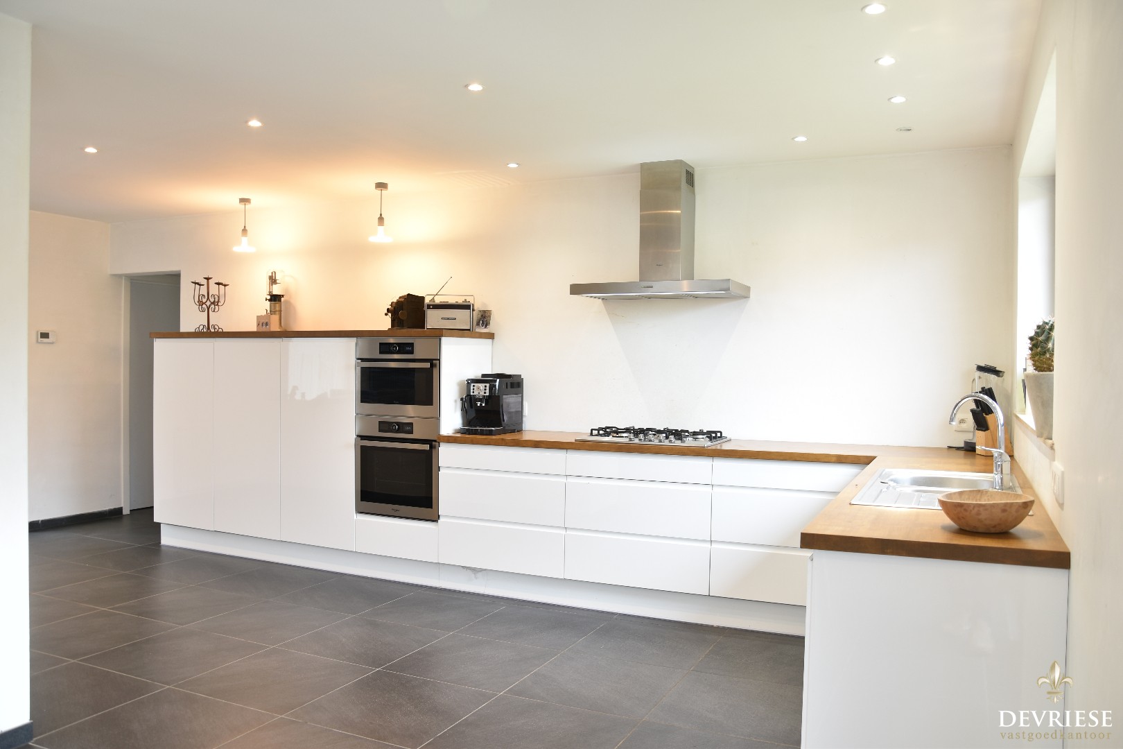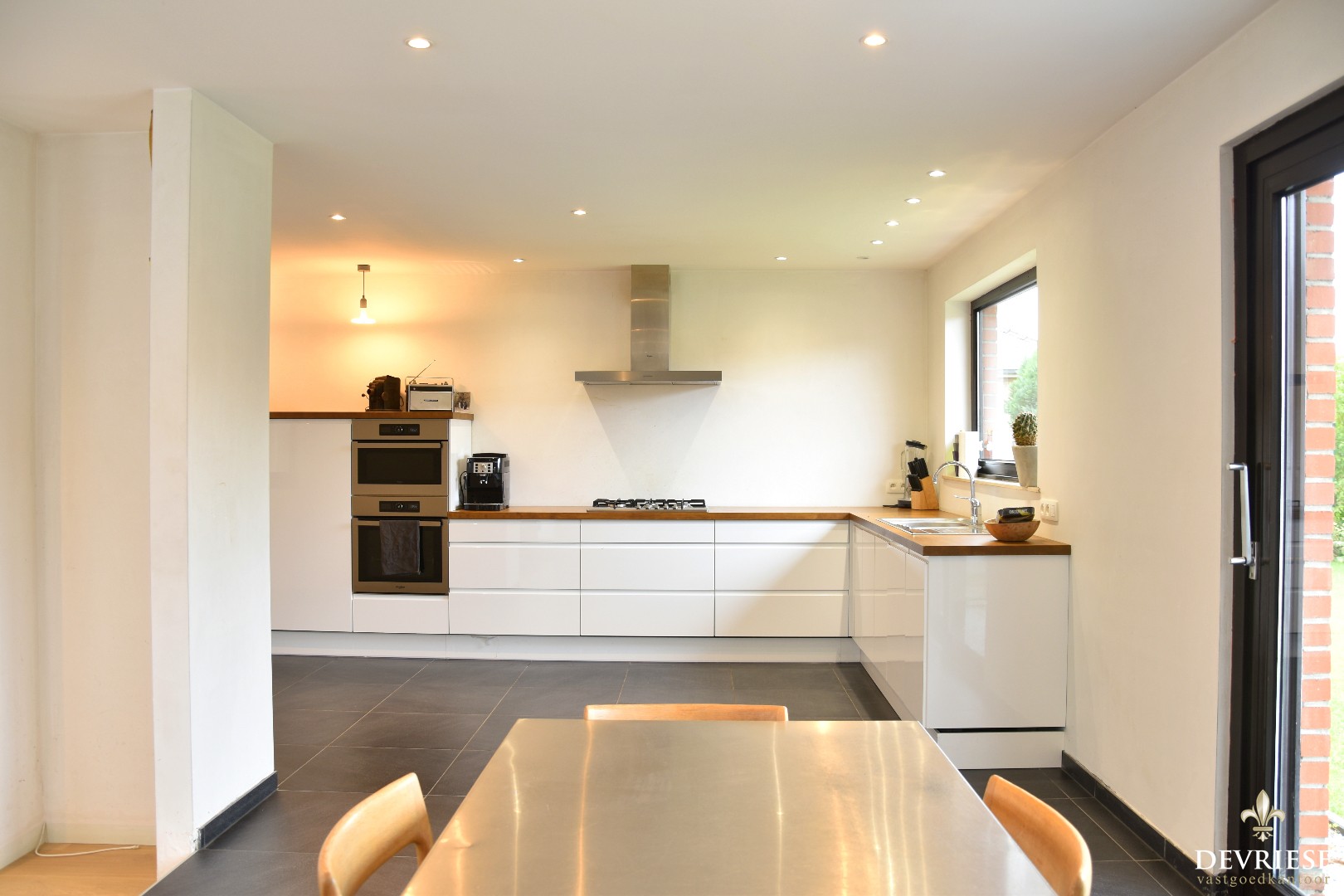 Het huis omvat een lichtrijke leefruimte met eet- en zithoek. Aanpalend is er een open en ingerichte leefkeuken, voorzien van alle toestellen.