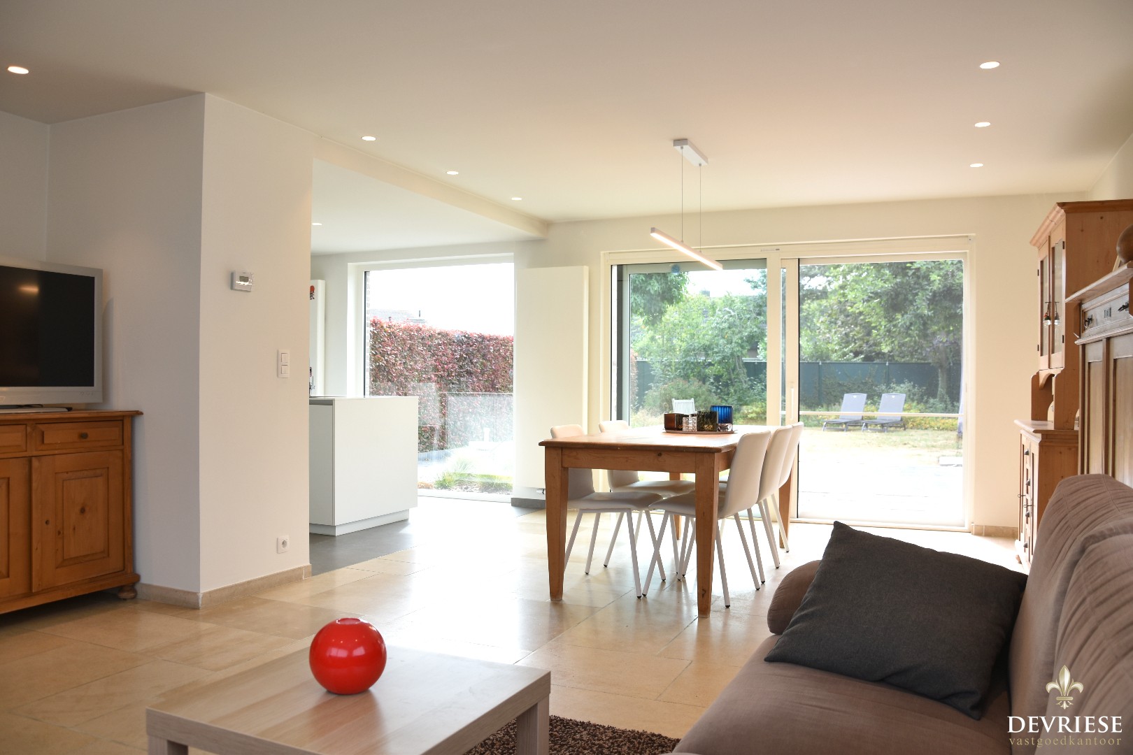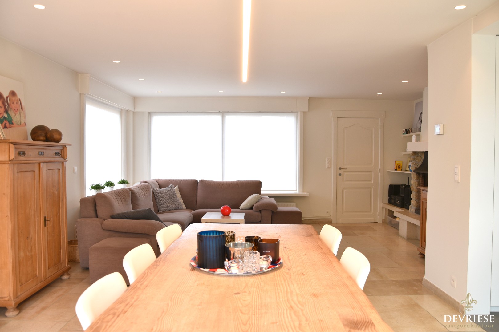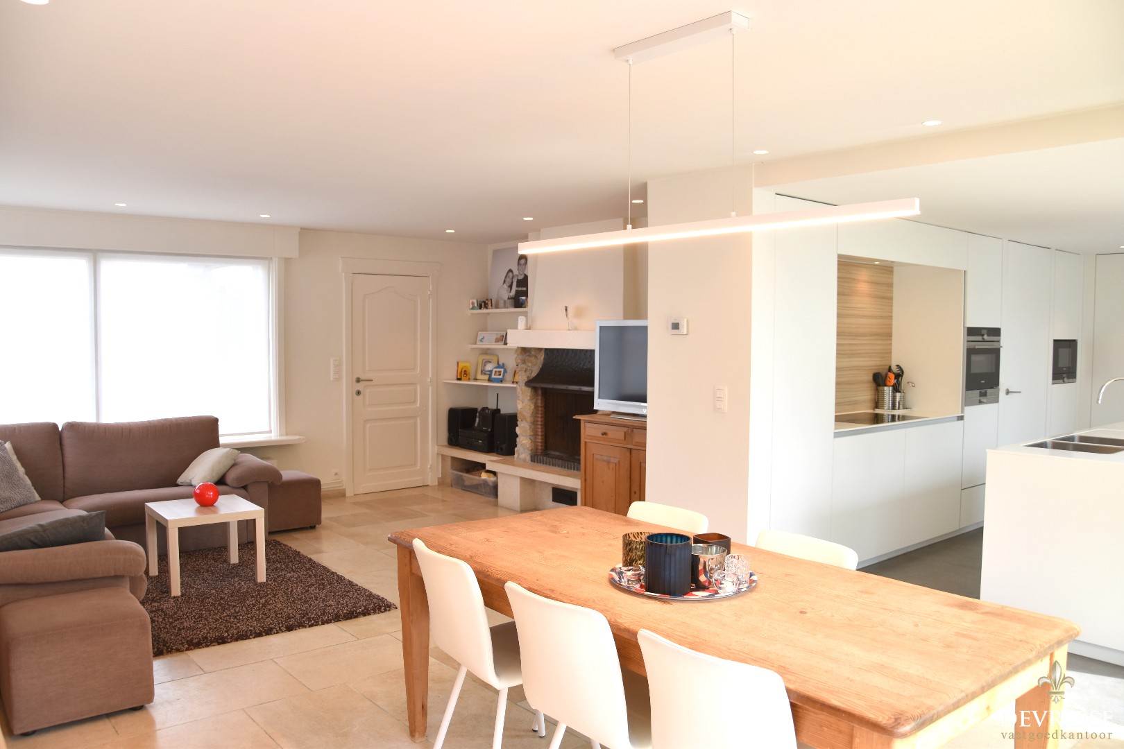 Inkomhal met ingemaakte vestiaire en apart toilet. Van hieruit kunt u meteen naar het aangename leefgedeelte, opgedeeld in een salon -en eetplaatsvoorziening. Een open haard die zorgt voor een gezellige warmte én veel natuurlijk licht vanwege de grote raampartijen.