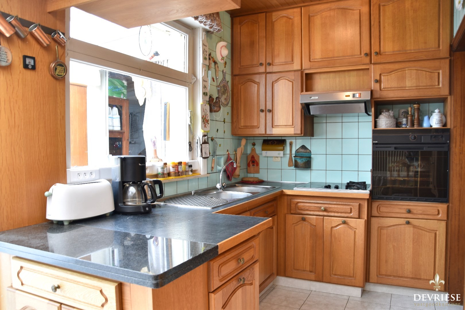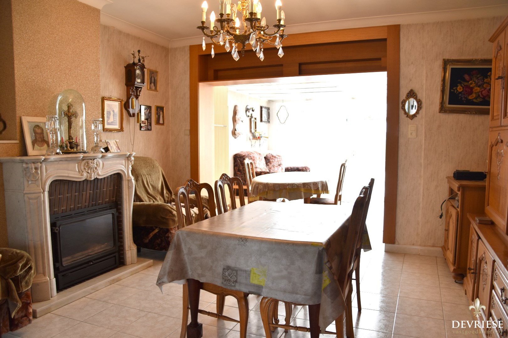 Inkomhal met directe doorgang tot het leefgedeelte. Salon met eetplaats die zich verder doortrekt naar de veranda. Geïnstalleerde keuken met een gezellige ontbijthoek.
