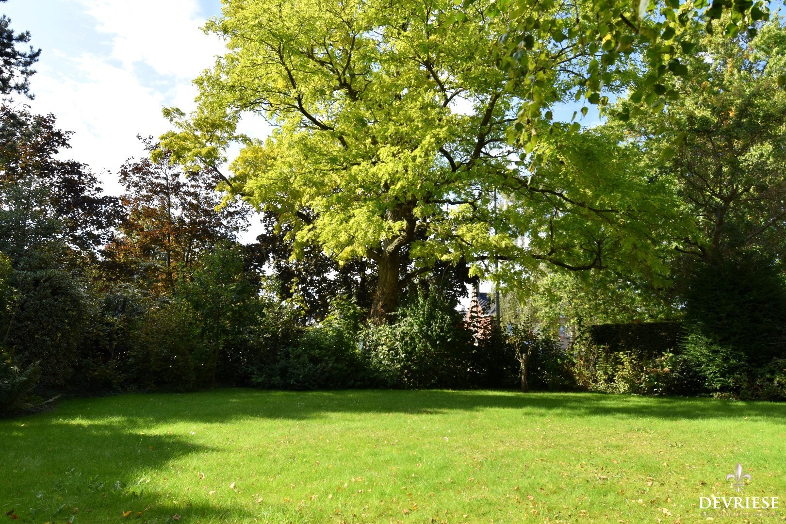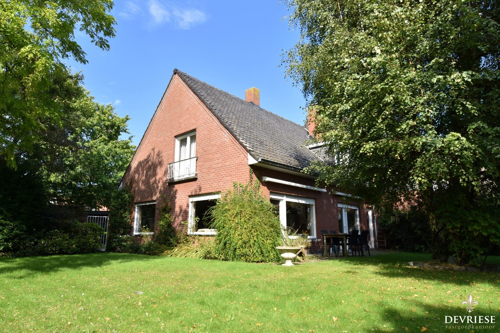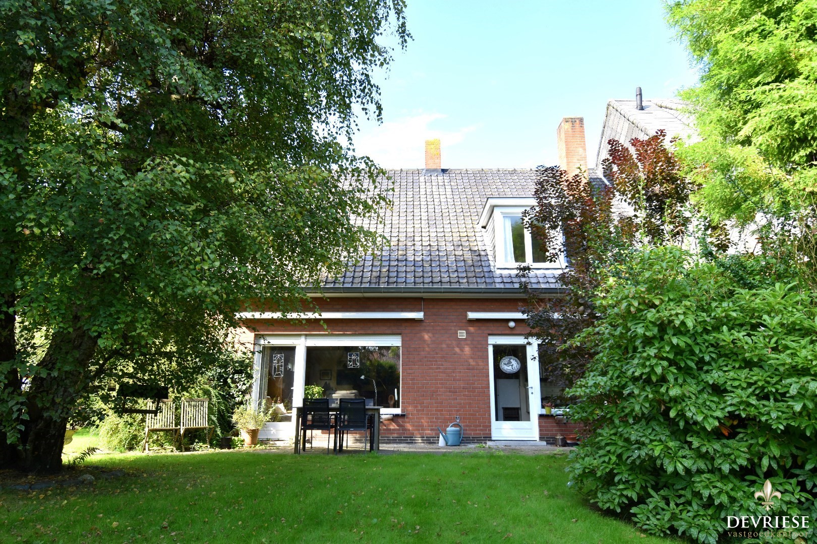 De prachtige tuin vormt een groene oase, omringd door bomen. Hier kan je in alle rust en privacy genieten van het buitenleven.
