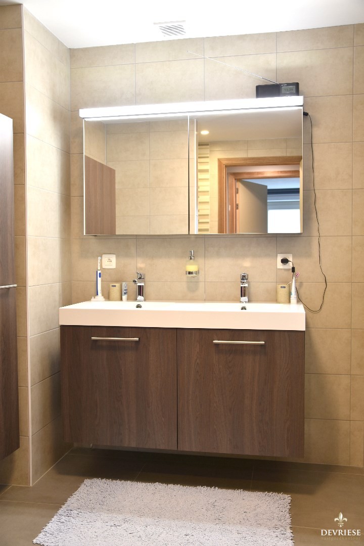 Op de eerste verdieping bevinden zich 3 slaapkamers, waarvan één momenteel is ingericht als dressing. De moderne badkamer is uitgerust met een inloopdouche, een dubbel lavabomeubel en biedt volop opbergruimte. Daarnaast is er een apart toilet aanwezig.