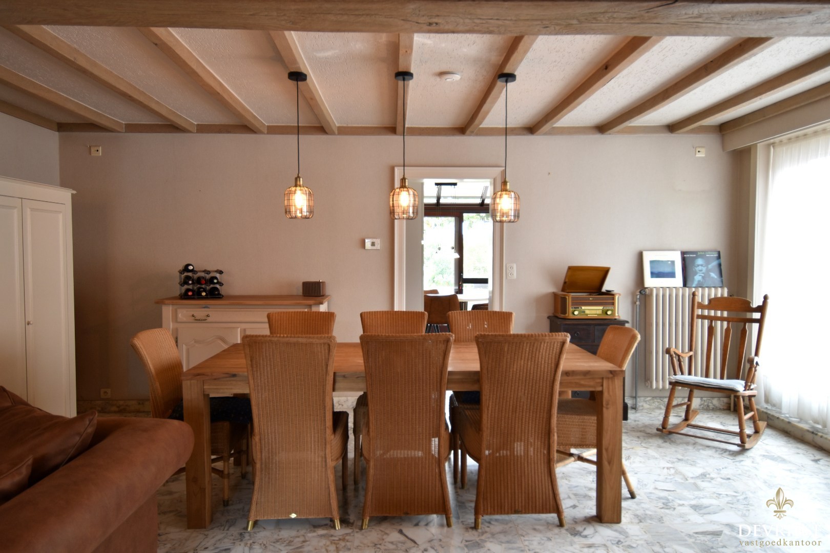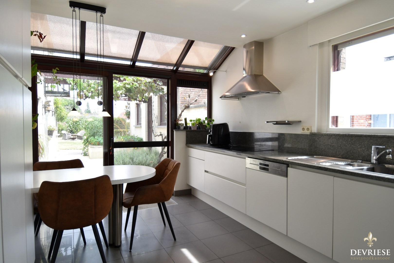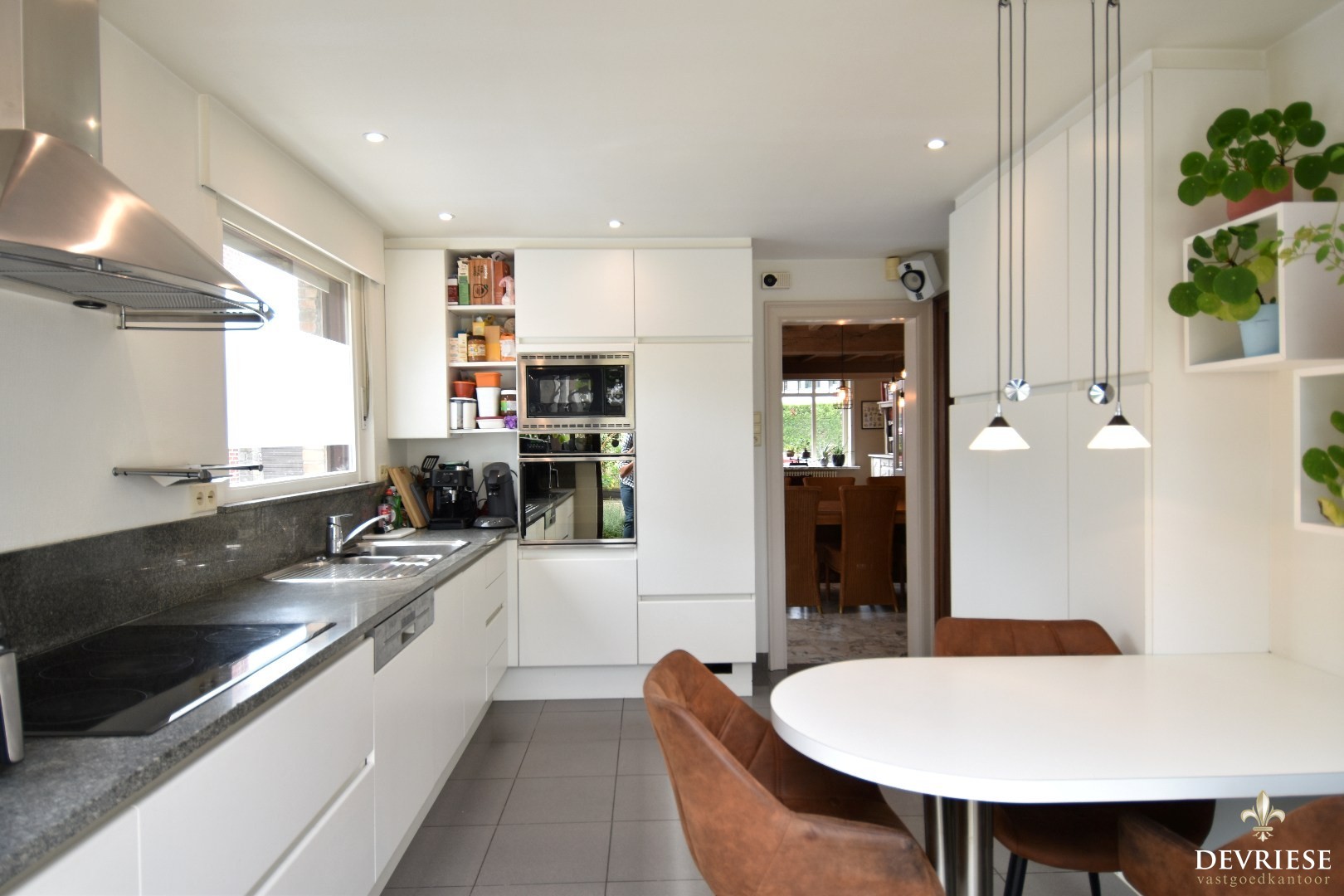 De woning verwelkomt je met een ruime inkomhal en biedt een lichtrijke leefruimte met aanpalende eetplaats. Aansluitend bevindt zich een gezellige voorkamer die perfect kan dienen als leeshoek, bureau of hobbyruimte. De volledig uitgeruste keuken met ontbijthoek sluit mooi aan en kijkt uit op de tuin.