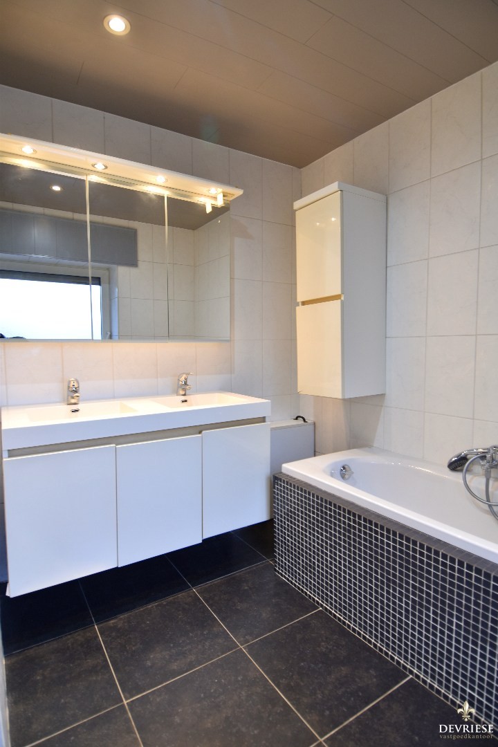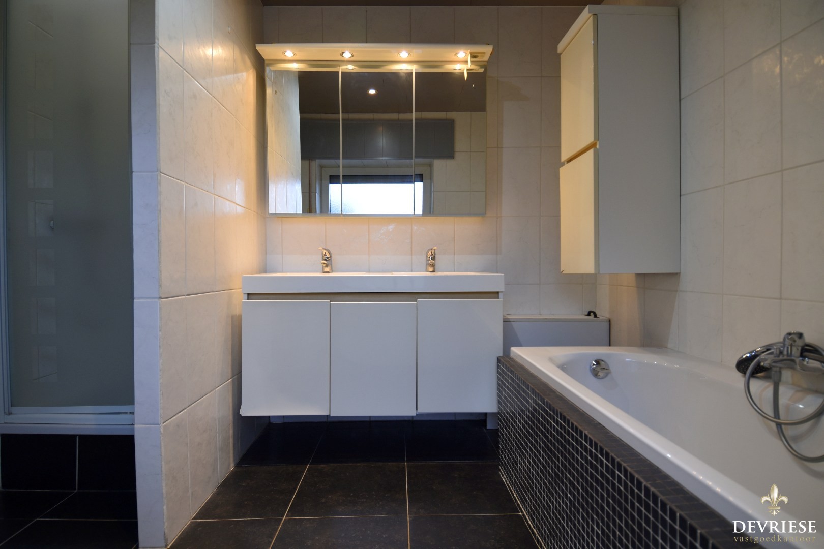 De gelijkvloerse badkamer is uitgerust met een ligbad, douche en dubbele lavabo.