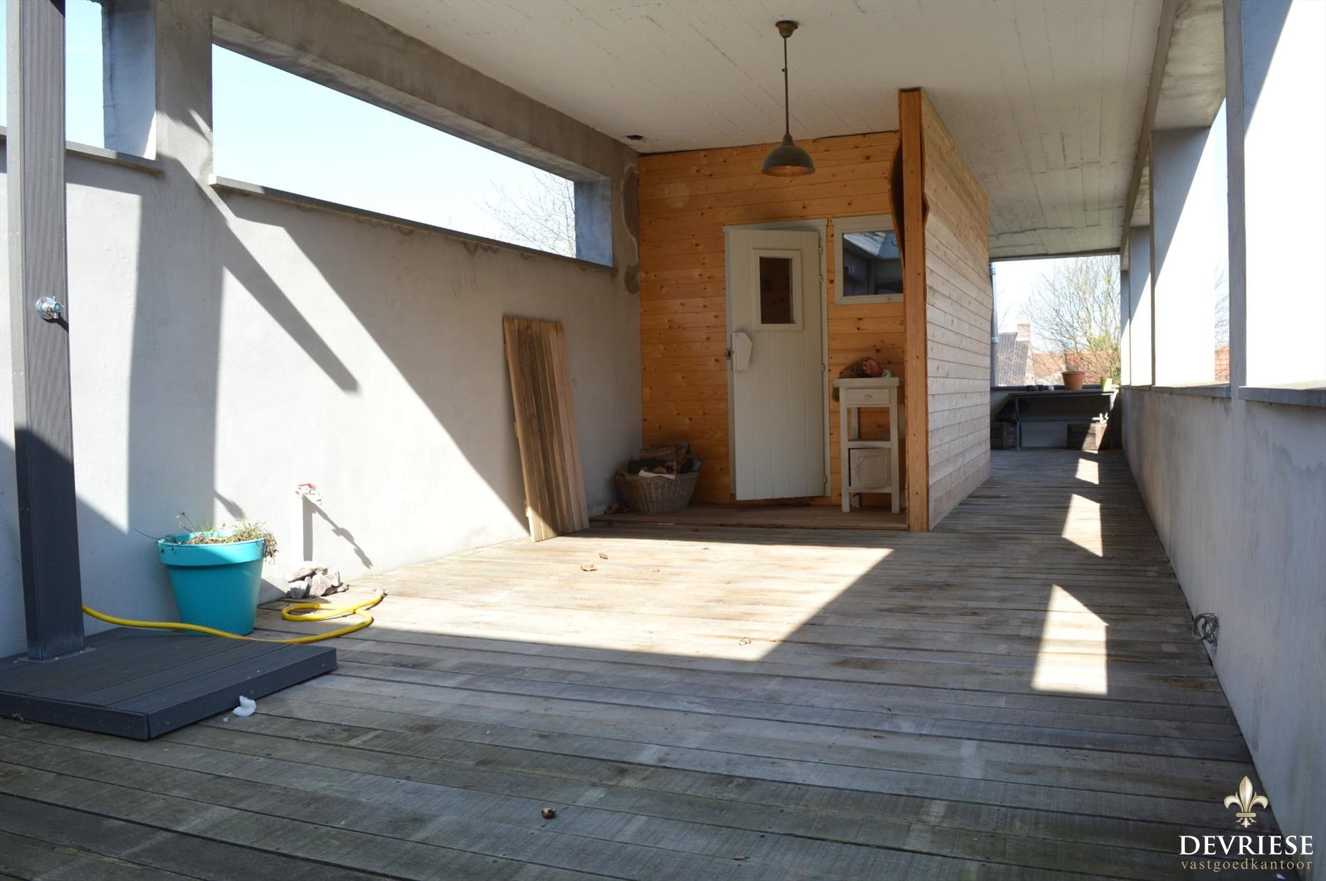 De eerste verdieping werd deels opengewerkt met hoofdslaapkamer die grenst aan de eerste badkamer, open bureau met zicht op de tuin, daarnaast nog twee slaapkamers, een aparte dressing en tweede badkamer met ... inloopdouche. Daarenboven werd er op de eerste verdieping een schitterend terras gecreëerd waar het zalig vertoeven is in de zomermaanden en ook voorzien van sauna. Eén woord..., genieten....