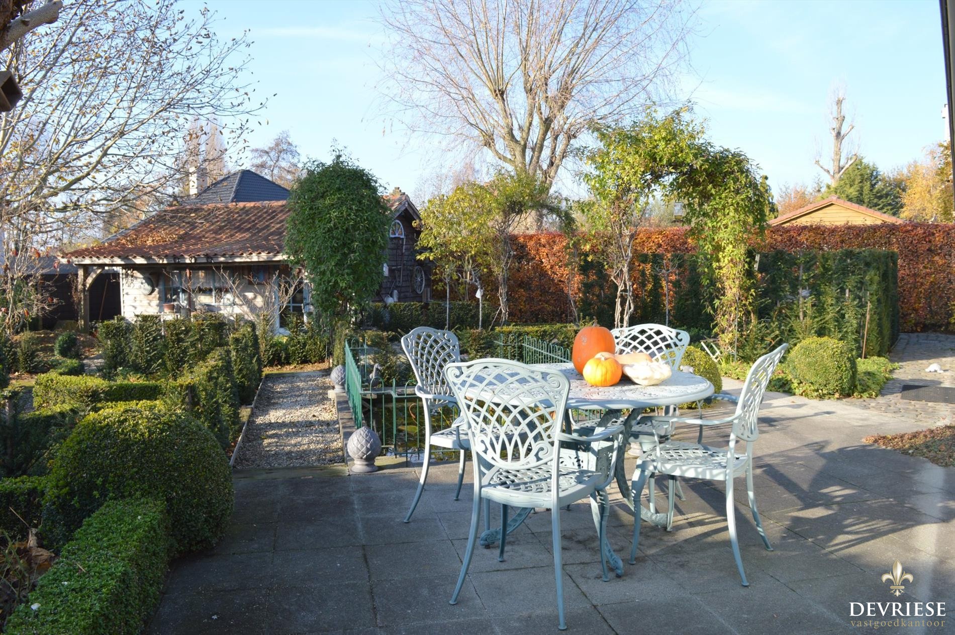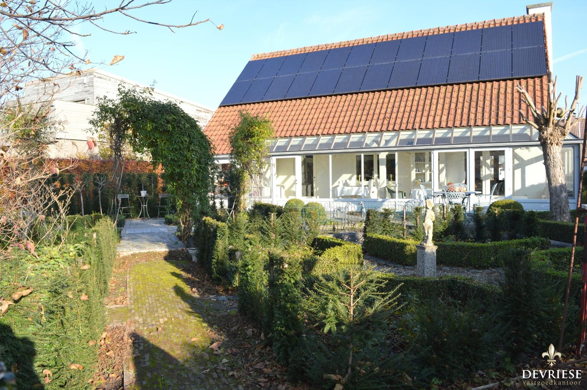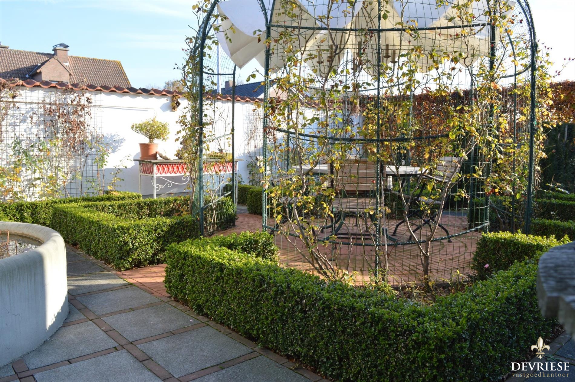 Zowel achteraan als op de zijkanten is de tuin zeer mooi aangelegd met verschillende terrassen waar het op elk moment van de dag geniet is.