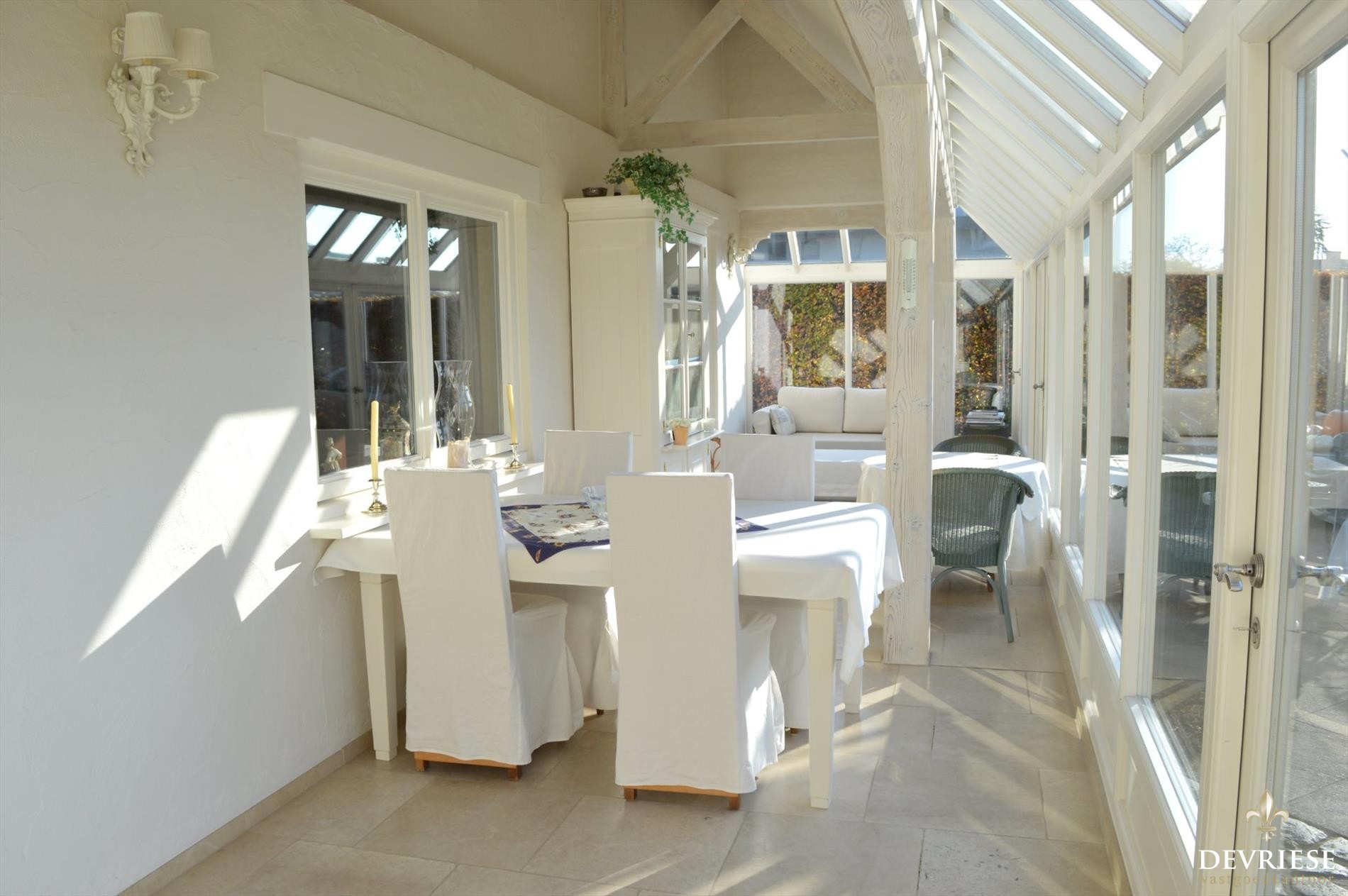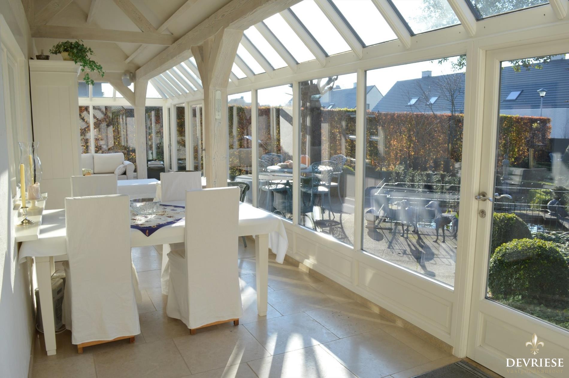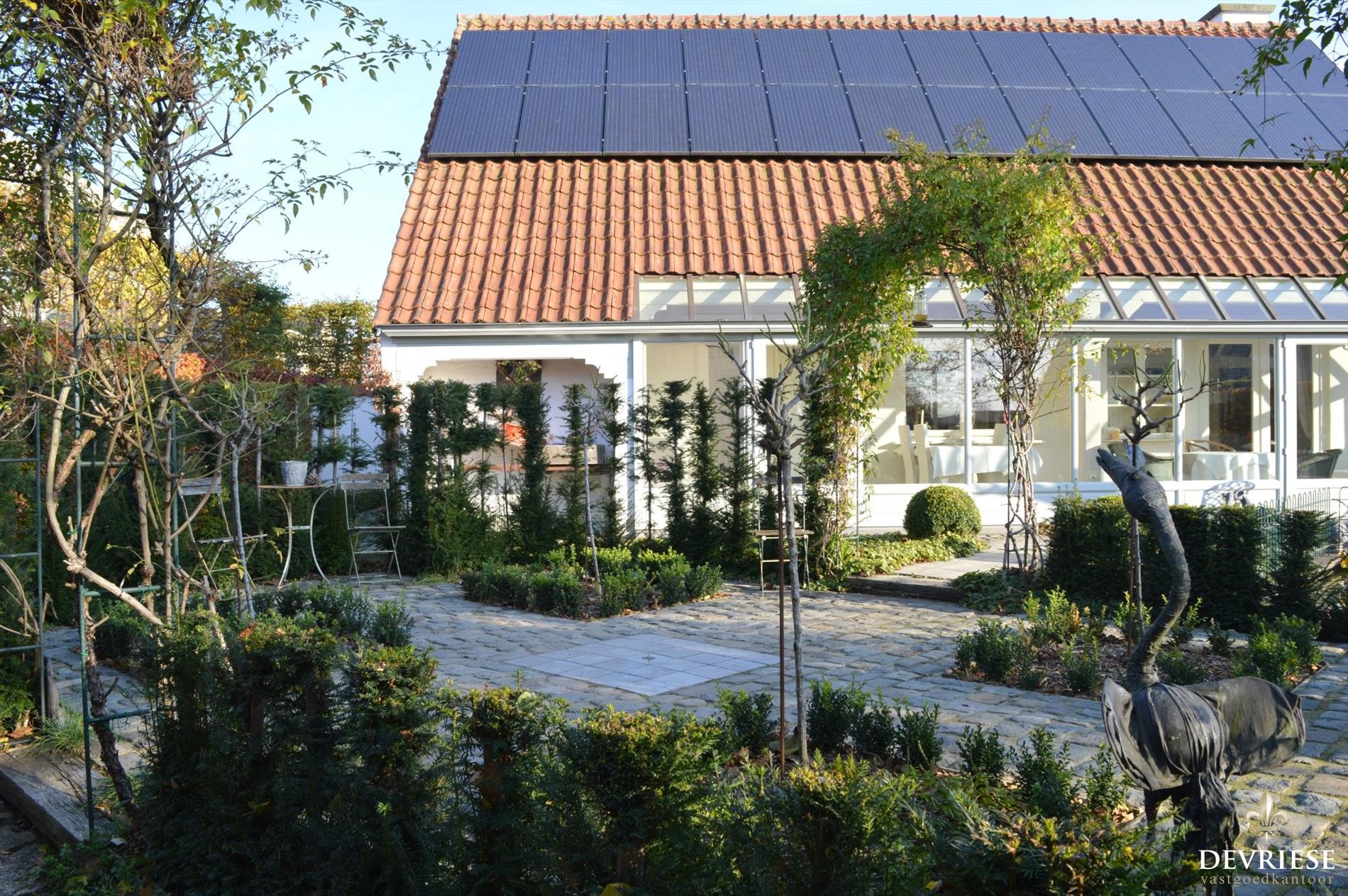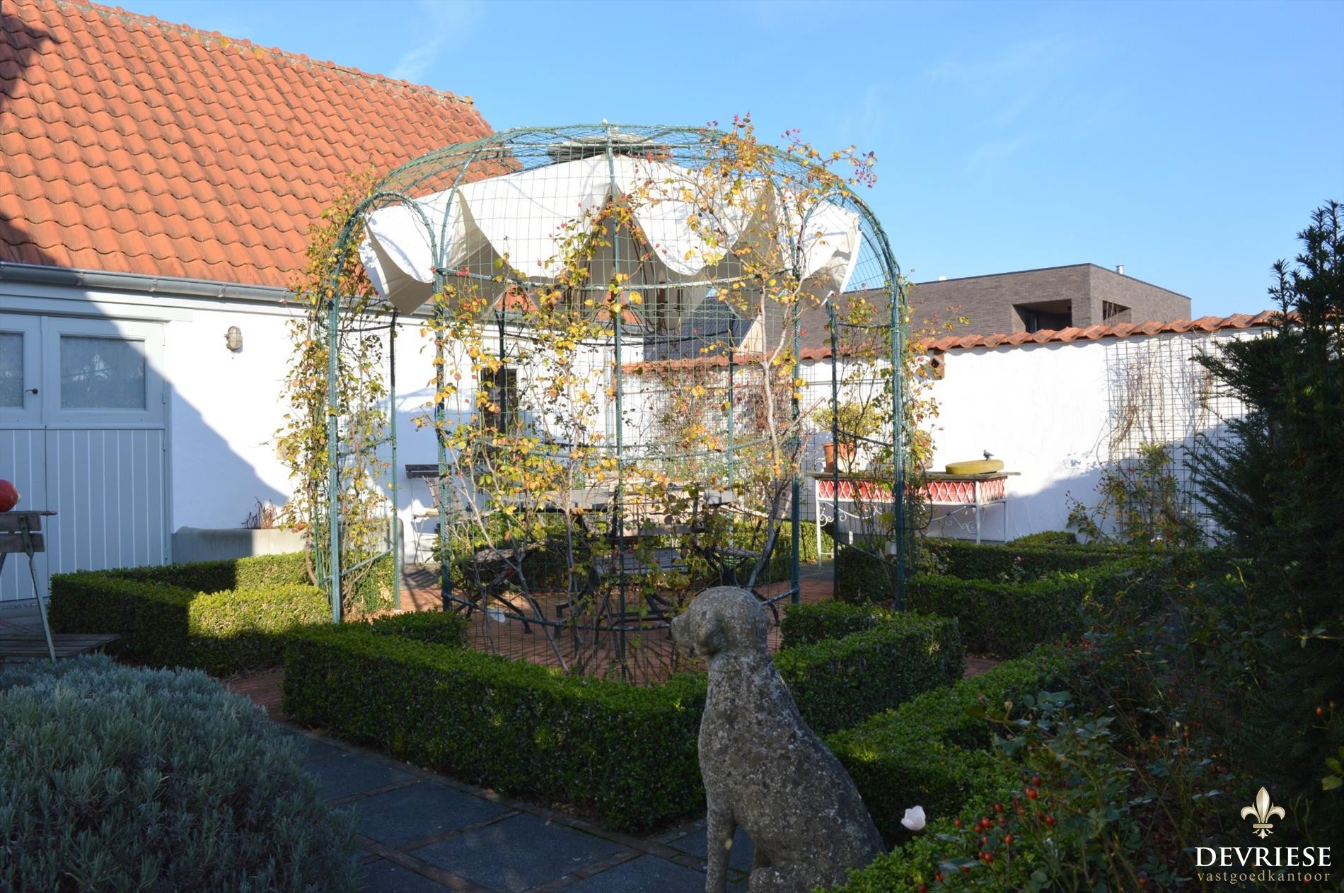 Zowel achteraan als op de zijkanten is de tuin zeer mooi aangelegd met verschillende terrassen waar het op elk moment van de dag geniet is.