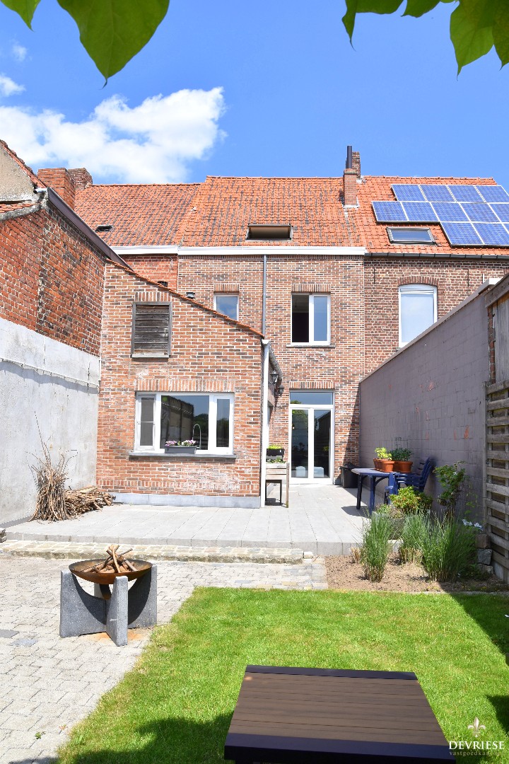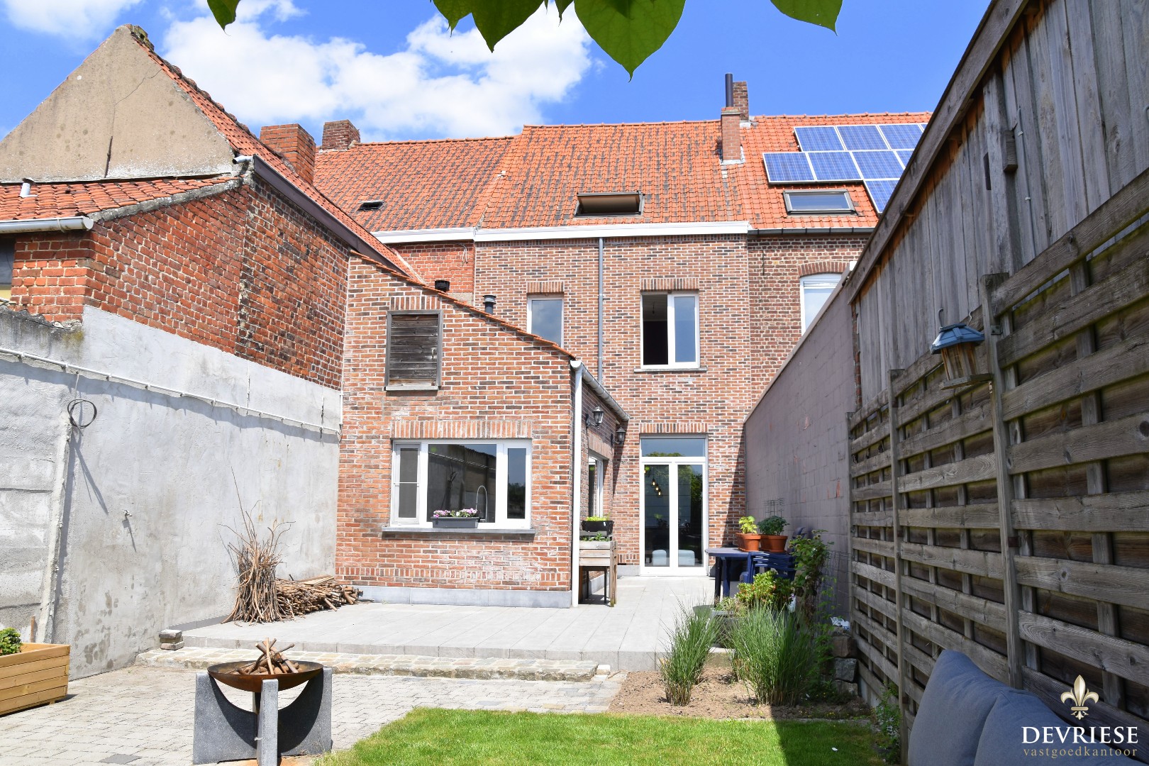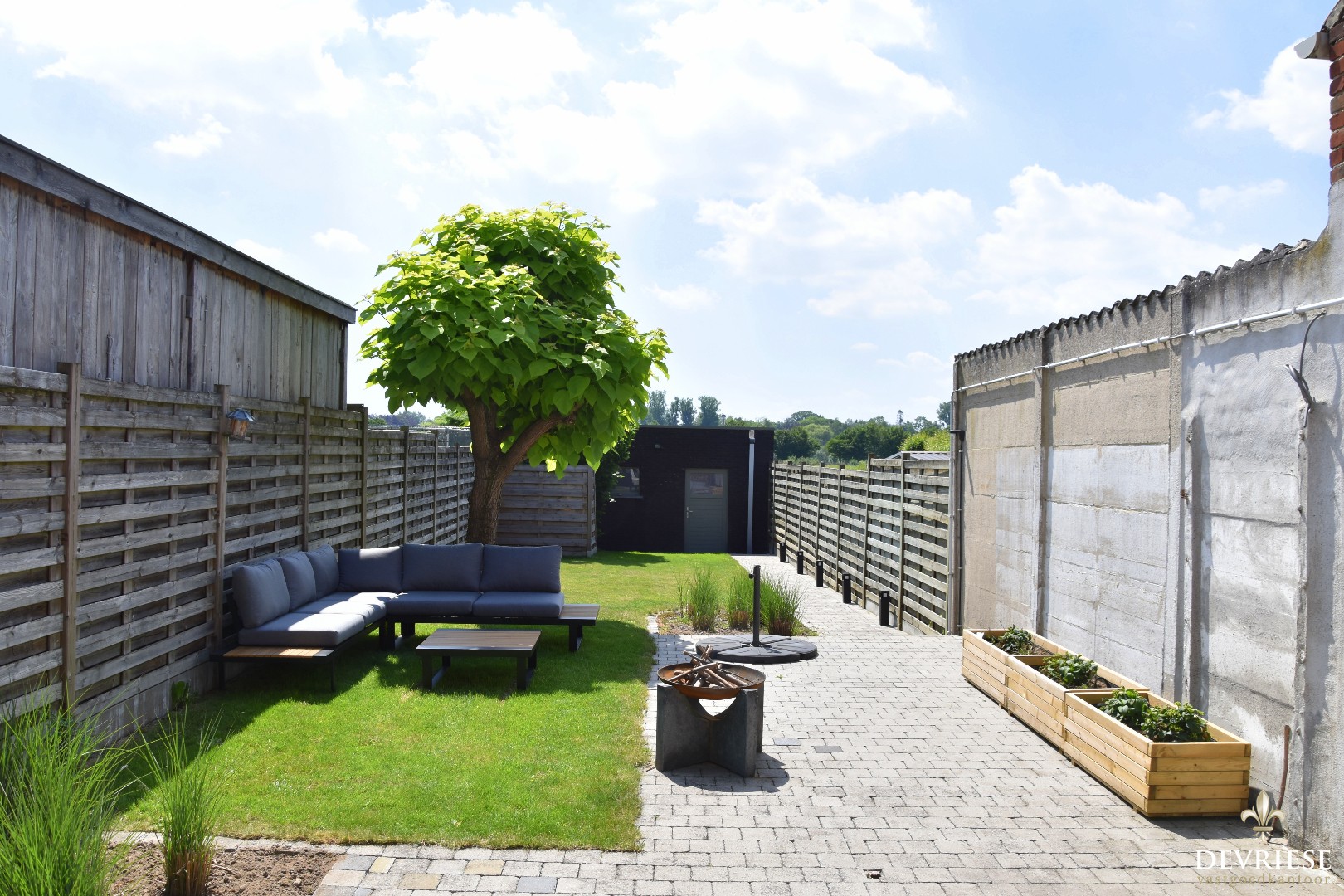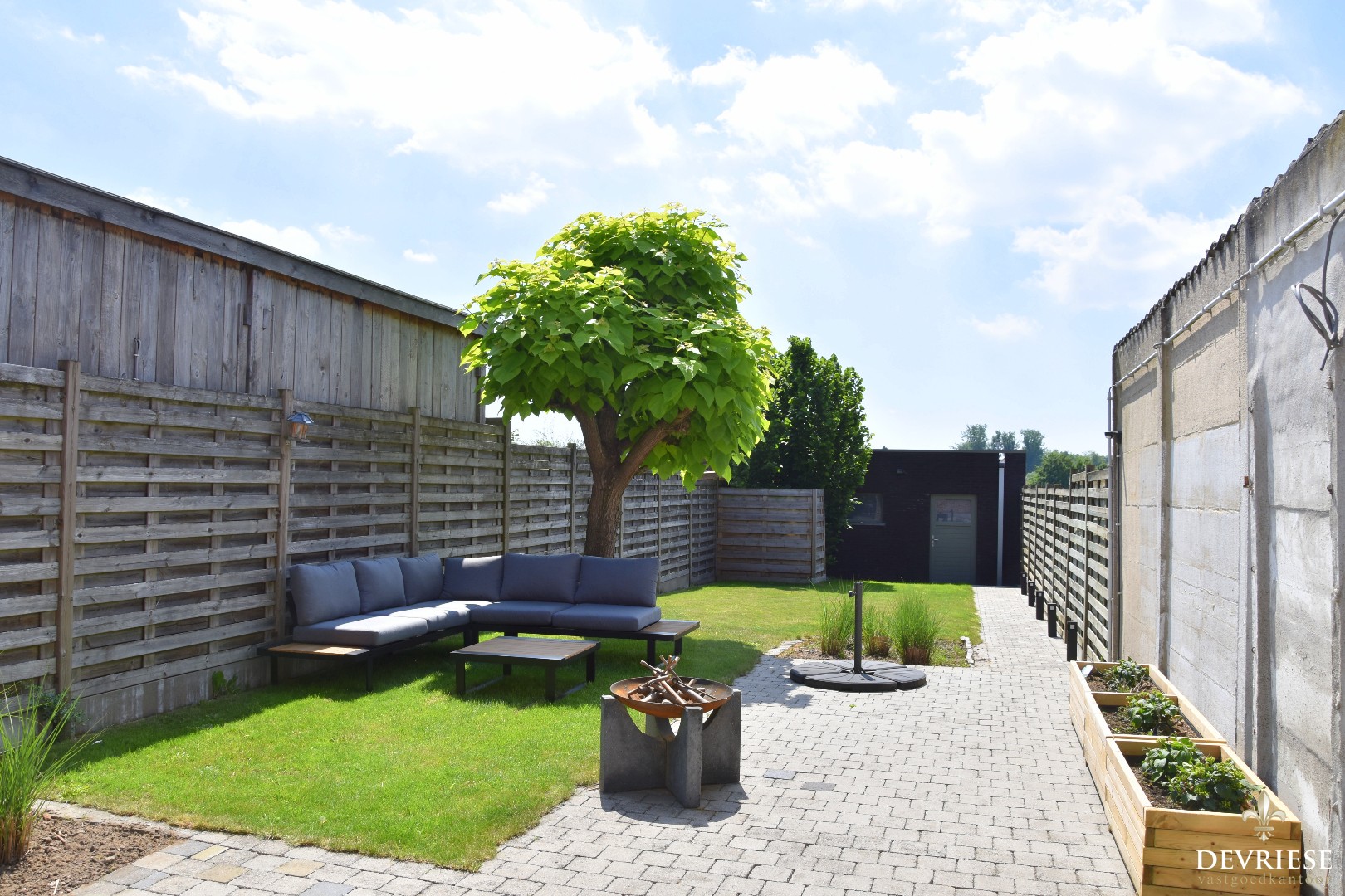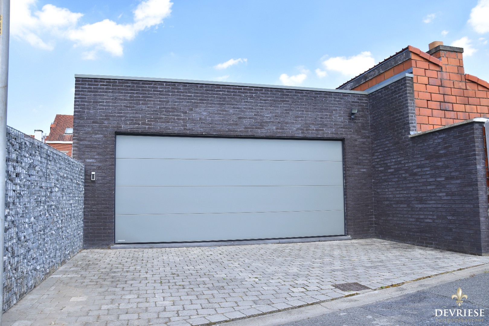 Aangelegde tuin met zuid-oriëntatie en toegang tot de dubbele garage. Deze is ... voorzien van elektrische poort en biedt uitweg achteraan.