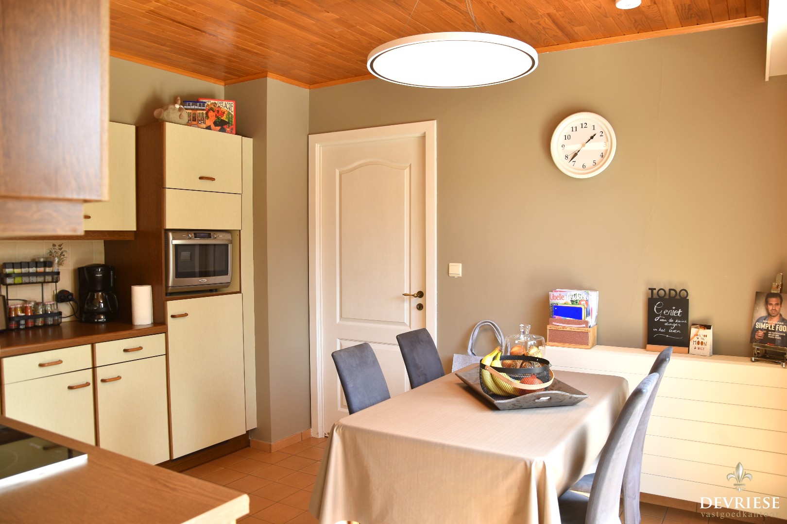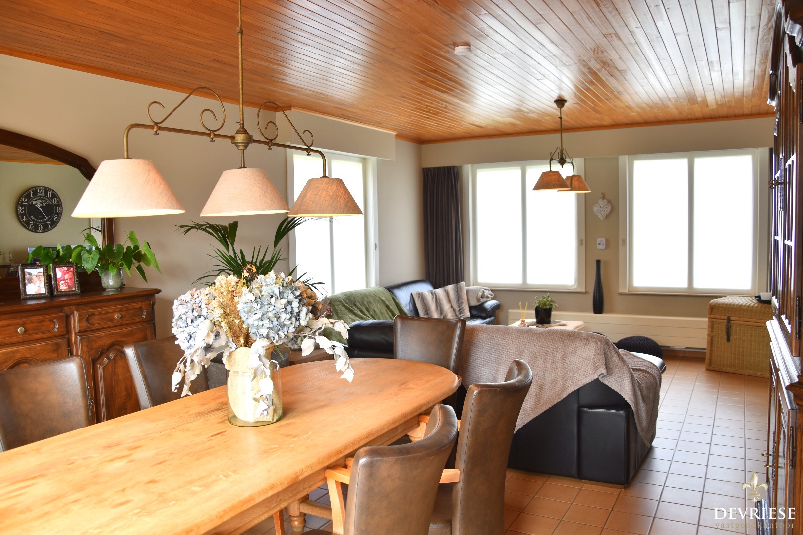 Inkomhal met gastentoilet en vestiaire, een gezellig ingerichte leefruimte en aanpalend de leefkeuken.