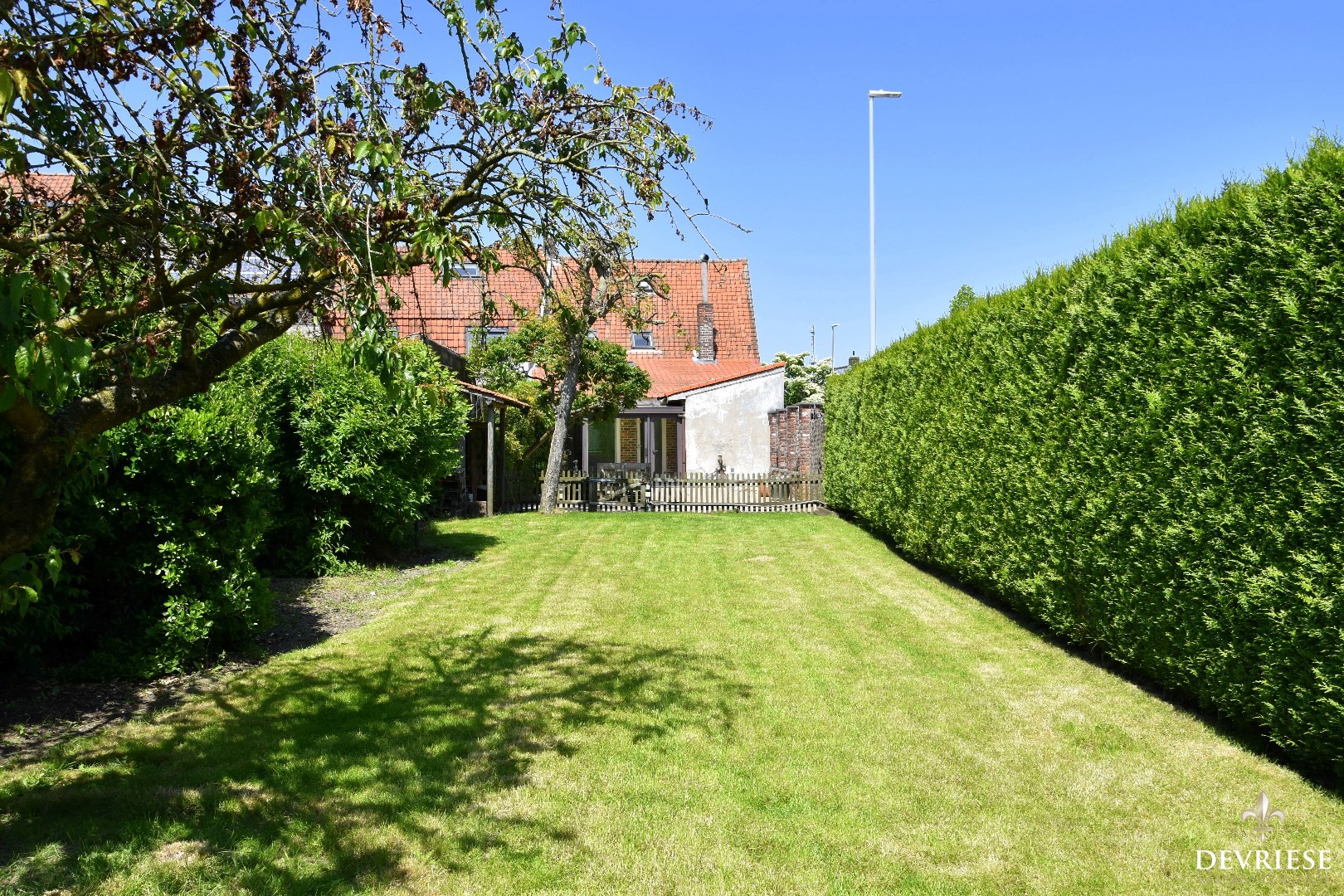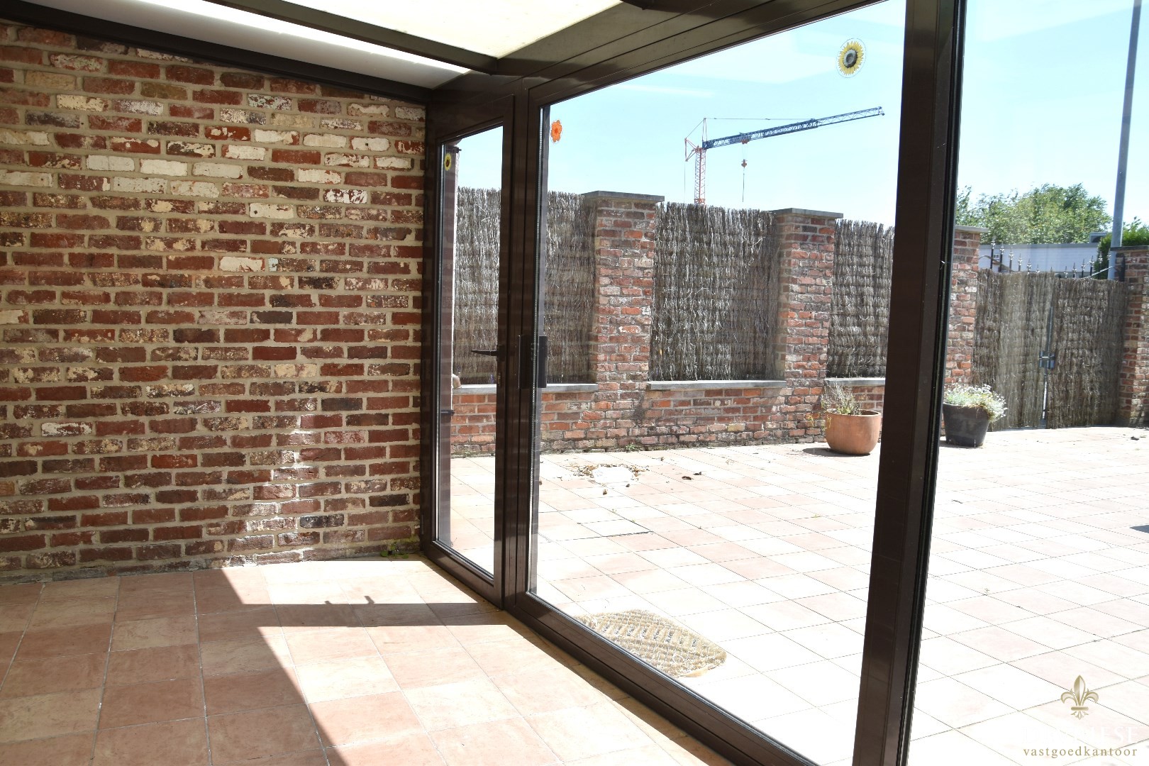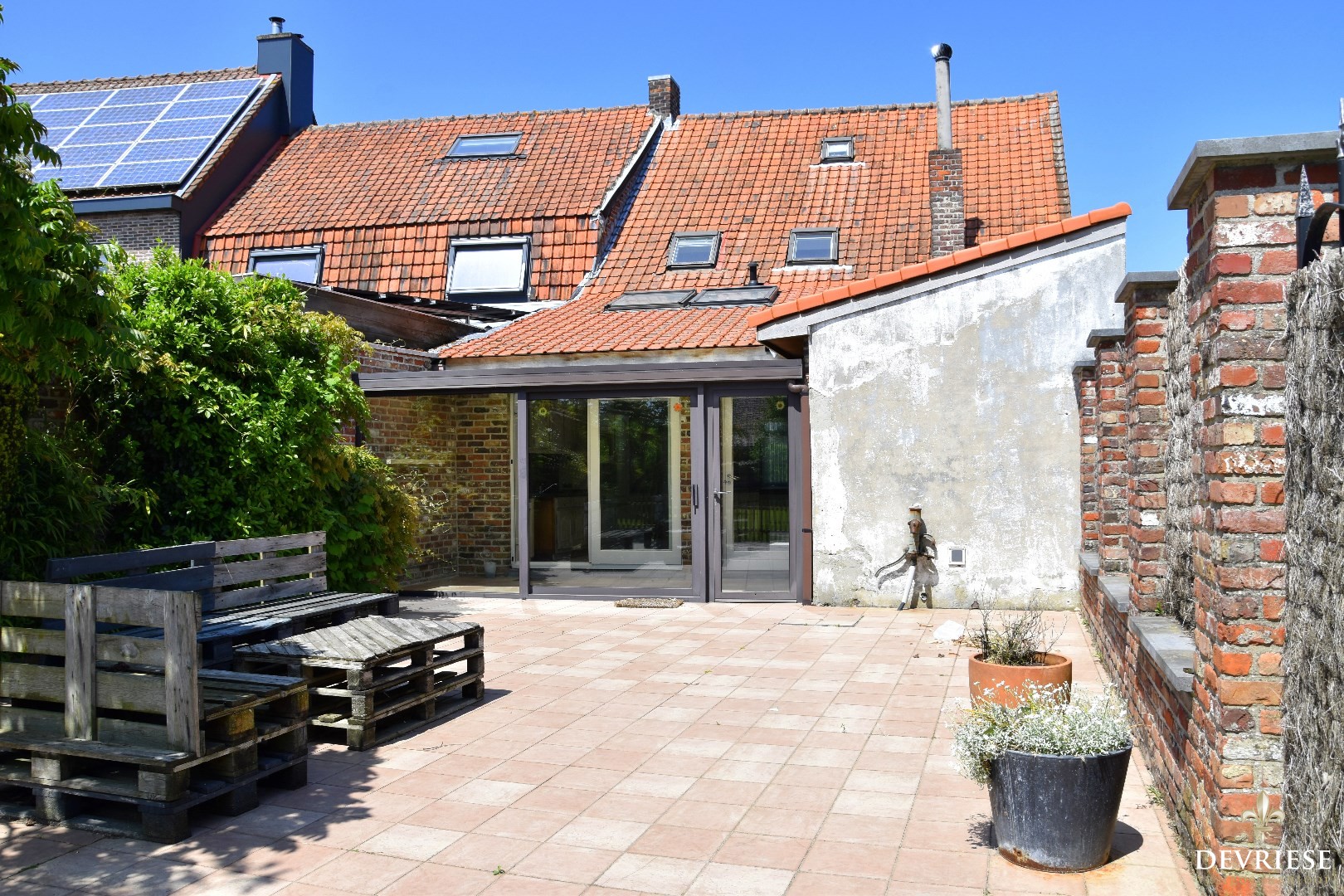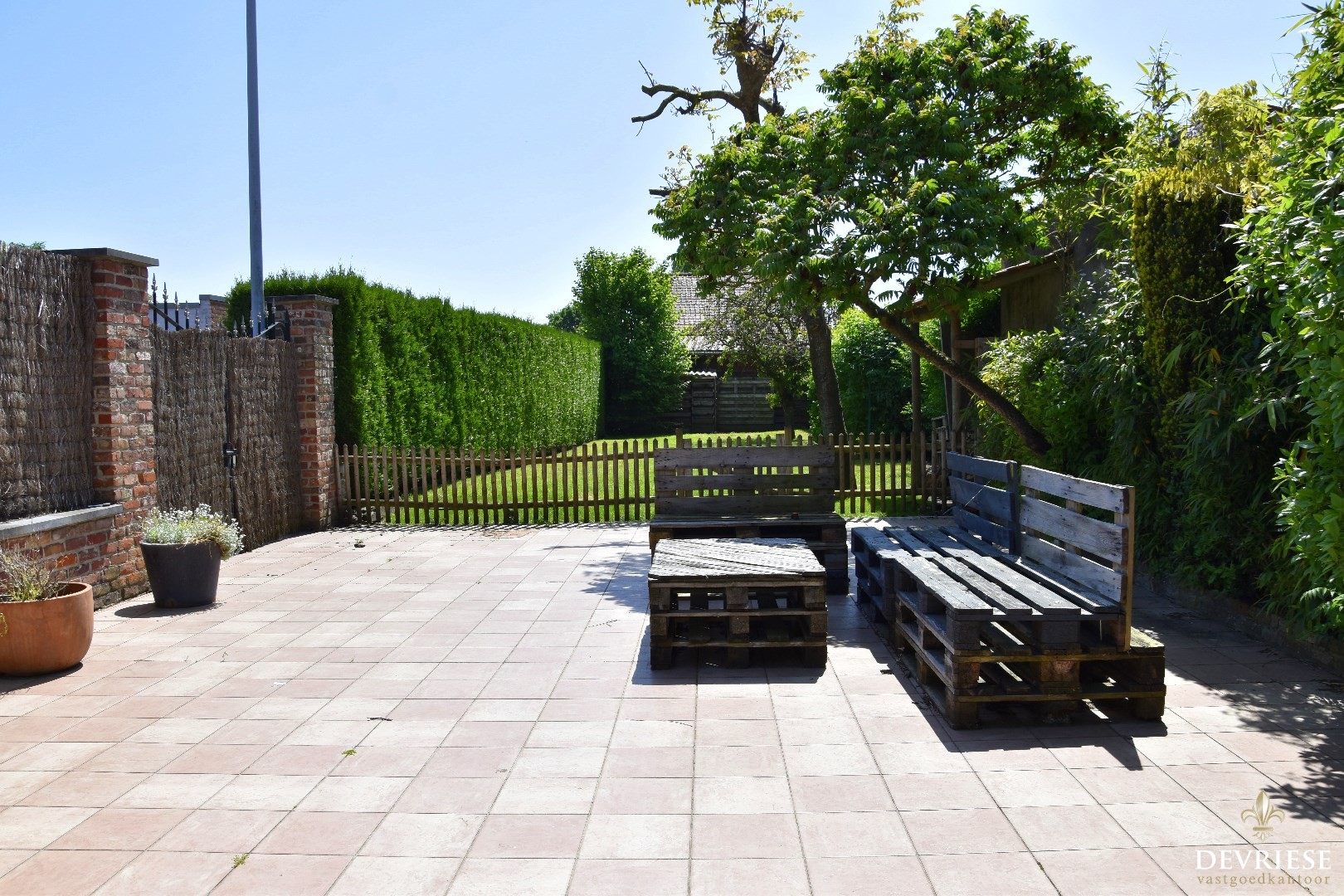 Veranda met uitkijk op de goed onderhouden tuin. Deze heeft een gunstige zuidoriëntatie en is eveneens bereikbaar via het zijpoortje.