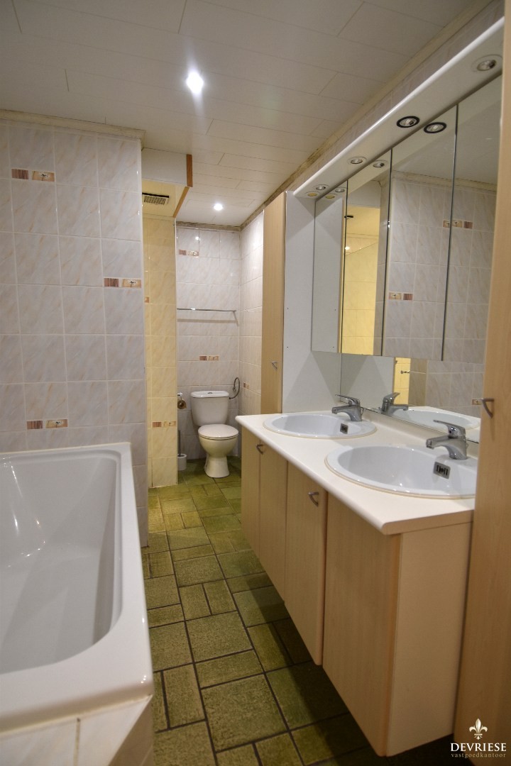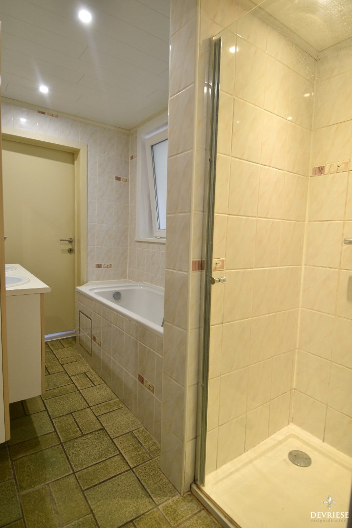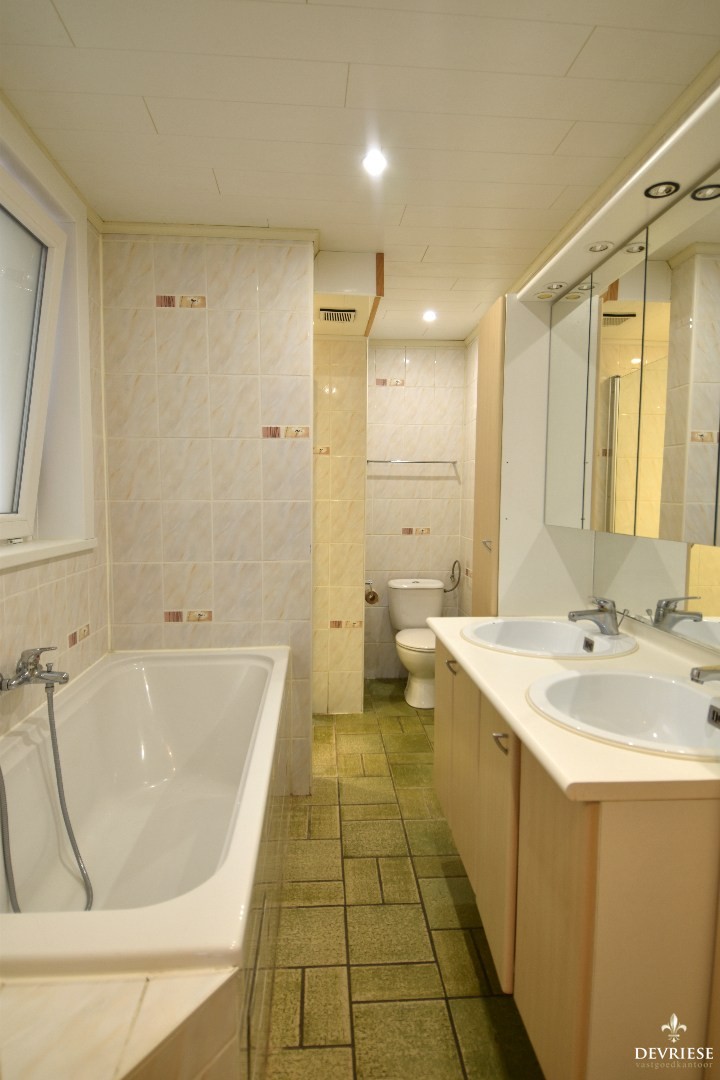 Op het gelijkvloers is er een badkamer uitgerust met een dubbel lavabomeubel, douchecel, ligbad en een toilet.