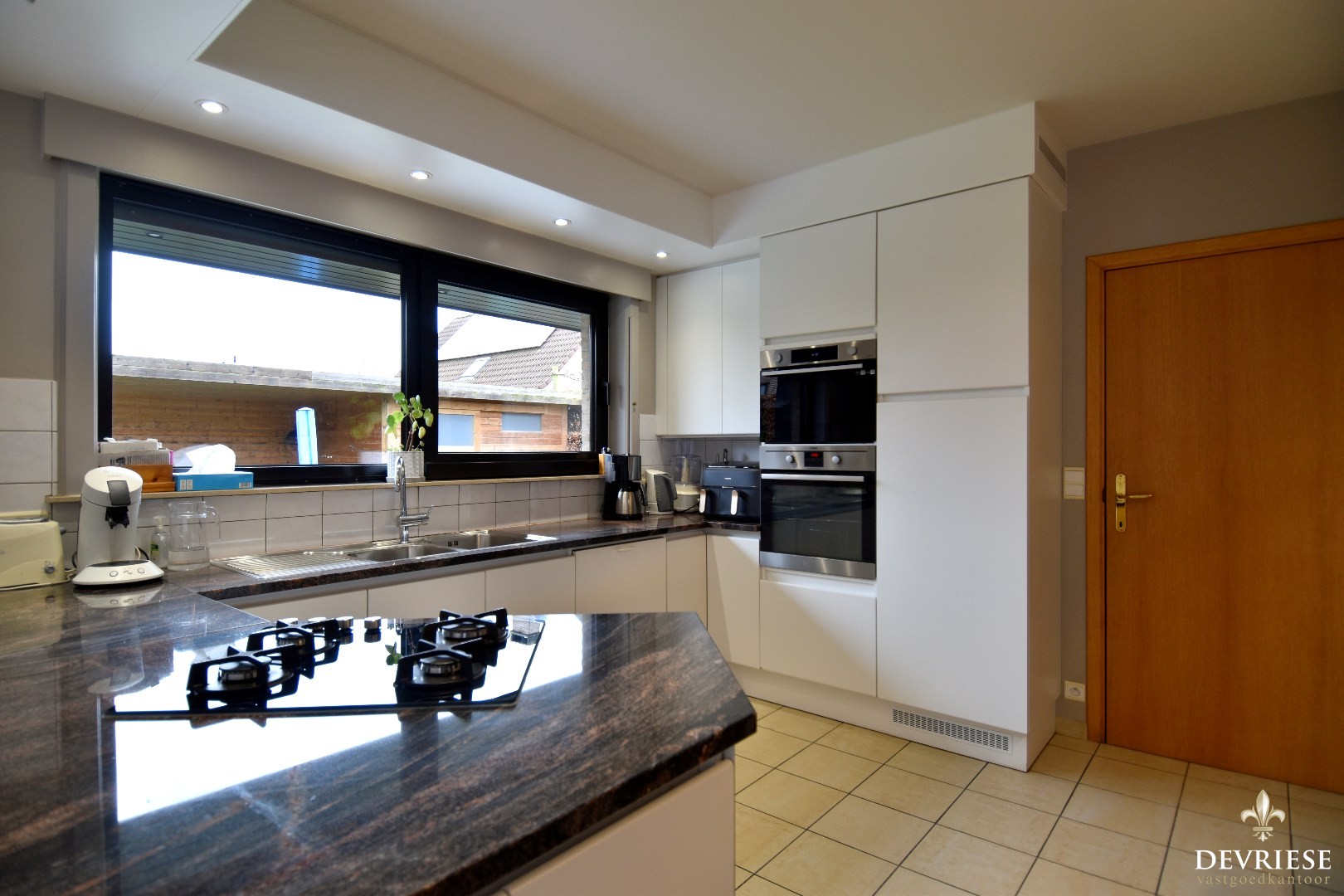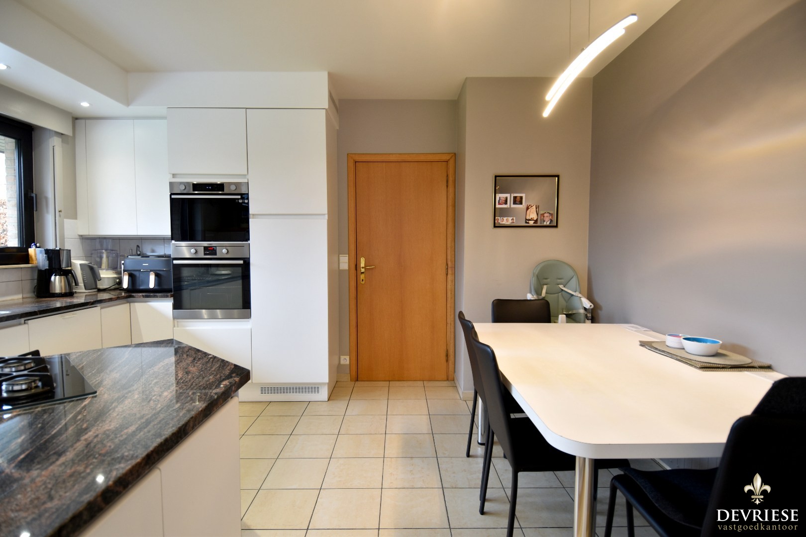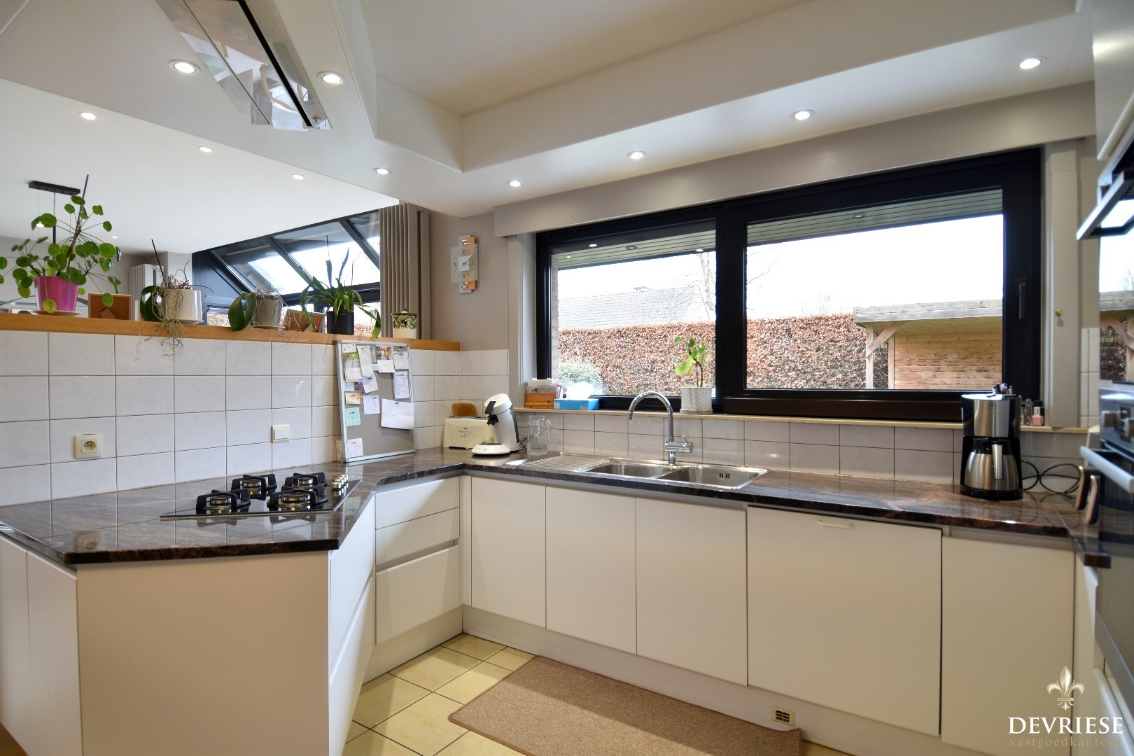 De volledig geïnstalleerde keuken beschikt over eveneens over een gezellige ontbijthoek. Aansluitend bevindt zich de praktische wasplaats met extra bergruimte en een inpandige garage met sectionaalpoort.